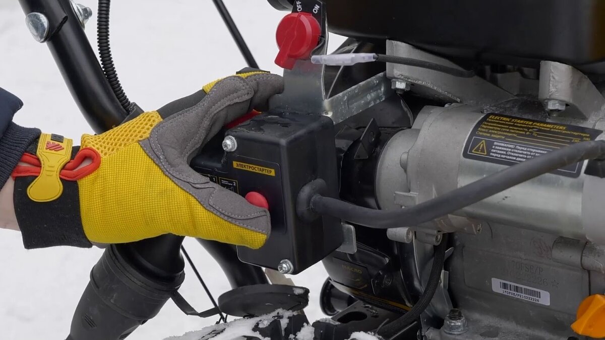 При использовании электростартера подключаем сетевой удлинитель к штепсельной вилке, нажимаем кнопку и удерживаем ее в течение 3-5 секунд. Как только двигатель запустится кнопку нужно отпустить.