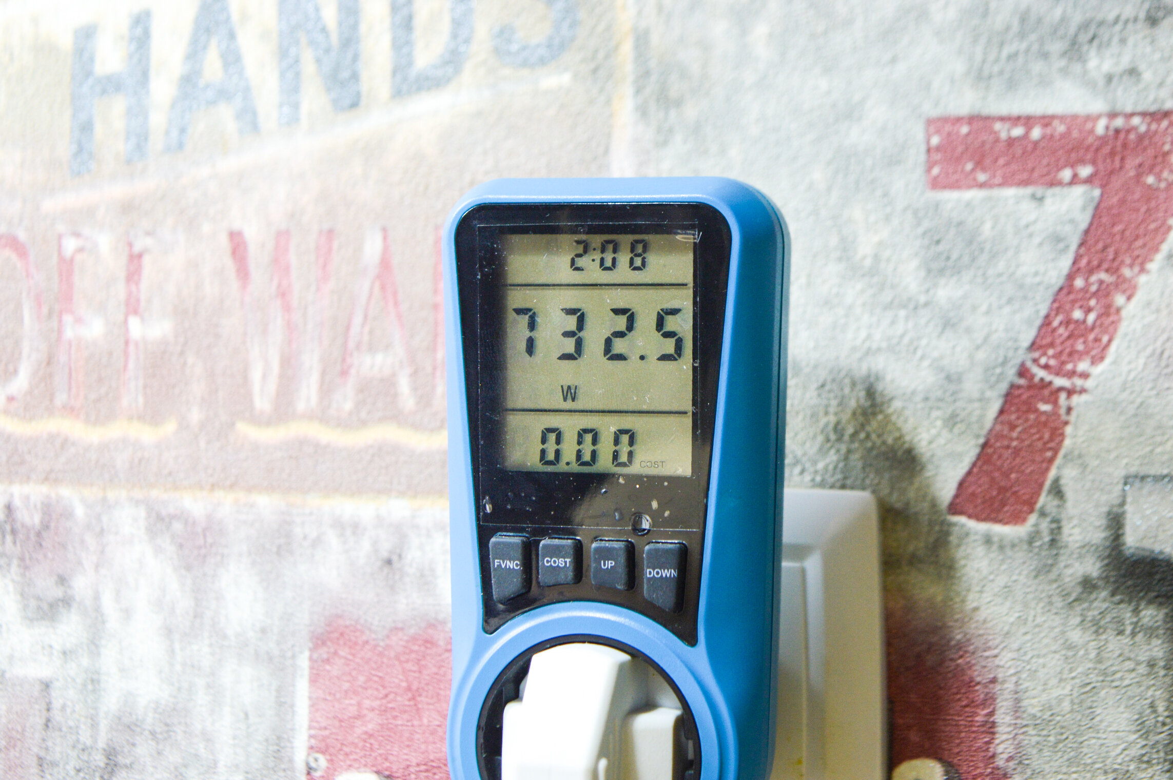 После подключения инструмента к электрической сети и включения первого режима работы в 50 градусов загорается светодиодный индикатор и Denzel DWP-750 начинает работать. При этом потребляемая мощность чуть ниже заявленной производителем и составляет 732 Вт.