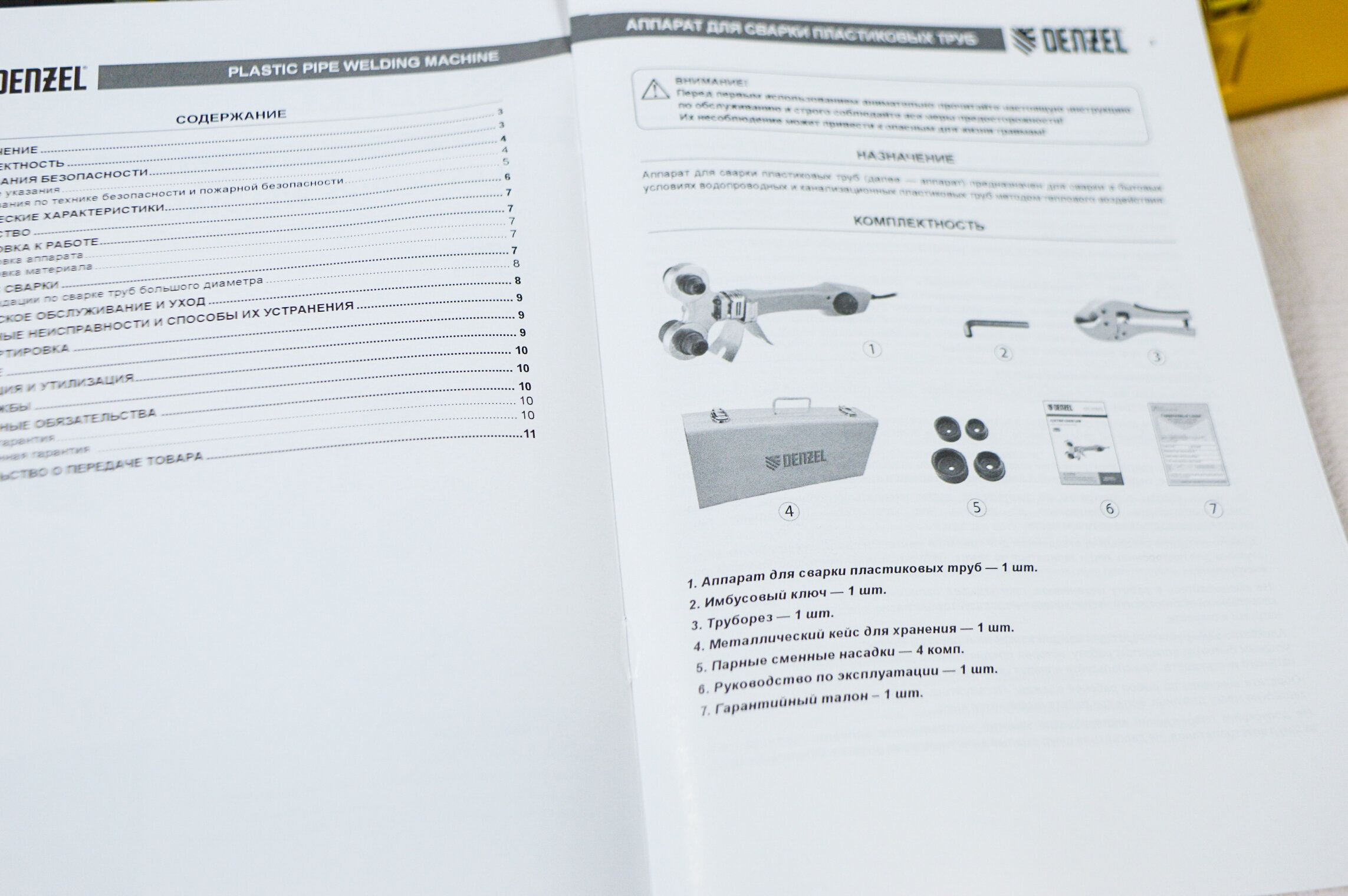 В комплект поставки входит удобный металлический кейс с металлическими зажимами, сварочный аппарат, металлическая подставка, металлические ножницы для резки труб, сменные насадки, винты и шестигранник. Кроме того, руководство пользователя и гарантийный талон.