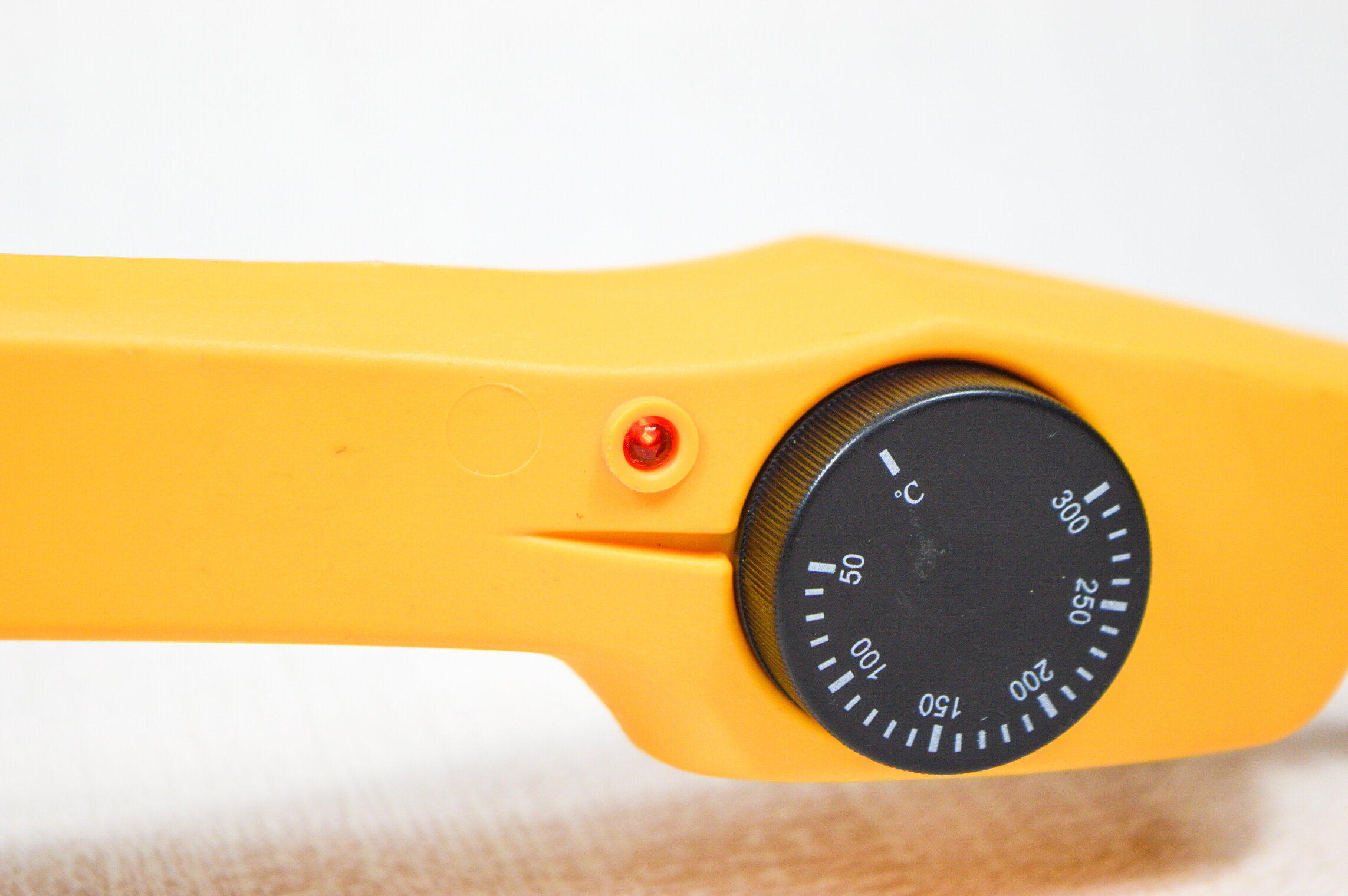Сварочный аппарат имеет пластиковую ручку окрашенную в фирменный желтый цвет. На ручке располагается регулятор выбора температуры и светодиодный индикатор. Ручка хоть и не имеет явно выделяющегося рельефа, но все же удобно лежит в руке, что действительно удобно при работе в труднодоступных местах.