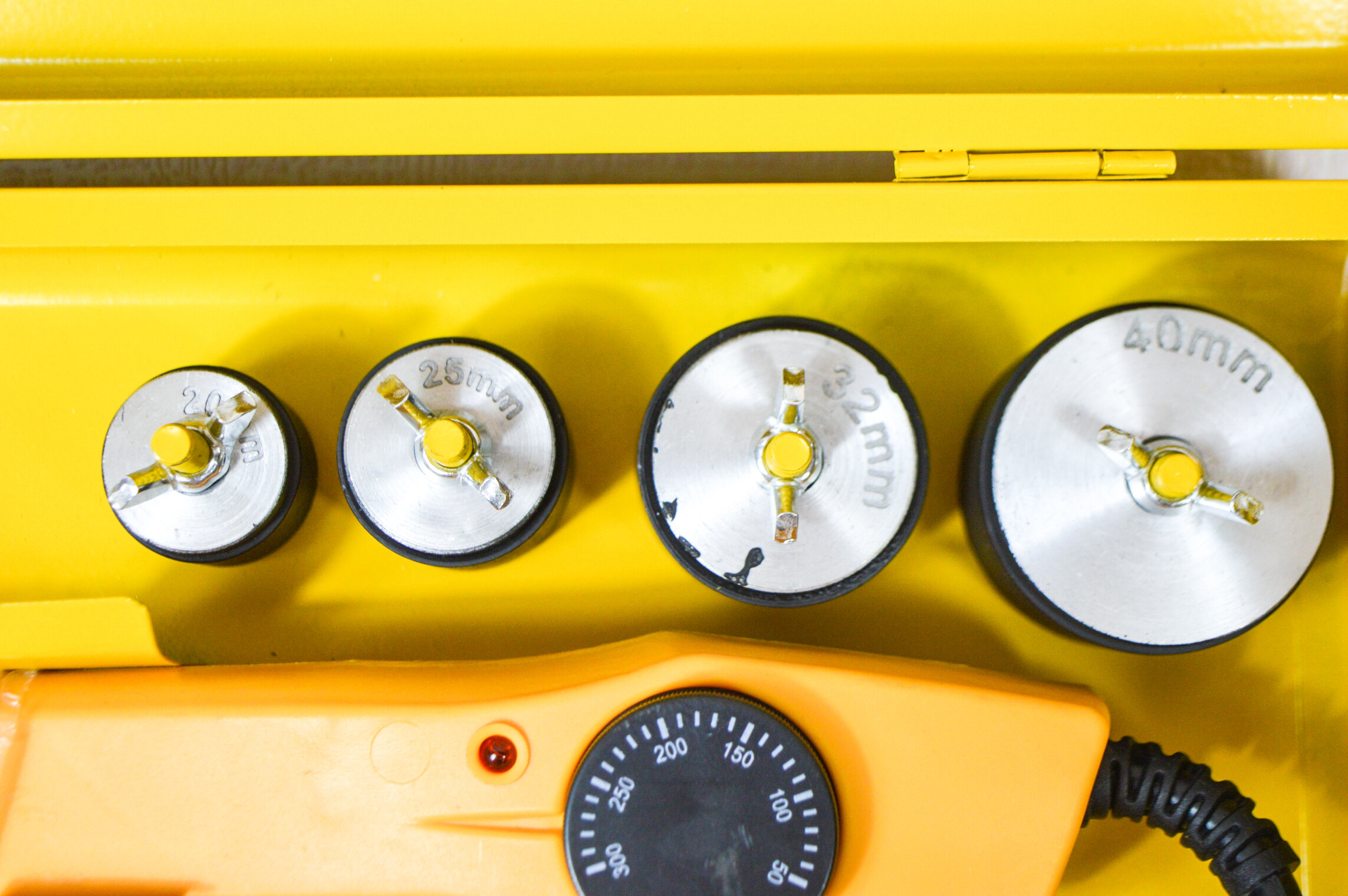 Насадки поставляются 4 размеров и надежно закреплены внутри кейса. На каждой насадке гравировкой выведен под какой диаметр трубы она предназначена. Каждая насадка покрыта тефлоновым (антипригарным) покрытием для защиты от случайного прилипания пластика во время работы. На гильзе присутствует латунная вставка оберегающая собранную конструкцию от повреждения во время нагрева. Наружная часть насадок имеет совершенно гладкую ровную поверхность максимально прилегающую к рабочей нагревающейся области сварочника.