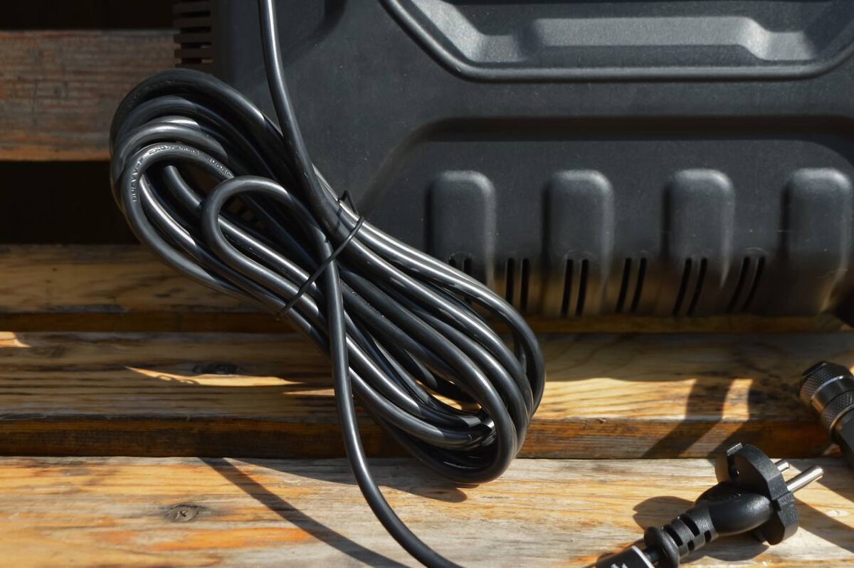 С другой стороны корпуса в кармане находится провод питания длиной 5 метров, что позволяет подключать компрессор к электрической сети и при этом спокойно перемещаться для проведения работ. Провод в мягкой изоляции.