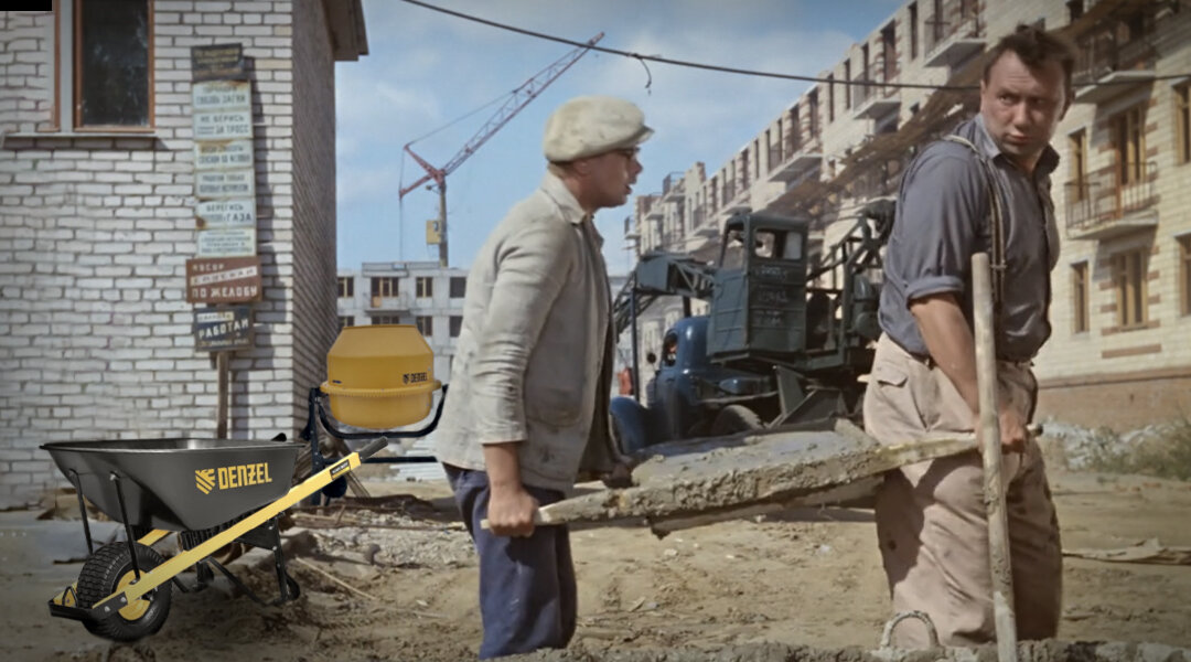 Будь они на строительный площадке в наши дни, то у Феди было бы меньше возможностей выводить из себя нашего героя. Ведь из бетоносмесителя Denzel удобно выливать цемент одному, а с тачкой грузоподъемностью 230 кг можно доставить раствор в нужное место без помощи напарника.
