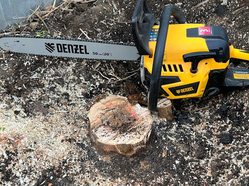 Это нужно для того, чтобы не повредить цепь бензопилы о песок и землю. С помощью бензопилы срезаем пень ниже уровня земли, можно конечно и не срезать, но так будет лучше.