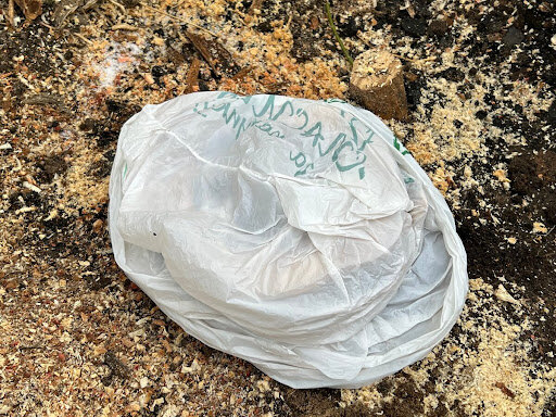Ну и финальный штрих, накрываем пень пакетом и обтягиваем канцелярской резинкой, а затем засыпаем землей и забываем про пень.