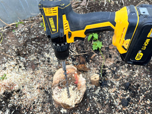 С помощью шуруповерта и шнекового сверла по дереву делаем отверстия, чем глубже, тем лучше.