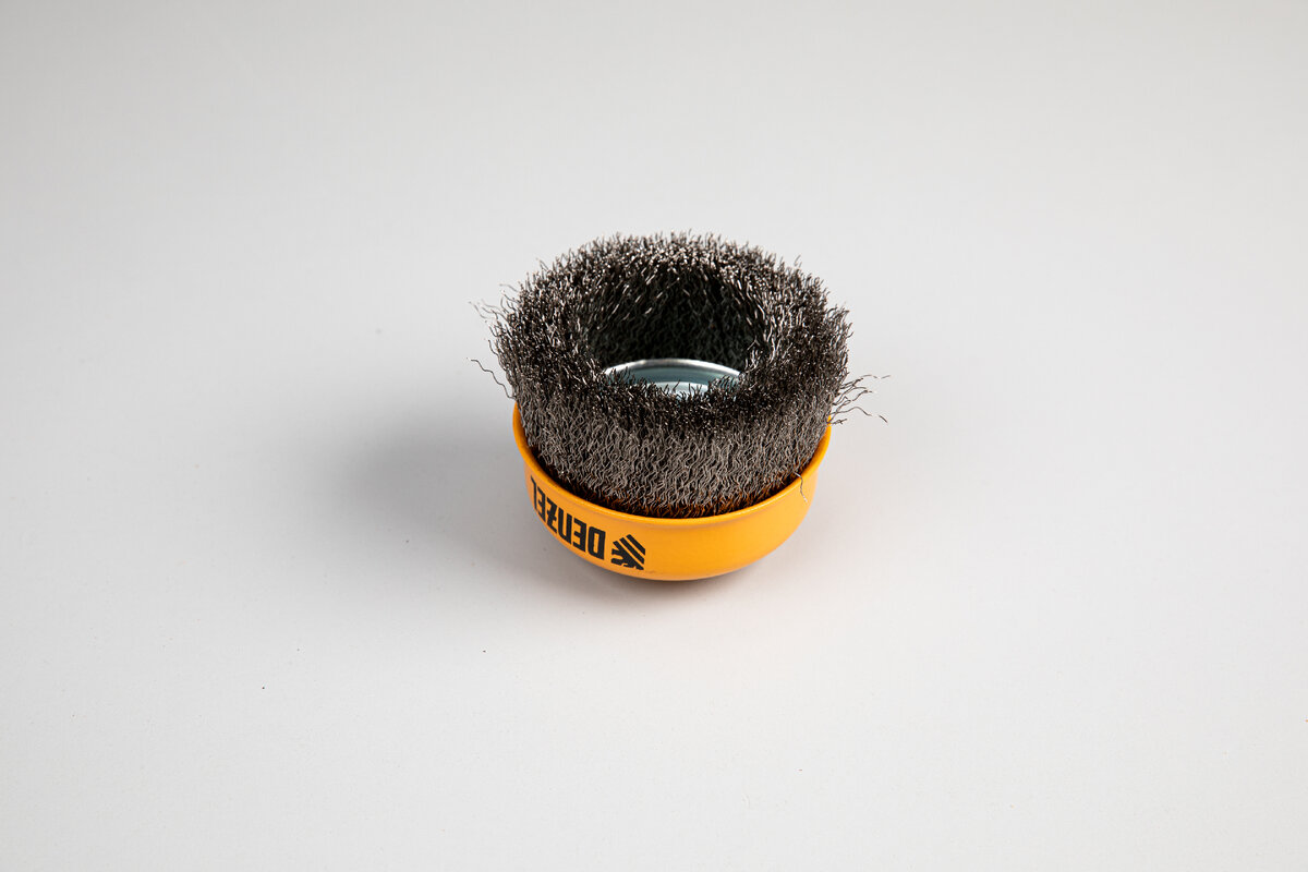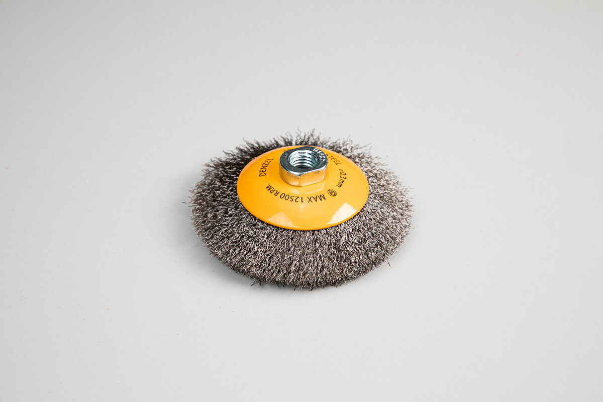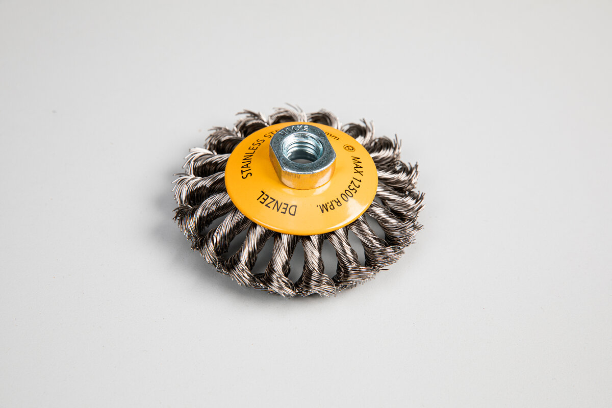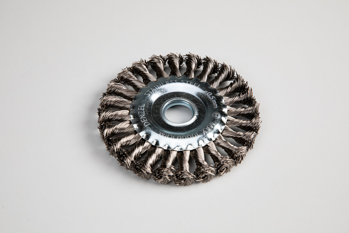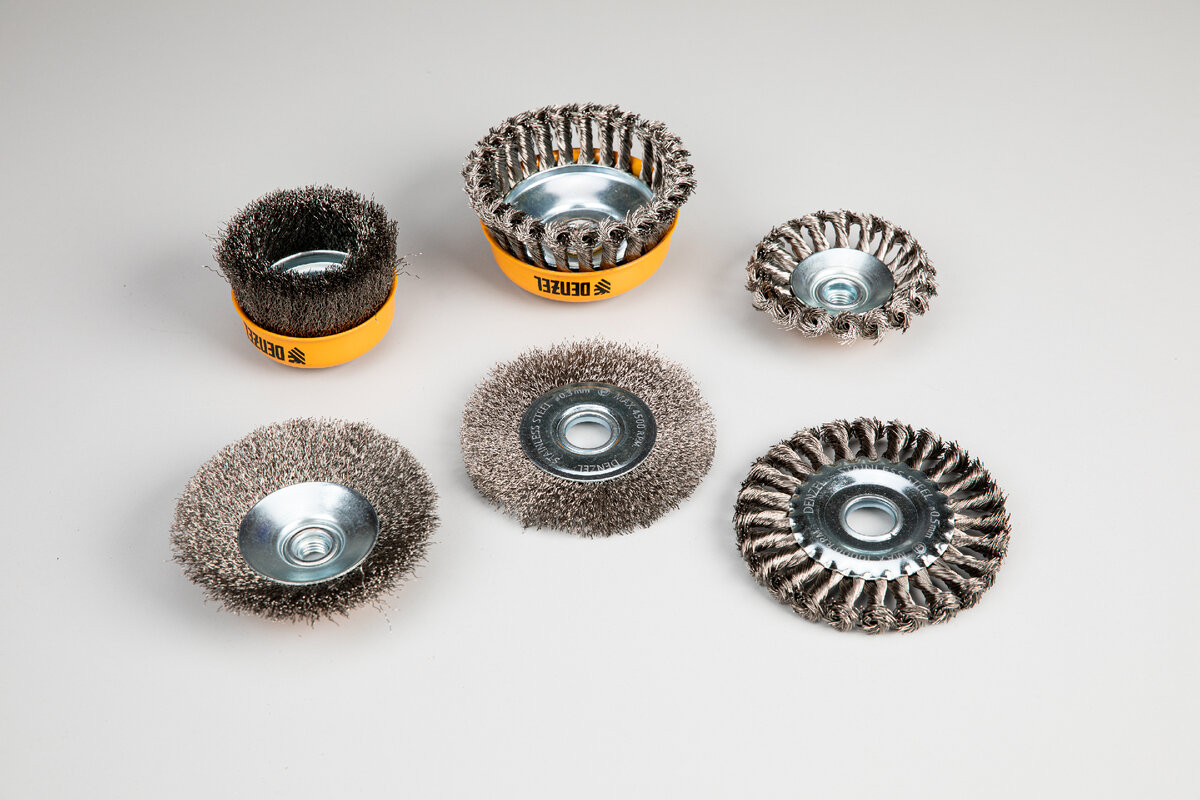 Denzel предлагает зачистные щетки плоской, чашеобразной и тарельчатой формы разных диаметров с витой или крученой щетиной из нержавеющей стали. Щетки подходят для профессиональных работ. Ими можно работать в том числе и во влажную погоду.