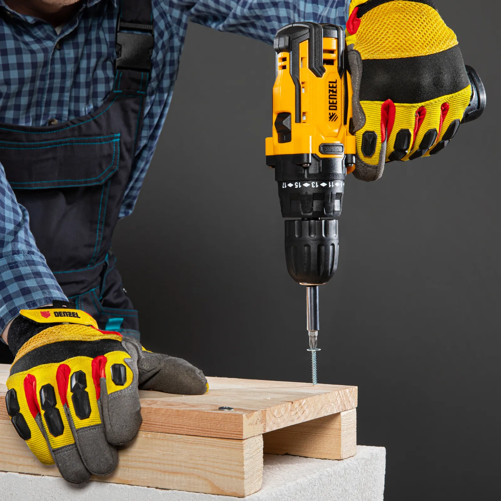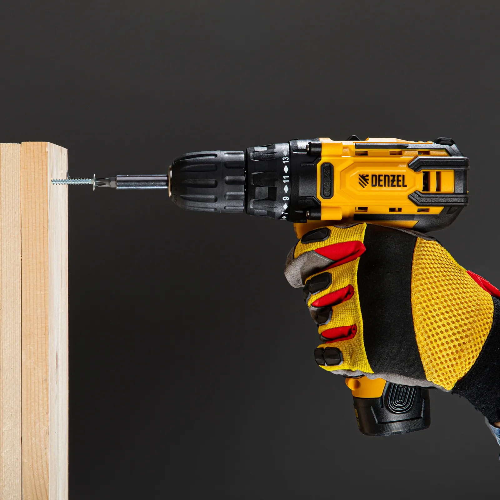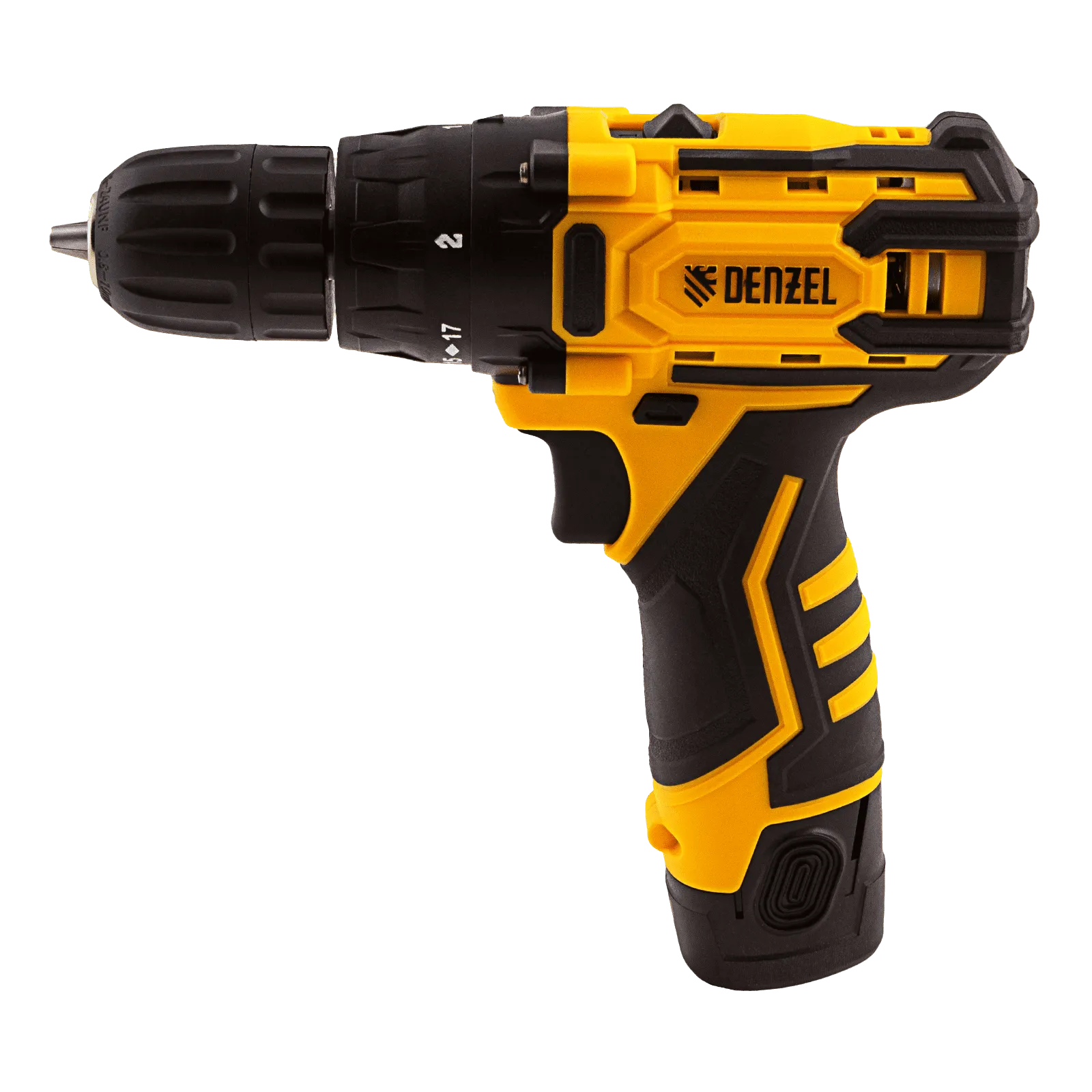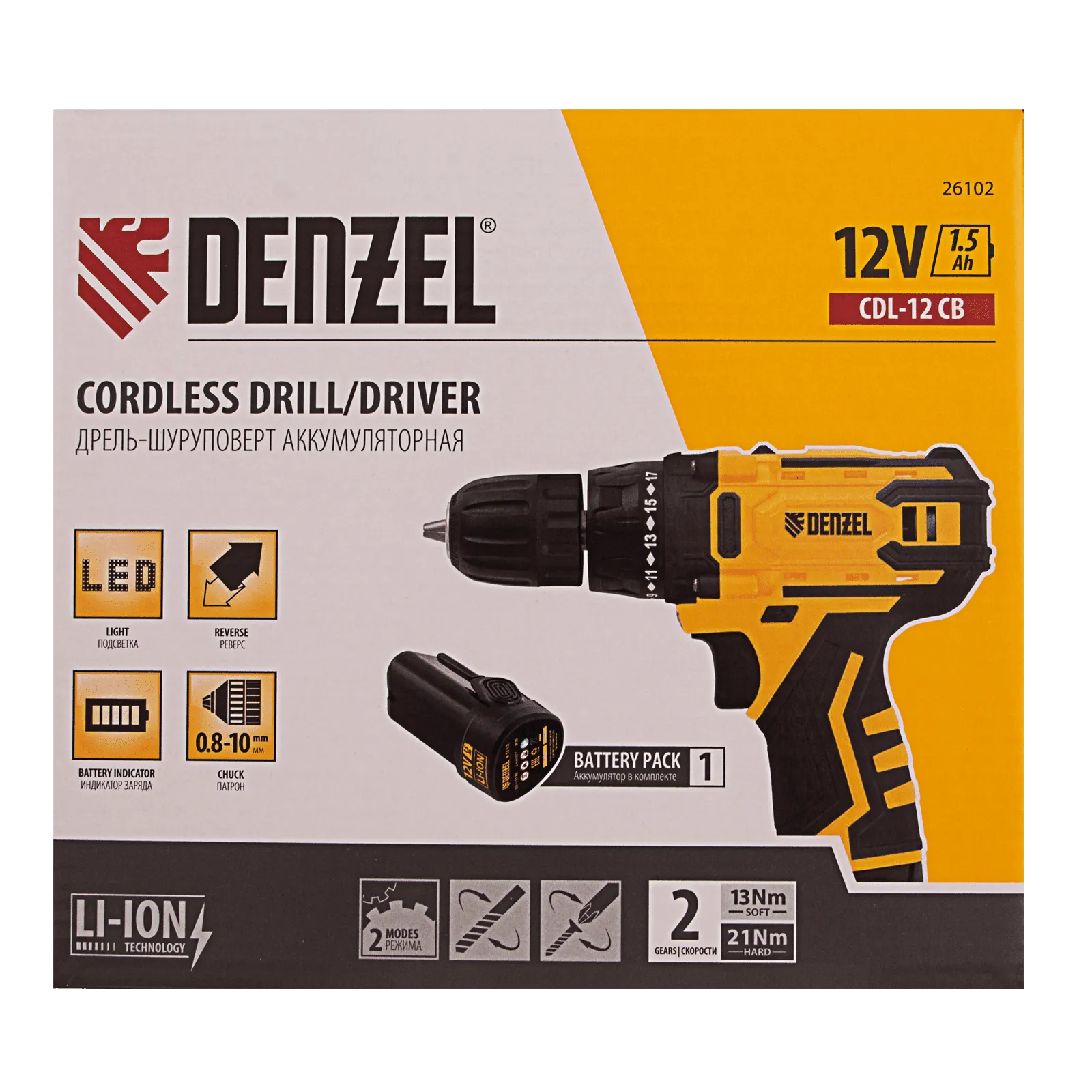 Аккумуляторная дрель-шуруповерт Denzel CDL-12CB 26102 с батареей Li-Ion 12 В предназначена для монтажа и демонтажа резьбовых соединений, сверления отверстий в металле (до 10 мм), древесине (до 16 мм), пластмассе и других материалах. Инструмент пригодится профессионалам и любителям на строительной площадке, дома или на даче.;Надежный литий-ионный аккумулятор без эффекта памяти обеспечивает долгий срок службы инструмента. Дрель не зависит от сети питания, что делает удобной работу на строительных объектах, на высоте и в отдаленных участках дома.