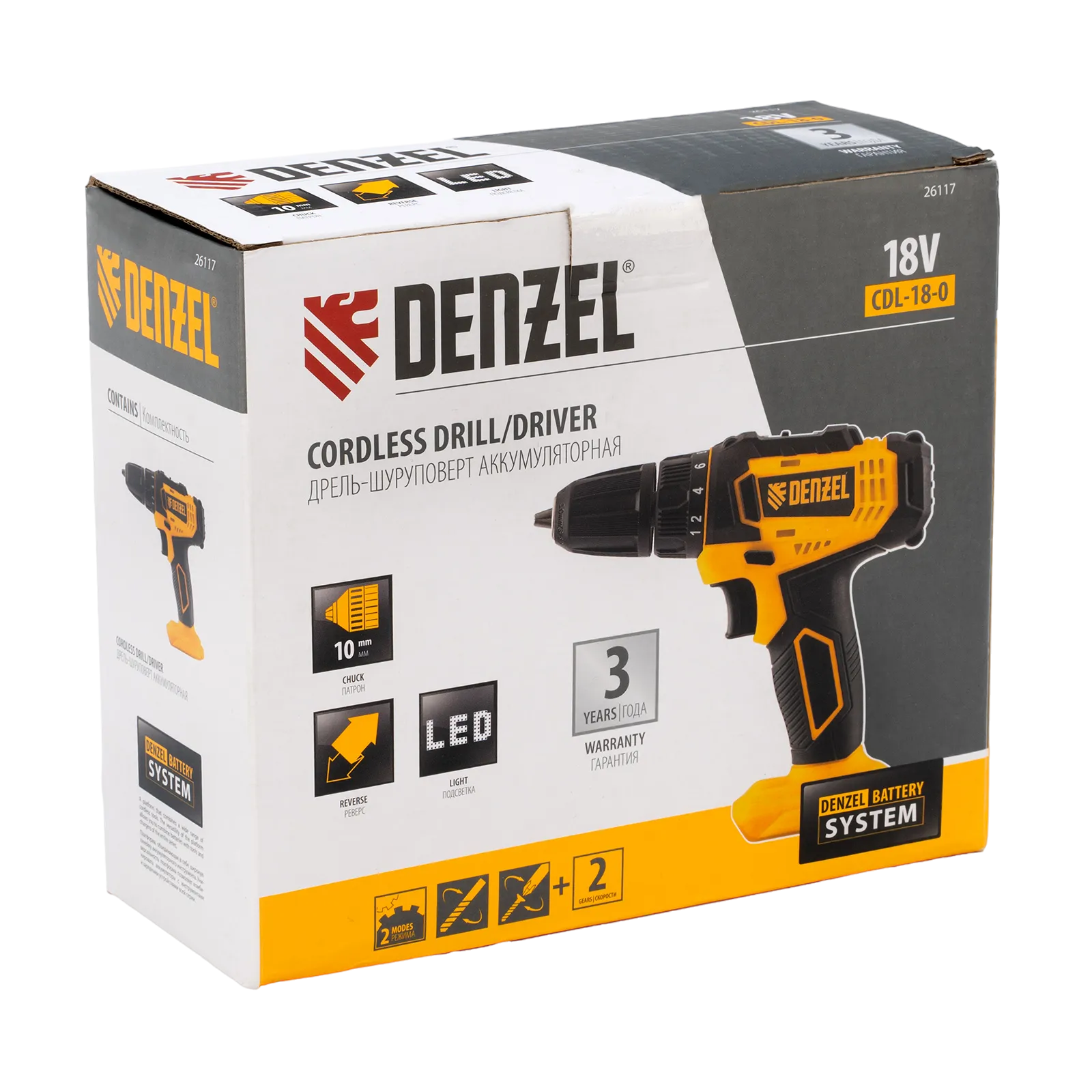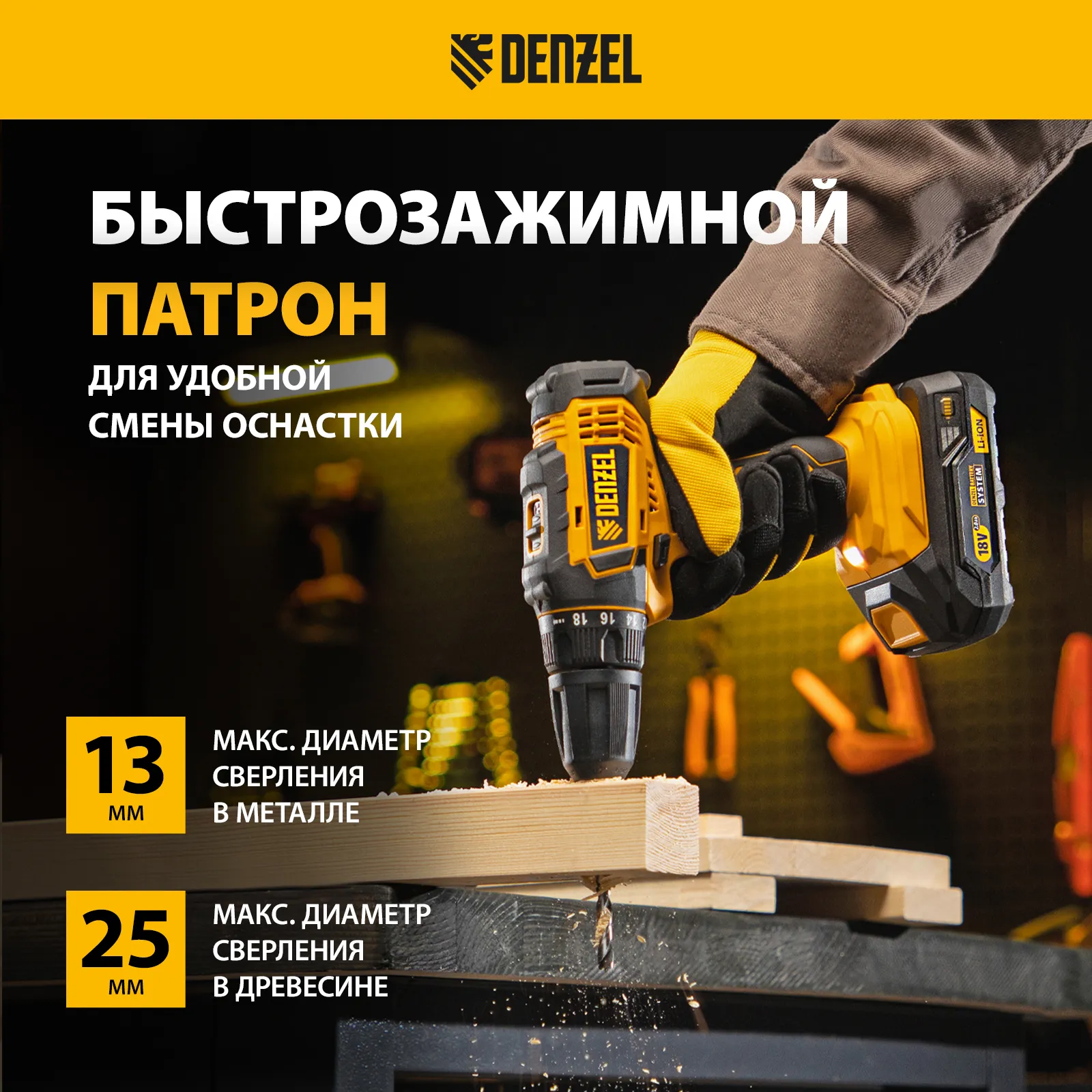 - Универсальность — дрель-шуруповерт совместима с любым Li-Ion аккумулятором единой платформы Denzel Battery System 18V.