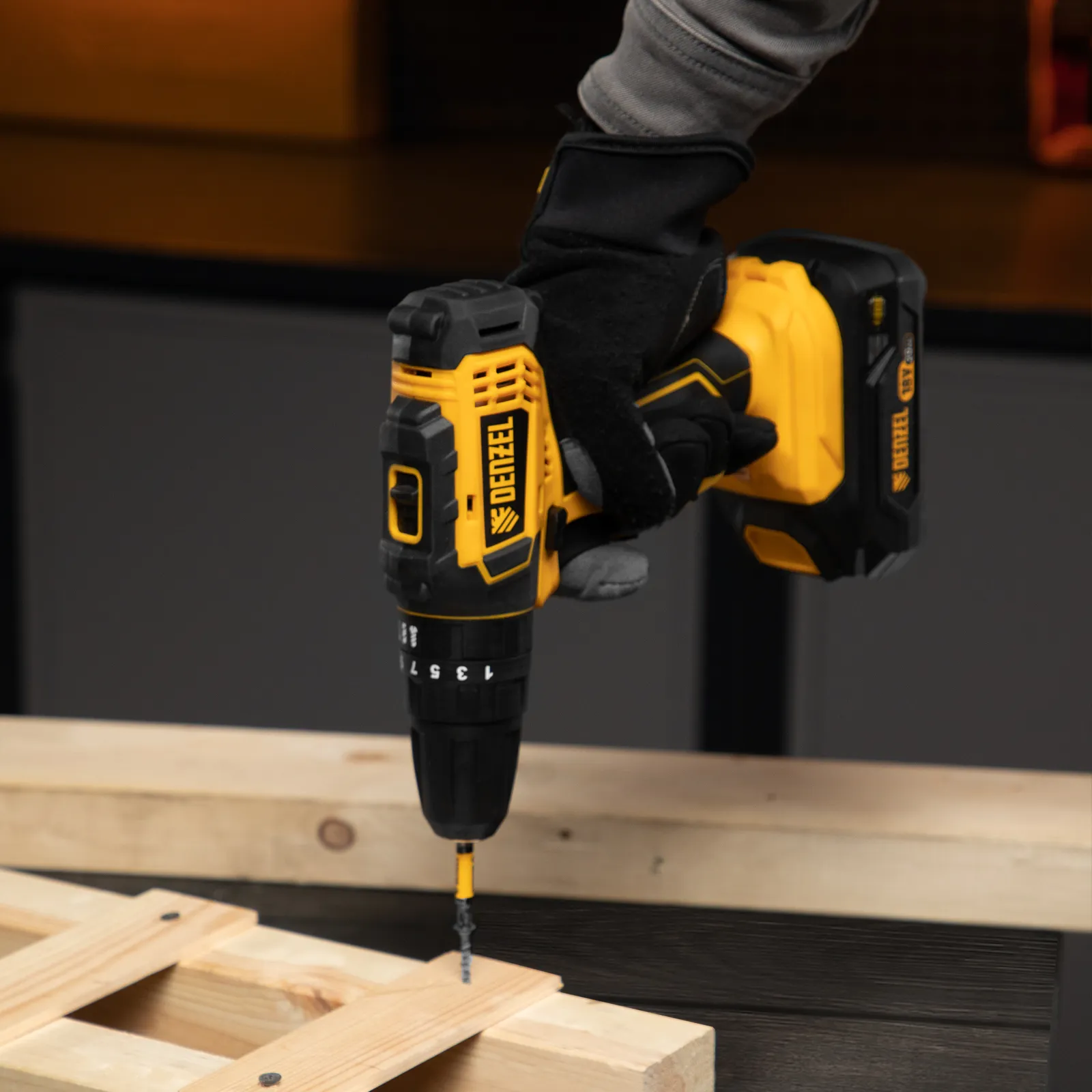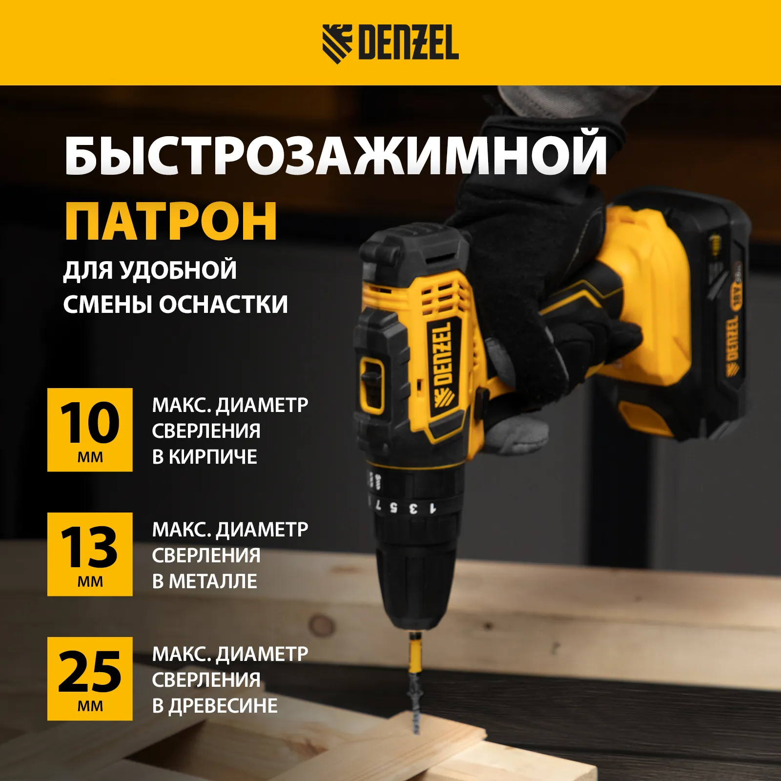- Универсальность — дрель-шуруповерт совместима с любым Li-Ion аккумулятором и зарядным устройством единой платформы Denzel Battery System 18V.