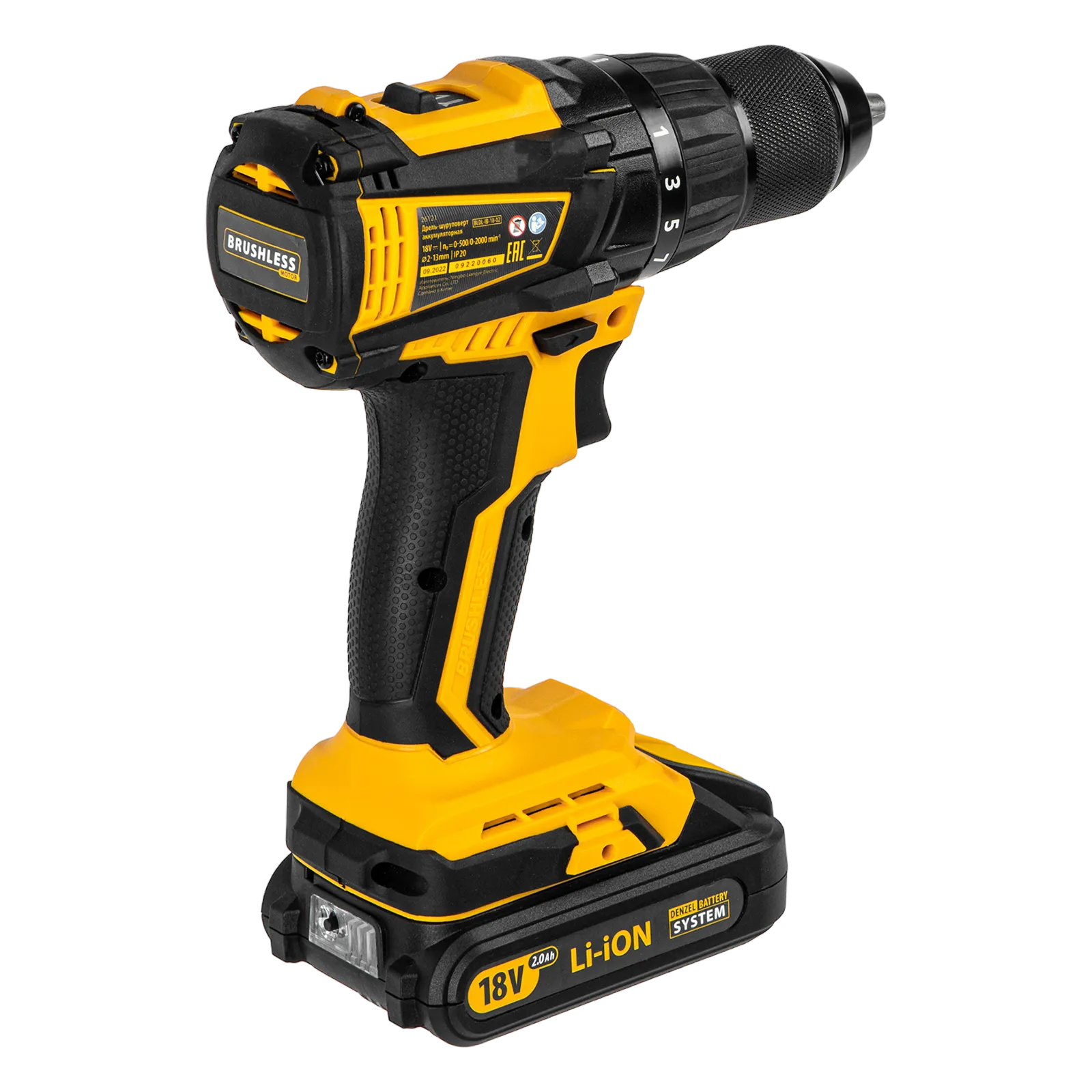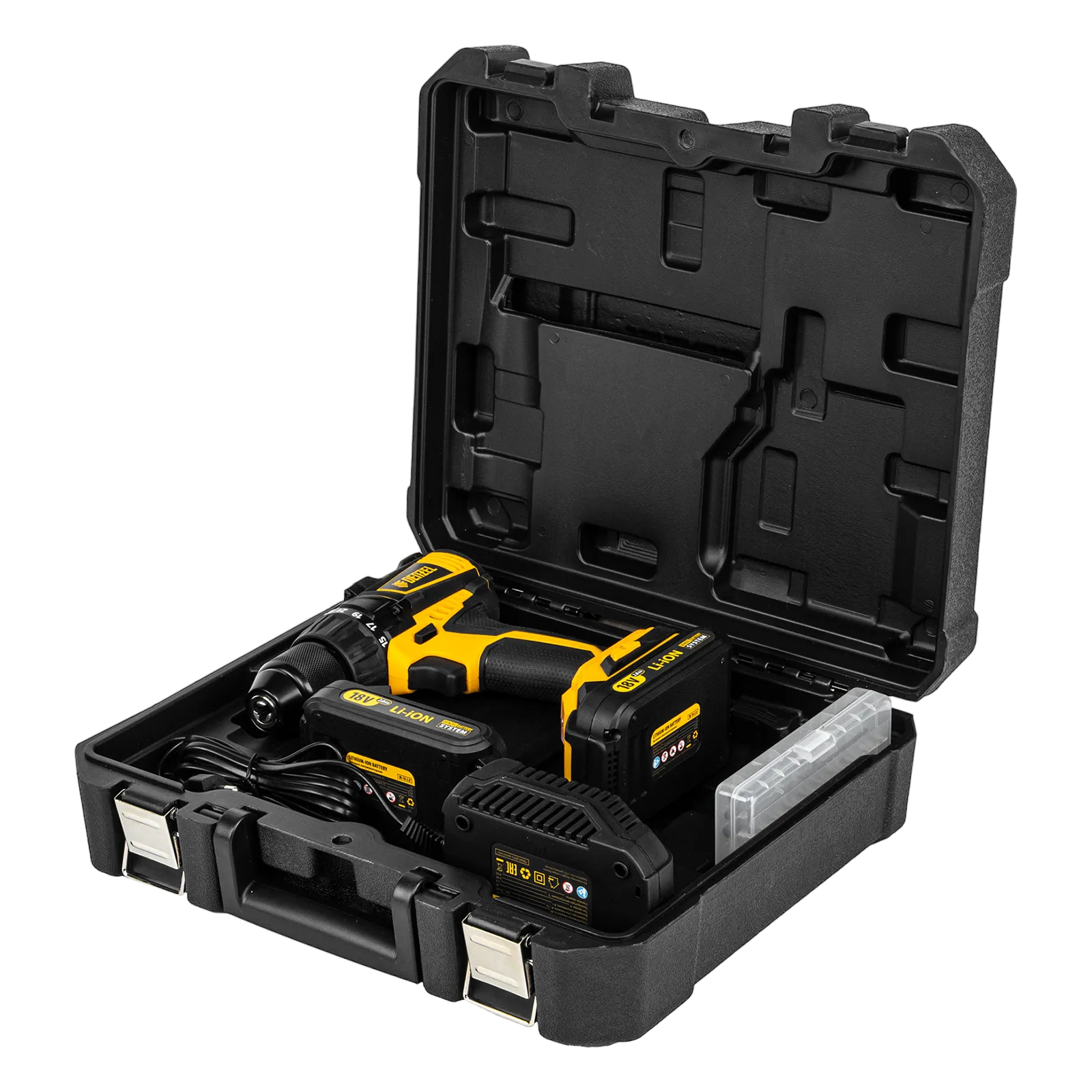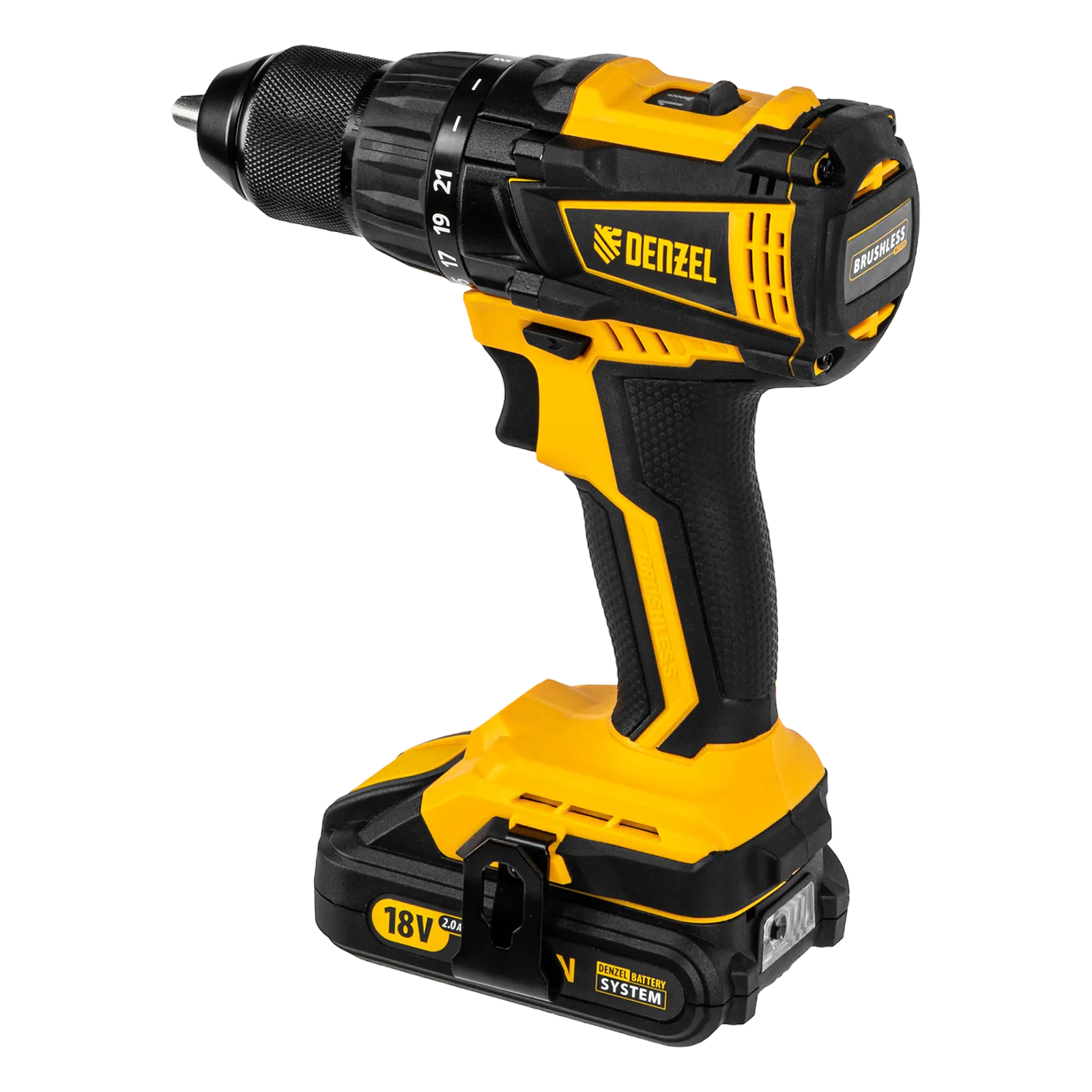Бесщеточная аккумуляторная дрель-шуруповерт Denzel BLDL-IB-18-02 26121 с 2 батареями 2 Ач Li-Ion на 18 В используется для выполнения большого спектра работ. Благодаря мощному бесщеточному двигателю, позволяющему развивать крутящий момент 65 Н·м, имеет КПД на 20-30% больше, чем у коллекторных дрелей. Инструмент легко справляется с закручиванием и откручиванием винтов, шурупов, саморезов, а также сверлением древесины, пластика, металла и размешиванием легких строительных смесей. Сверлит отверстия диаметром до 13 мм в металле и до 25 мм в древесине.