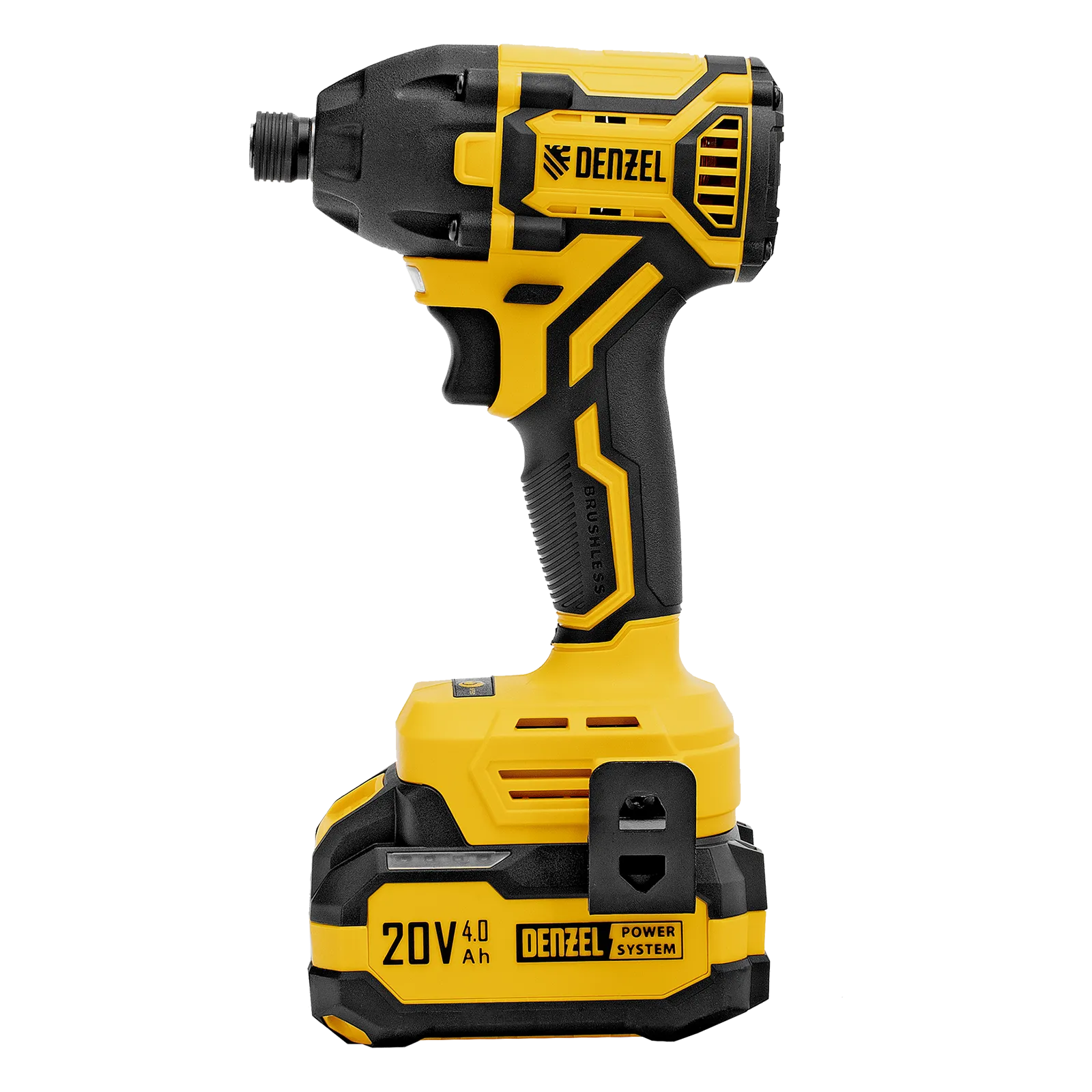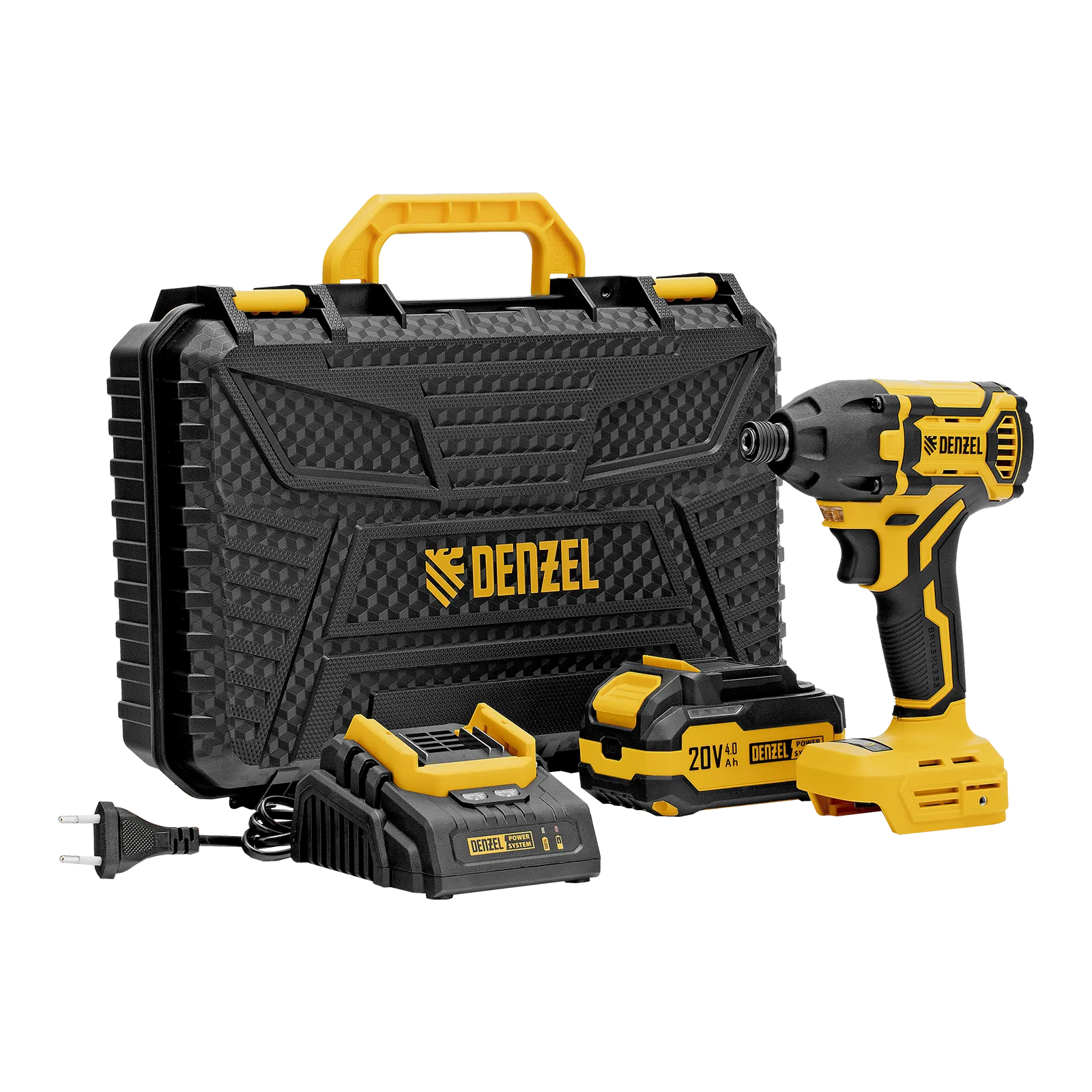 - Универсальность — аккумулятор Li-Ion емкостью 4 А·ч совместим со всеми инструментами единой платформы Denzel Power System 20V.