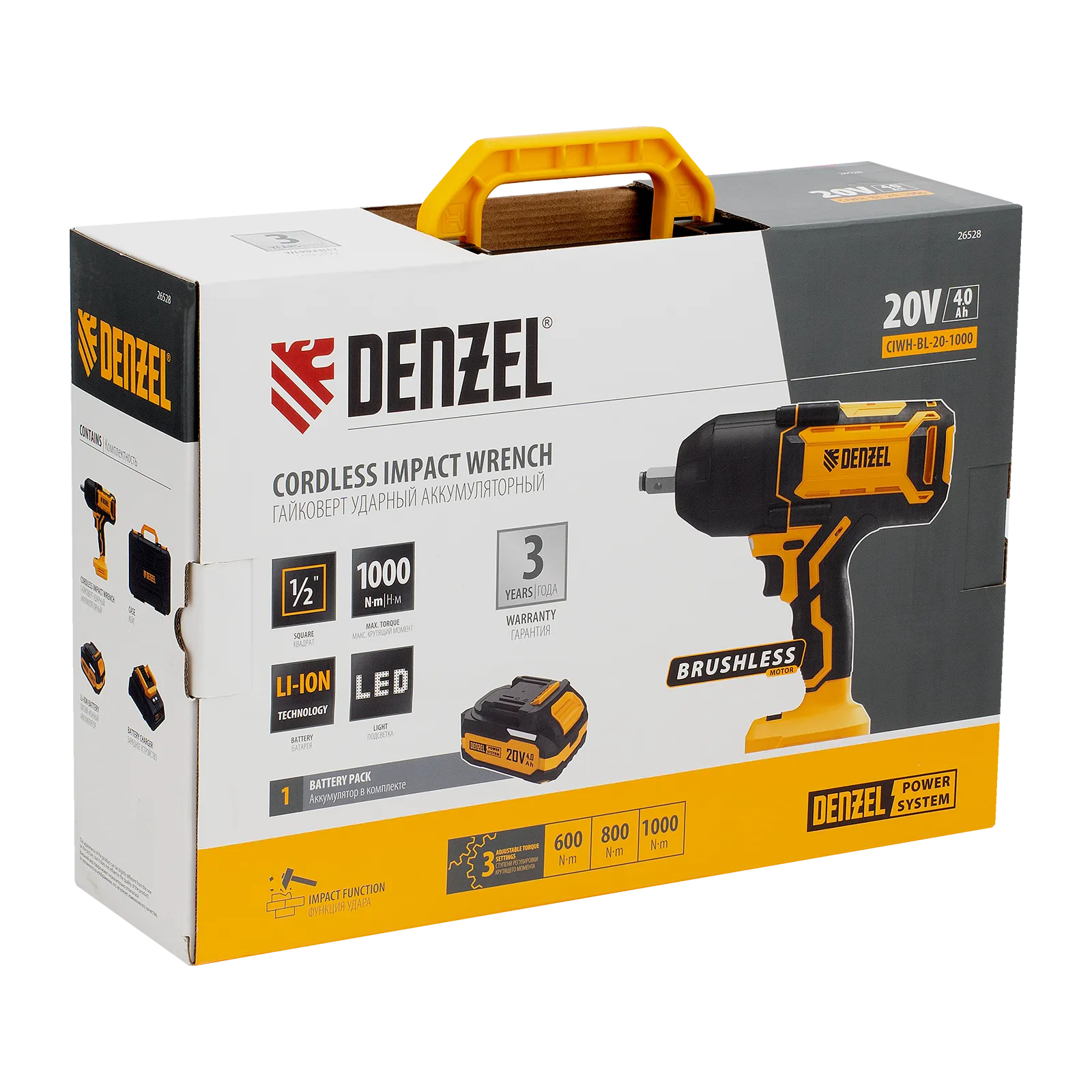 - Универсальность — аккумулятор Li-Ion емкостью 4 А·ч совместим со всеми инструментами единой платформы Denzel Power System 20V.