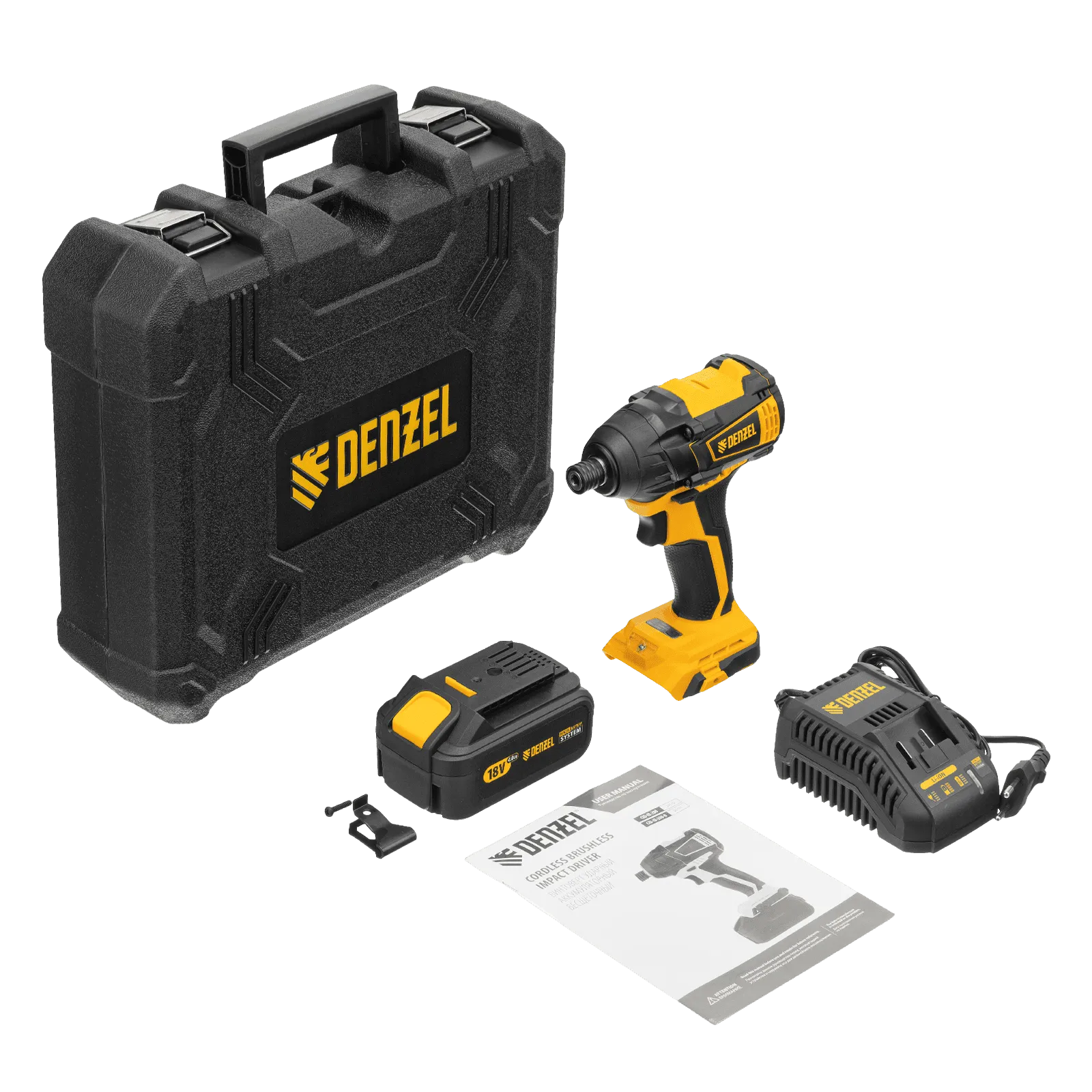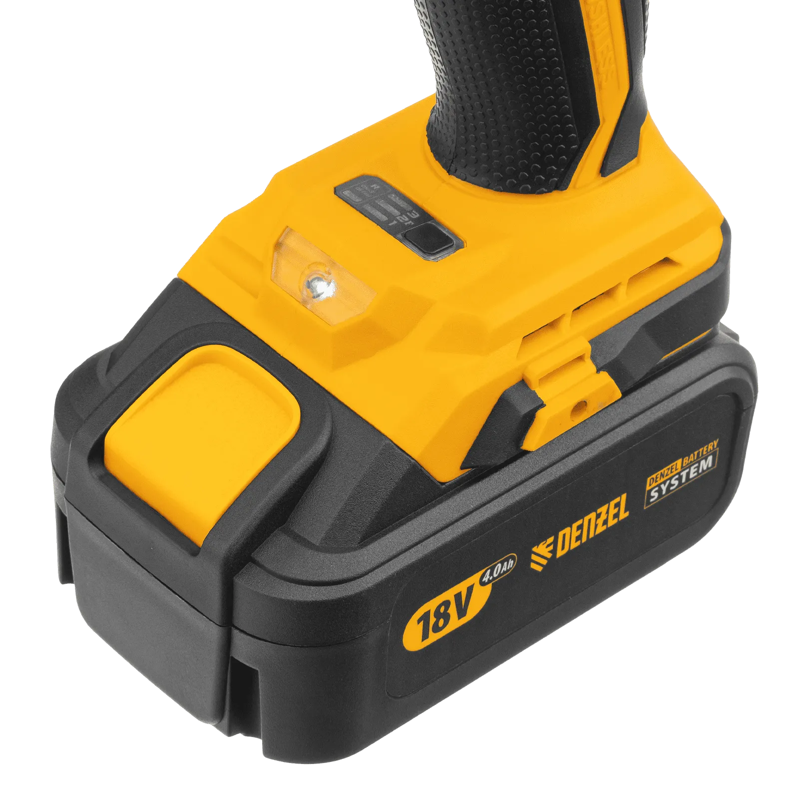 - Универсальность — к инструменту подойдут любые 18 В аккумуляторы Denzel battery system