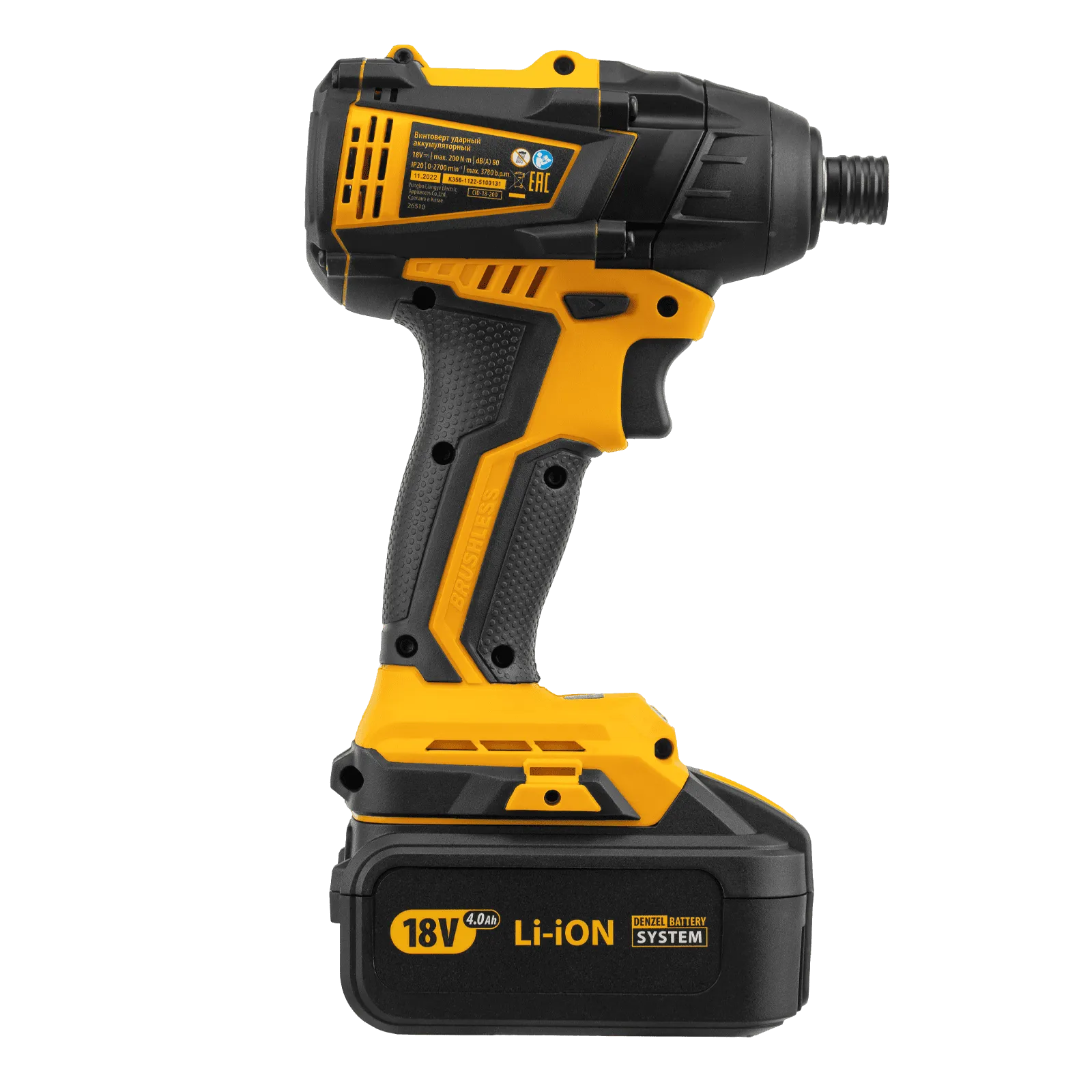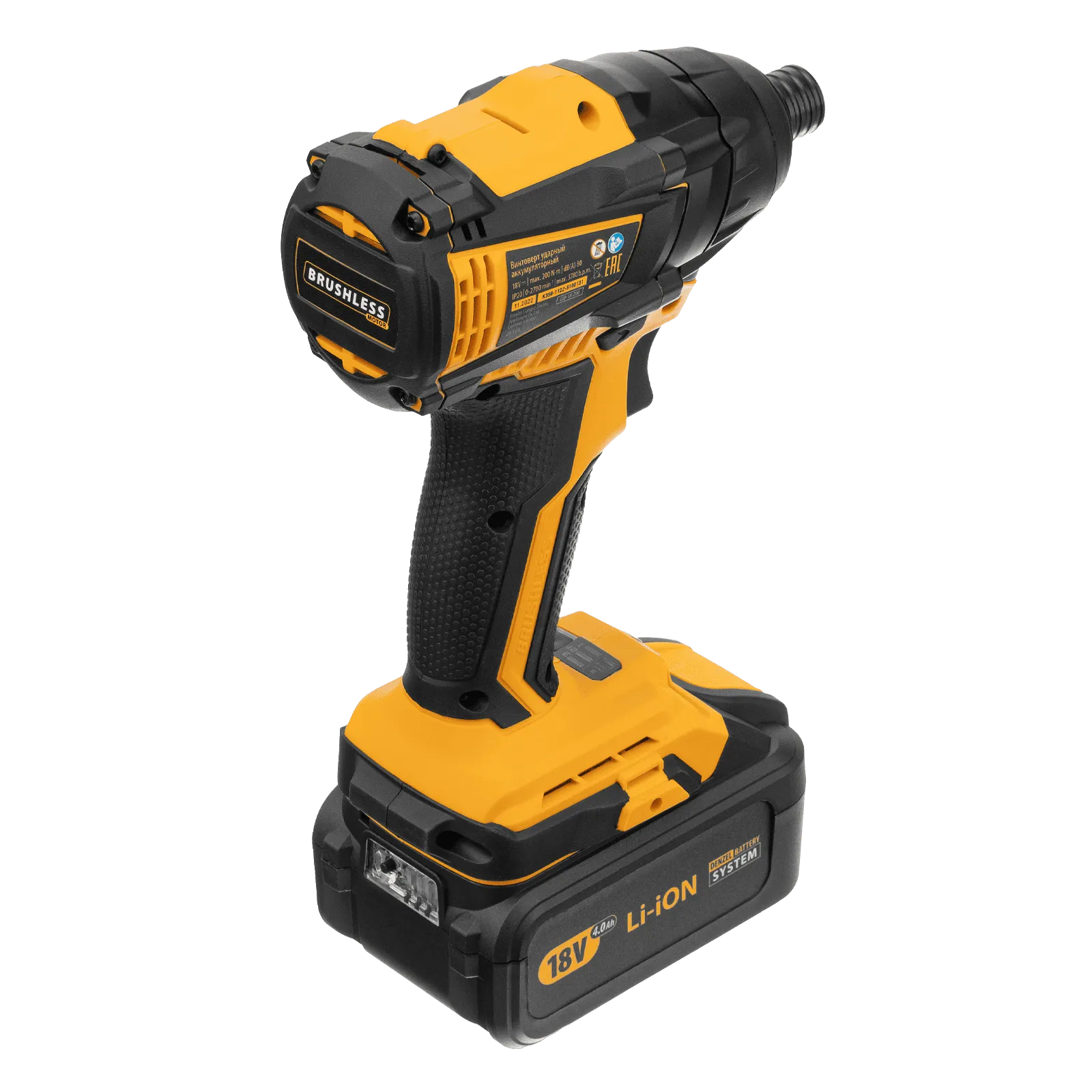 Ударный аккумуляторный винтоверт Denzel CID-IB-200 26510 с бесщеточным двигателем работает от батареи Li-Ion с рабочим напряжением 18 В и предназначен для завинчивания и отвинчивания винтов и шурупов, а также затягивания и откручивания гаек. Эффективен для демонтажа перетянутого и закисшего крепежа, закручивания длинных болтов и шурупов. Пригодится для сборки мебели и различных конструкций.;Аккумуляторный винтоверт не зависит от стационарного источника энергии. Интеллектуальная батарея емкостью 4 А/ч с защитой от перезаряда и глубокого разряда не имеет эффекта памяти, благодаря чему обеспечивает стабильную работу инструмента на протяжении длительного времени.