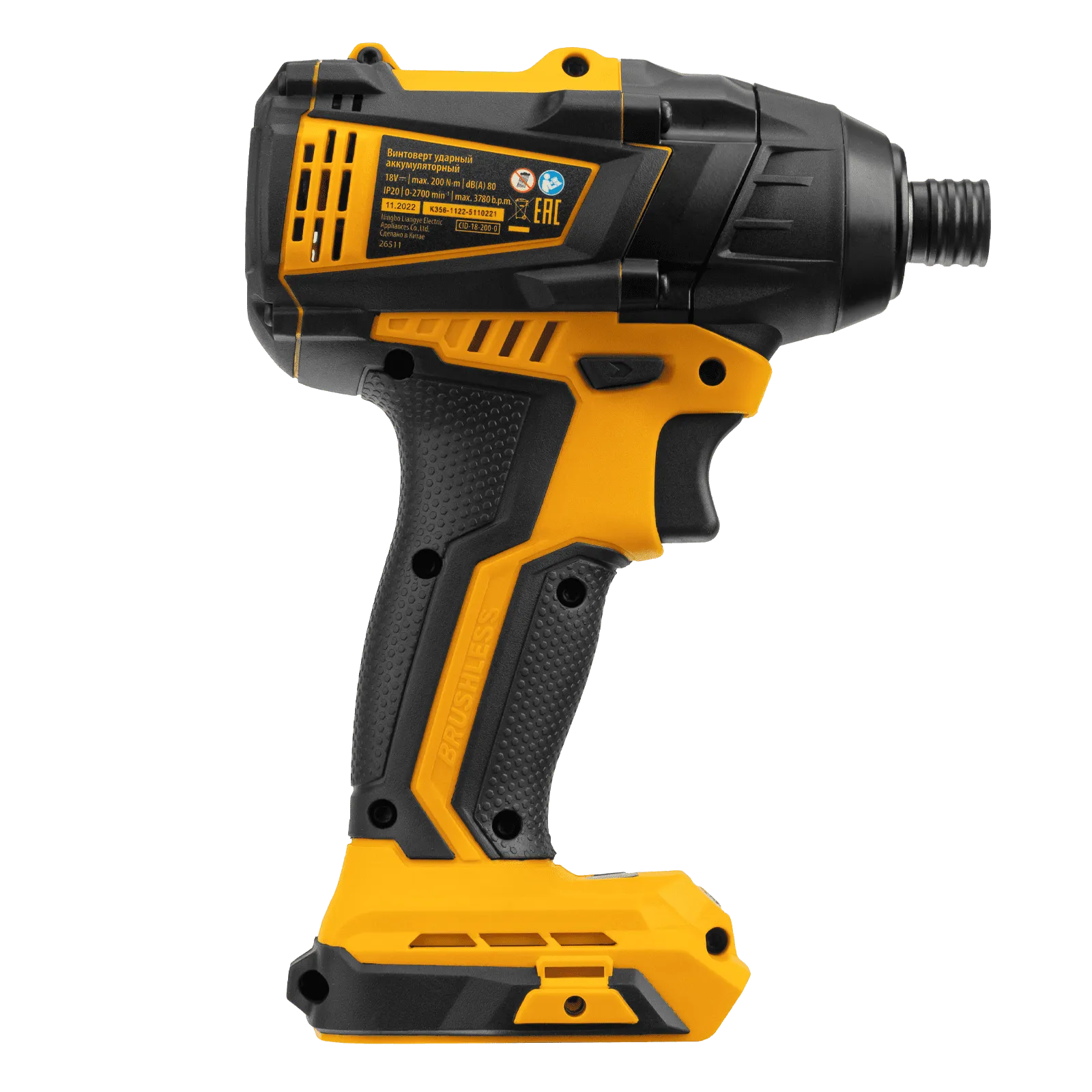 Ударный аккумуляторный винтоверт Denzel CID-IB-200-0 26511 с бесщеточным двигателем работает от аккумулятора Li-Ion с рабочим напряжением 18 В (не входит в комплект поставки) и благодаря высокому крутящему моменту 200 Нм подходит для завинчивания и отвинчивания винтов и шурупов, а также затягивания и откручивания гаек. Эффективен для демонтажа перетянутого и закисшего крепежа, закручивания длинных болтов и шурупов. Пригодится для сборки мебели и различных конструкций.;Аккумуляторный винтоверт не зависит от стационарного источника энергии. Инструмент работает на платформе 18V Denzel battery system и совместим с элементами питания 18 В.