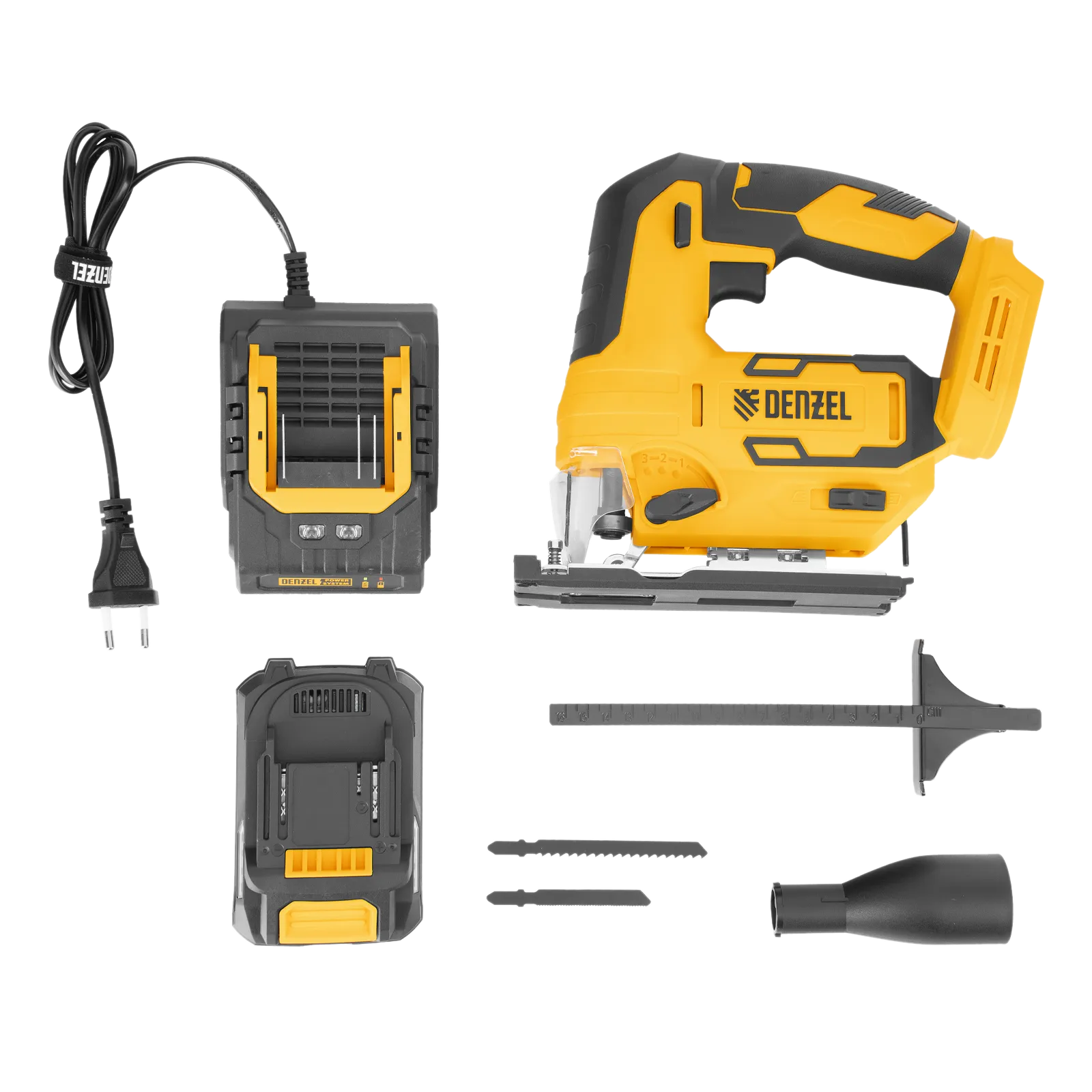 - Полная комплектация — лобзик поставляется с аккумулятором, зарядным устройством, адаптером для пылесоса, шестигранным ключом, параллельной направляющей и 2 полотнами: по дереву и по металлу.