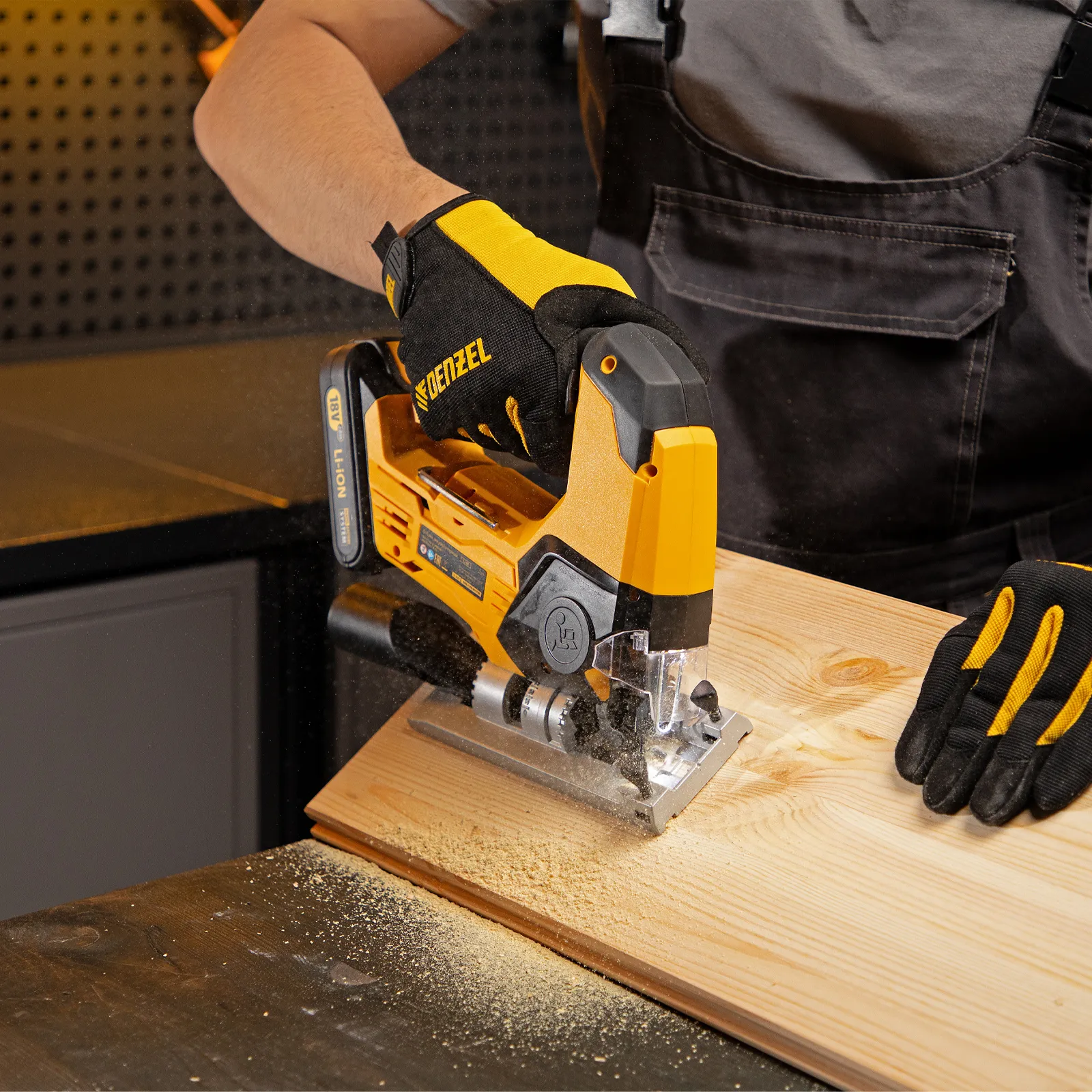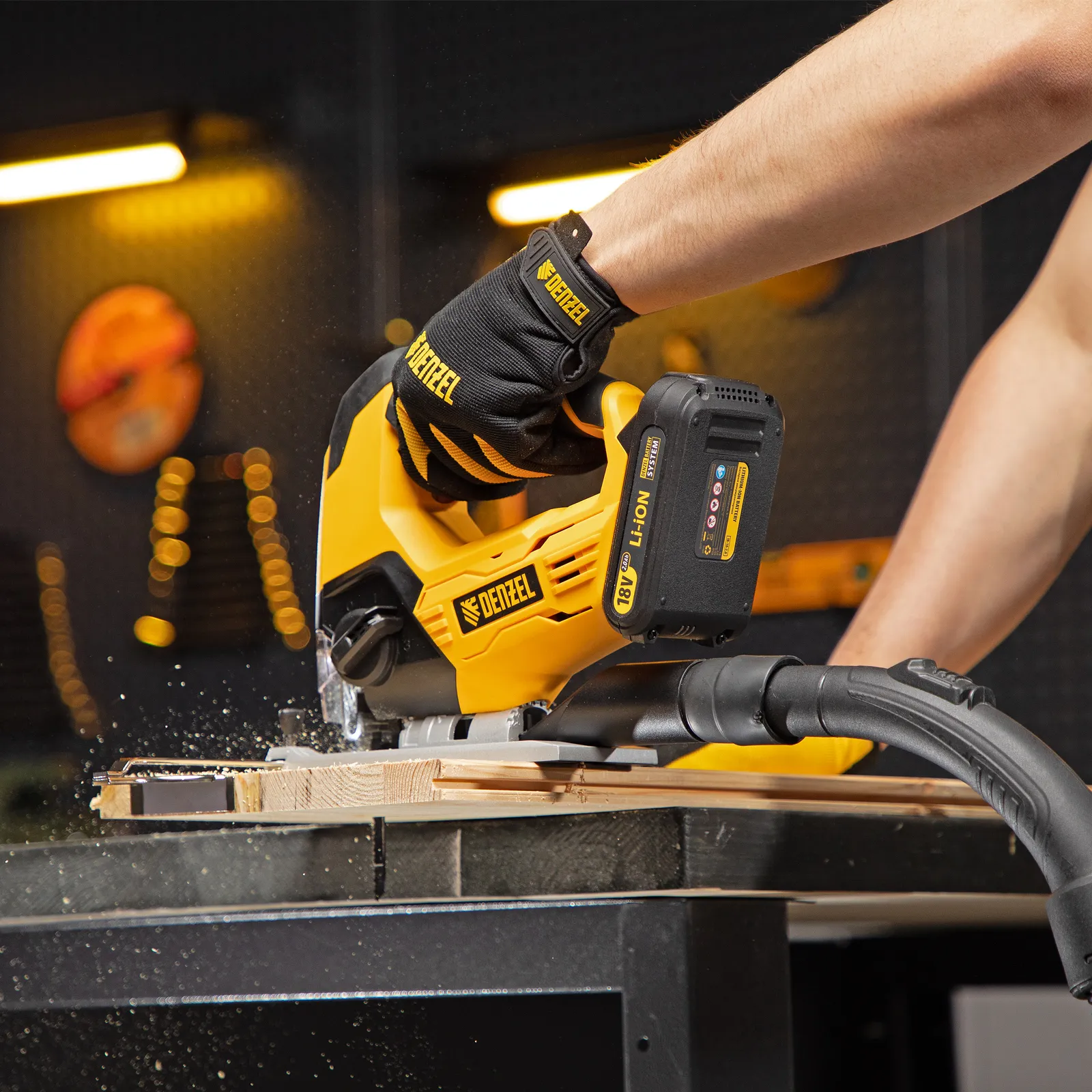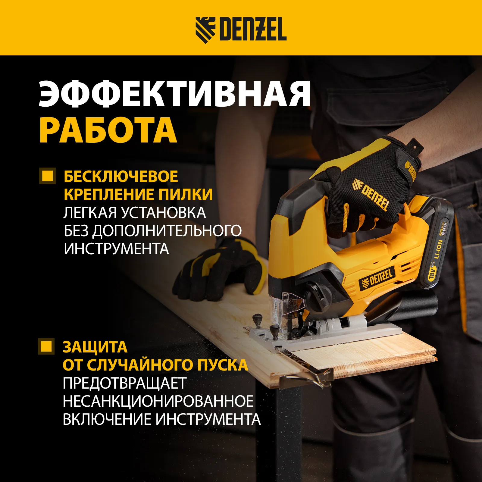 Лобзик поставляется без аккумулятора и зарядного устройства, на него можно установить универсальный источник питания, совместимый с любым аккумуляторным инструментом Denzel battery system 18V.
