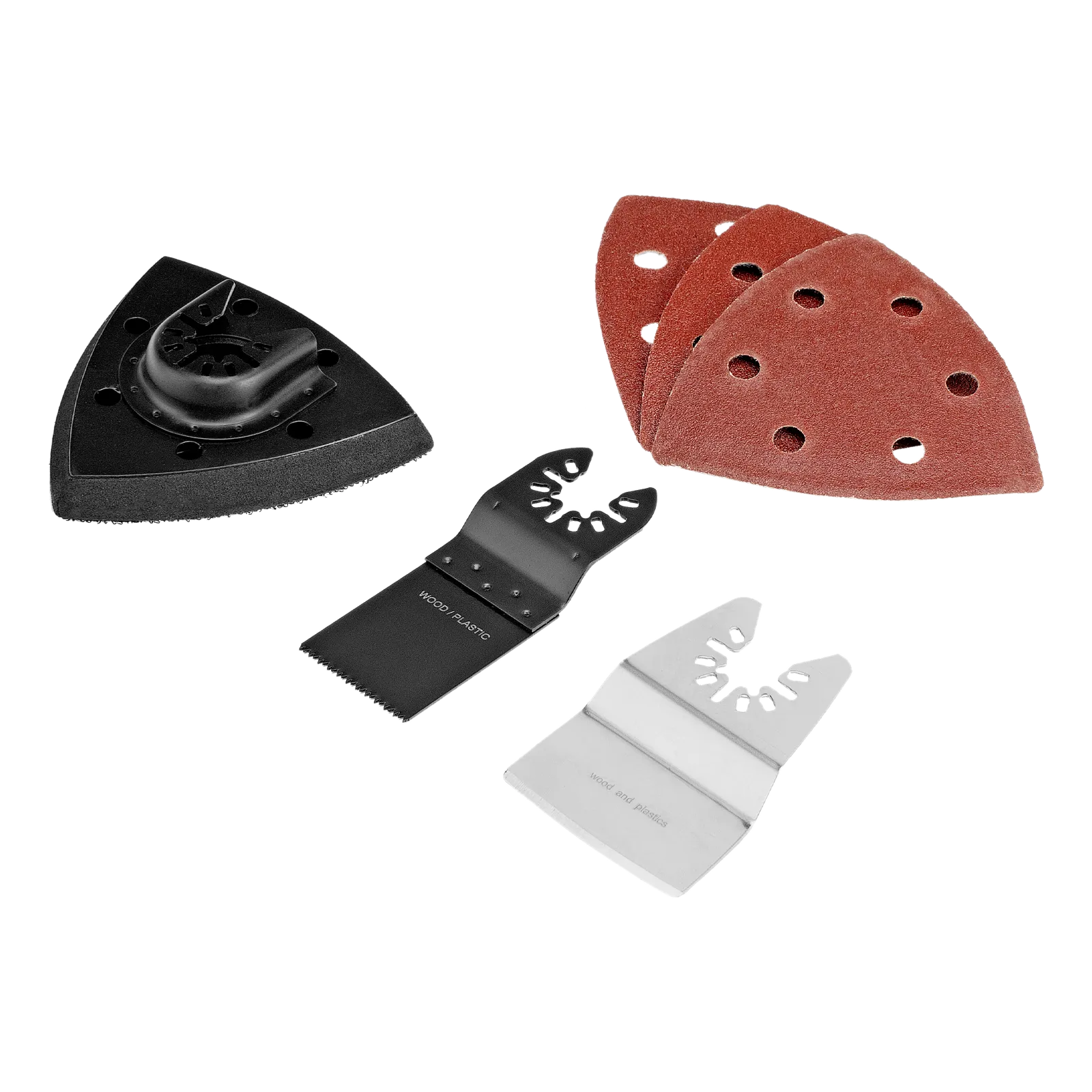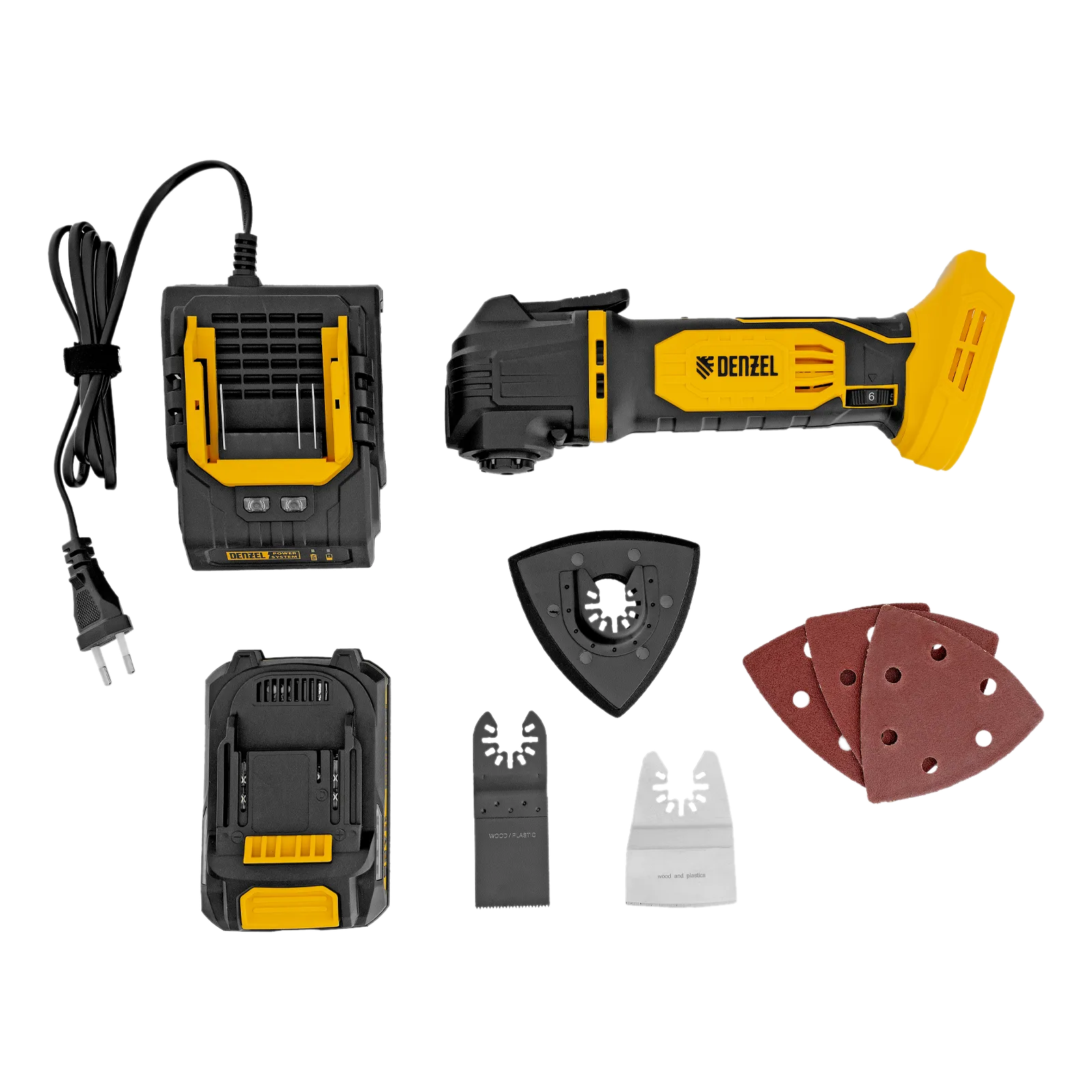 - Готовность к эксплуатации — в комплект поставки входит аккумулятор, зарядное устройство, полотно для древесины и пластика, шабер, шлифовальная подошва и набор шлифовальной бумаги.