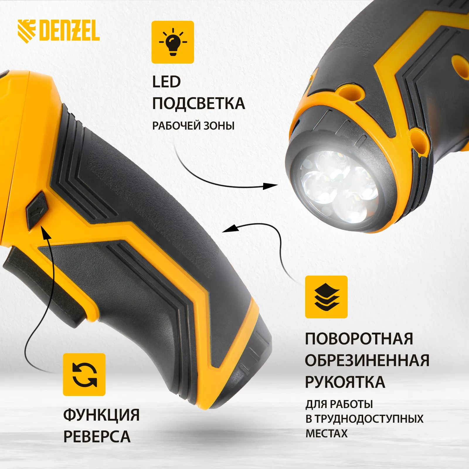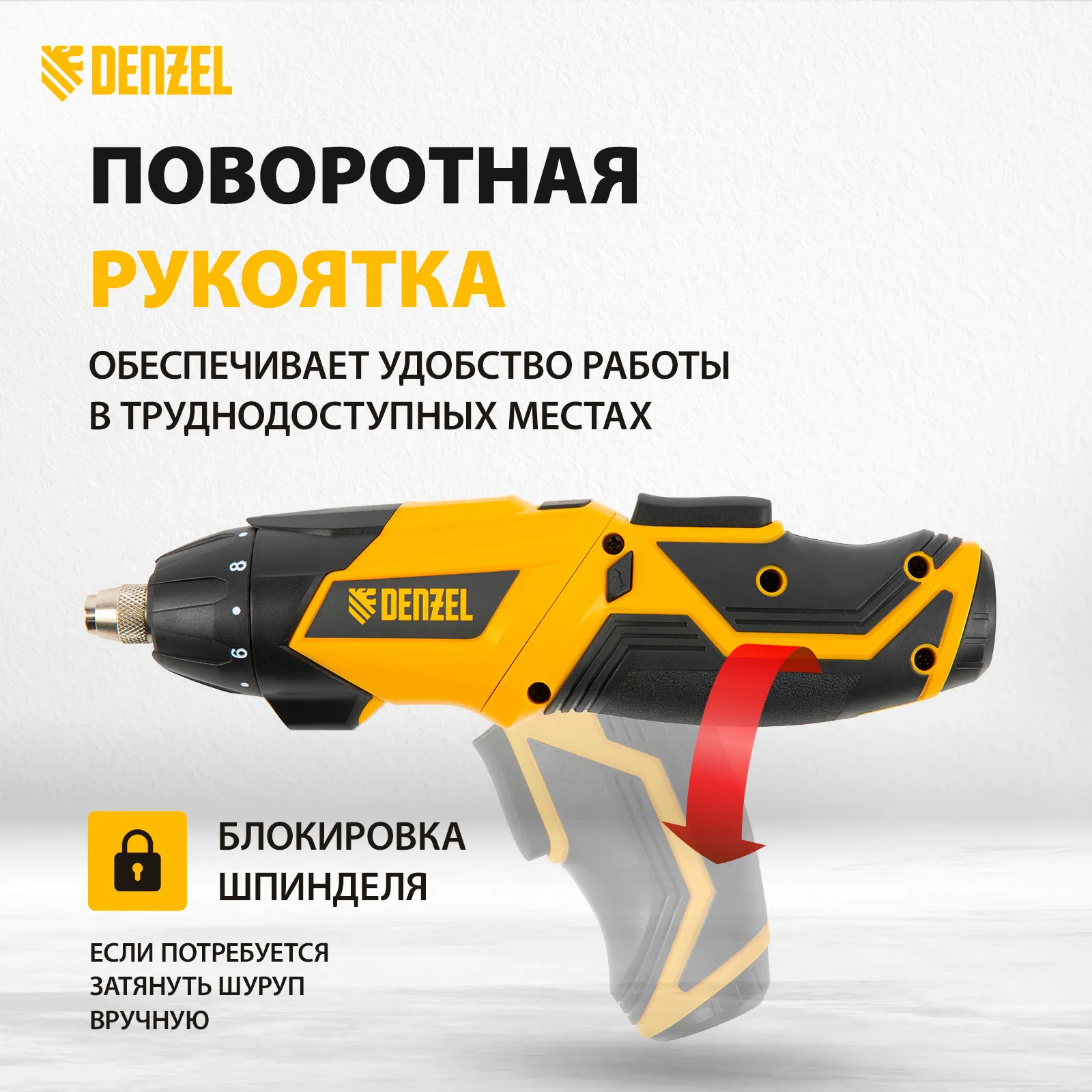 - Эргономичность — поворотная обрезиненная рукоятка фиксируется в нужном положении и позволяет работать в труднодоступных местах.