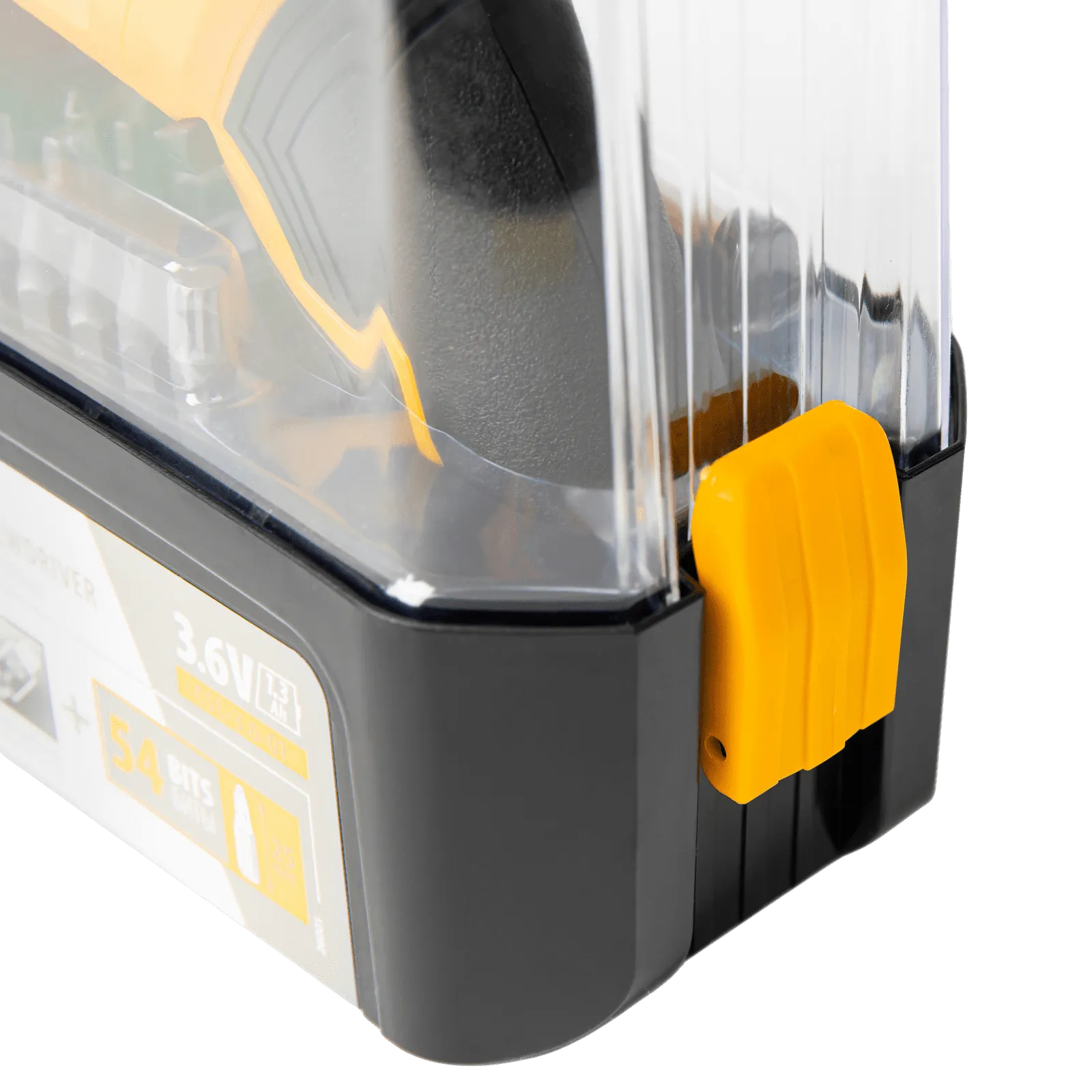 - Удобное хранение и транспортировка — отвертка с аксессуарами поставляется в пластиковом кейсе с прозрачной крышкой.