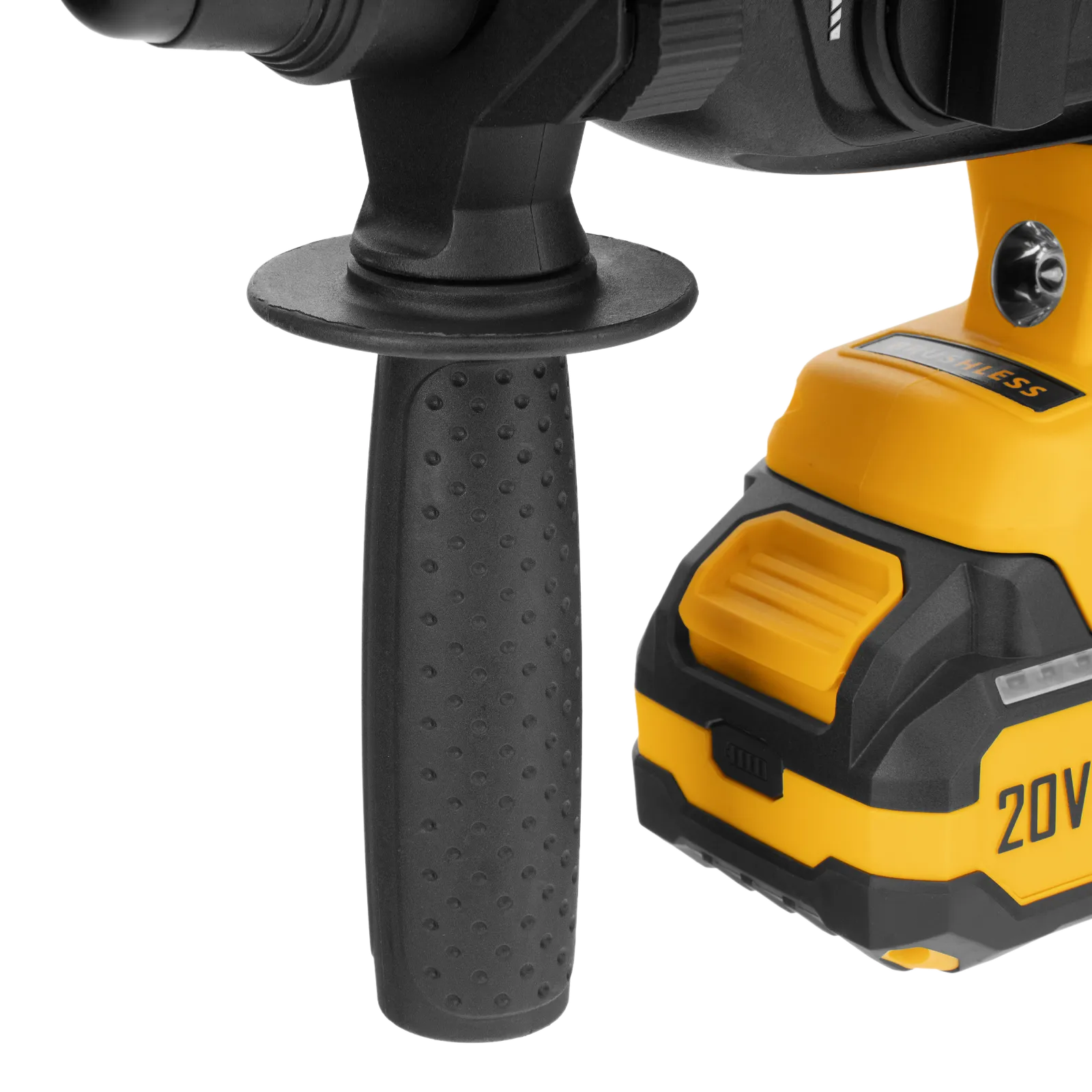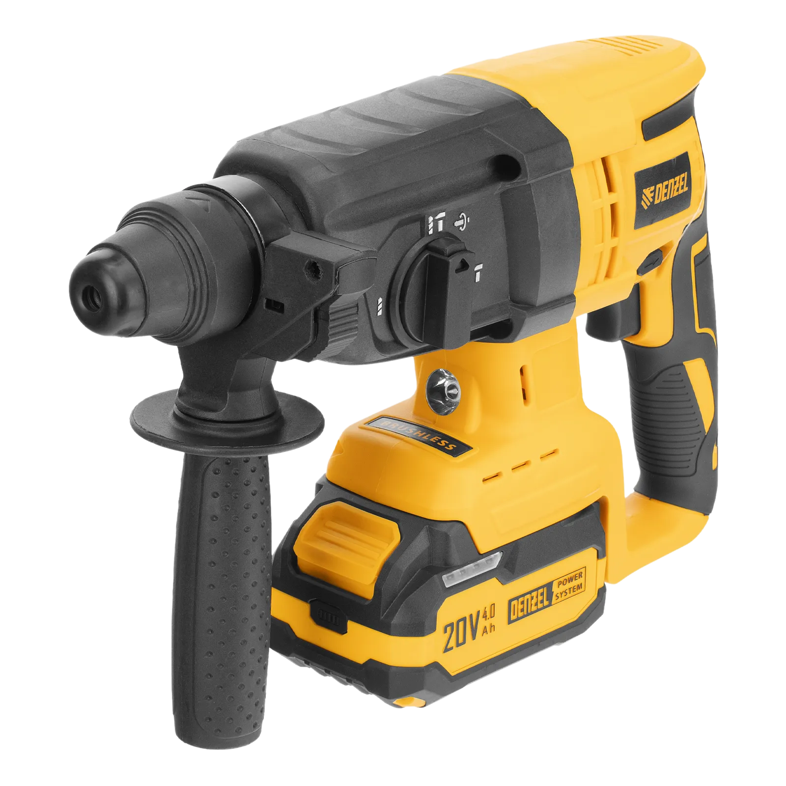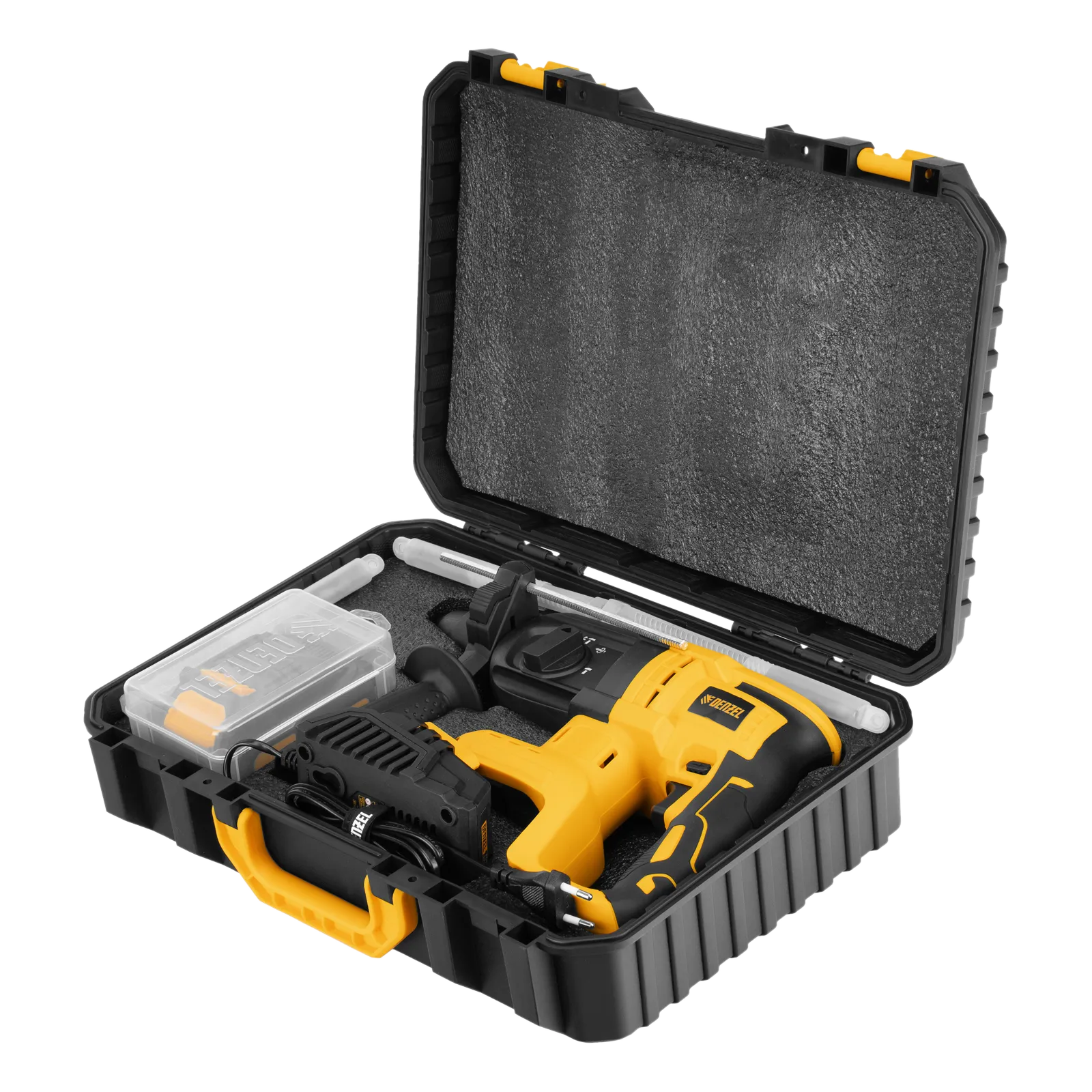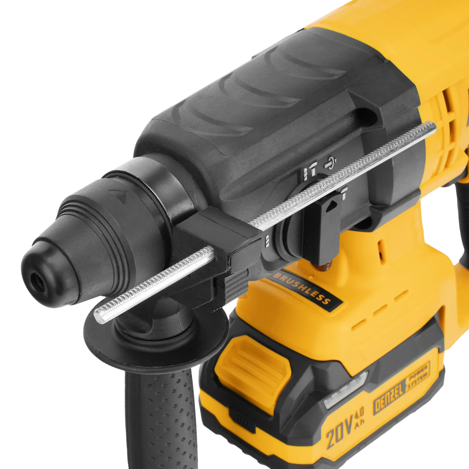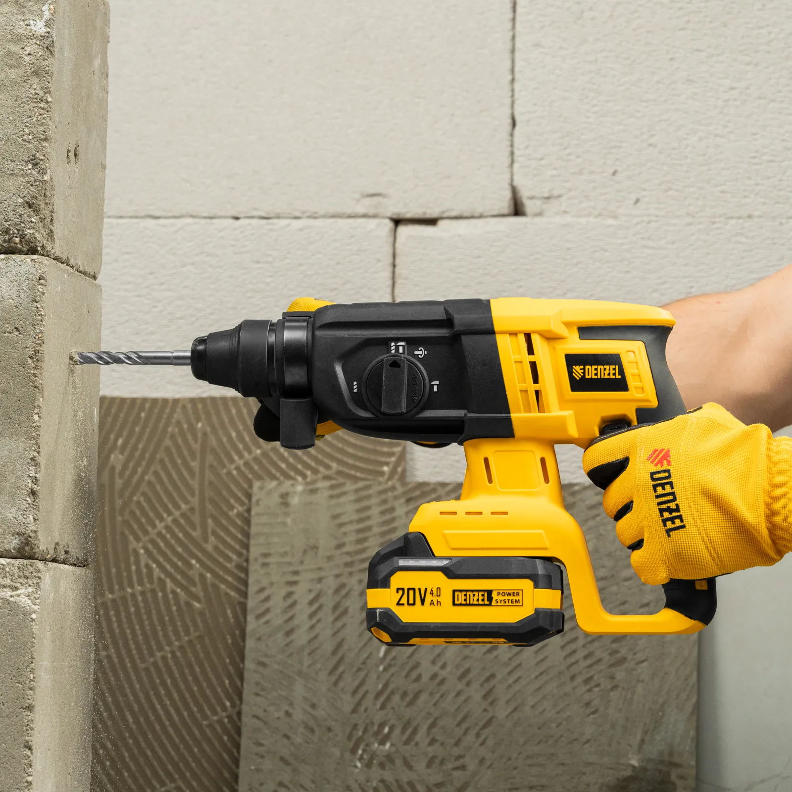 Аккумуляторный перфоратор Denzel RHH-BL-20-28 26707 используется для сверления и бурения отверстий в различных материалах, разрушения кирпичной кладки, штробления бетона, камня и кирпича. Максимальный диаметр отверстий в древесине составляет 40 мм, металле — 13 мм, бетоне — 28 мм. Можно выбрать один из трех режимов работы: долбление, сверление и сверление с ударом. Угловое положение долота регулируется для наиболее эффективной работы. Максимальная частота вращения составляет 1050 об/мин, ударов — 4800 уд/мин.