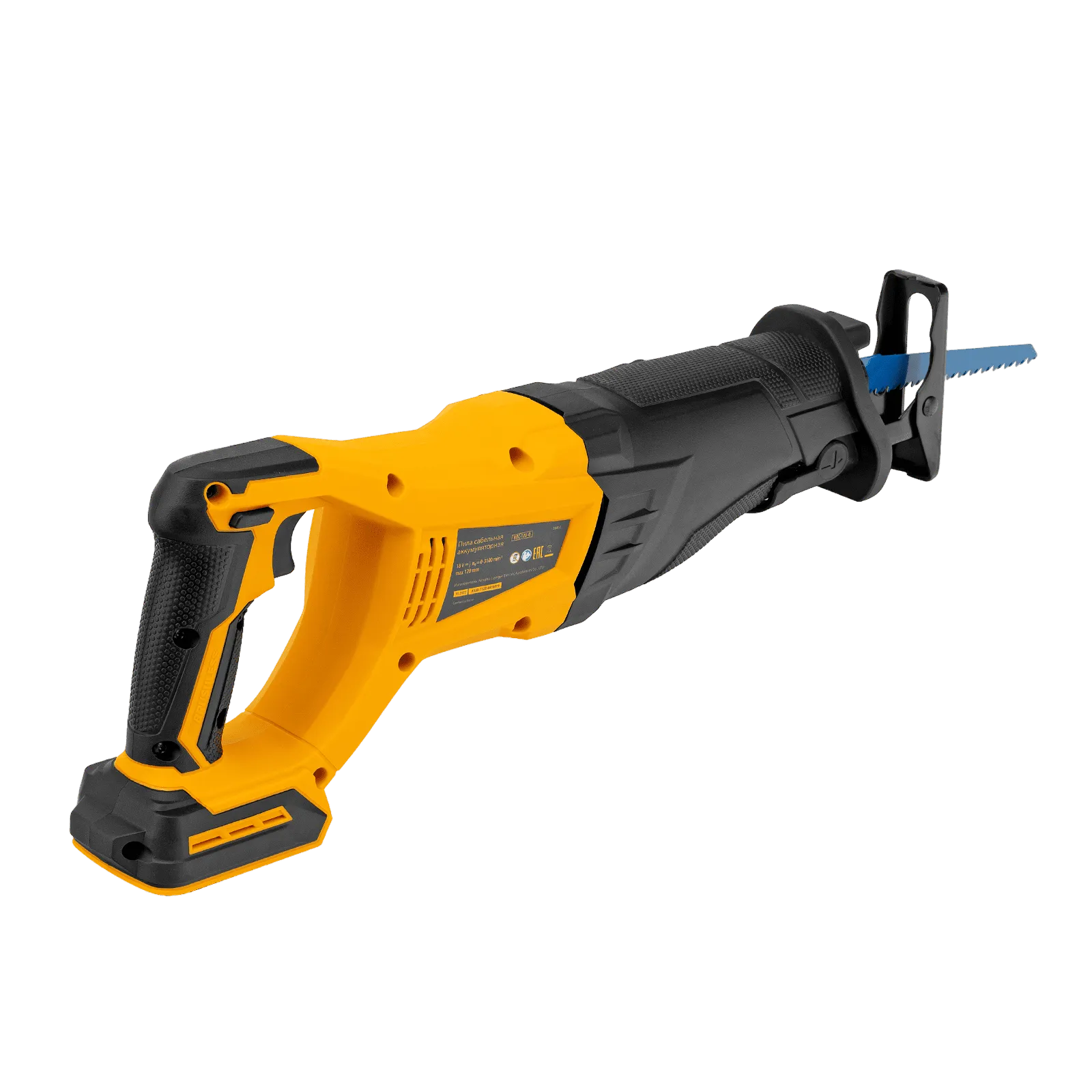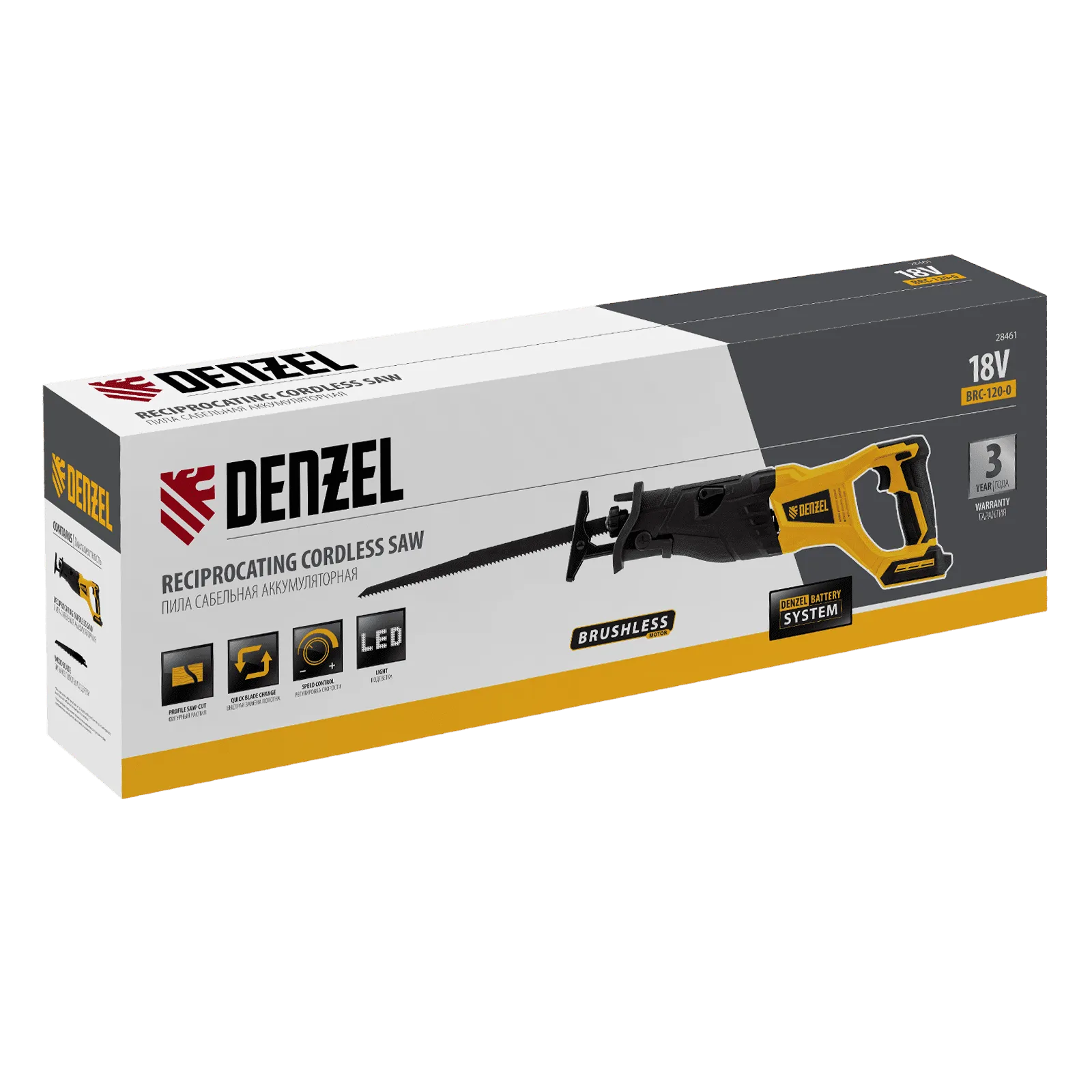 Сабельная аккумуляторная пила Denzel BRC-120-0 28461 с бесщеточным двигателем работает от аккумулятора Li-Ion с рабочим напряжением 18 В. Предназначена для распила фанеры, досок, ДСП, ДВП, пластика, а также для обрезки веток. Максимальная глубина пропила в древесине составляет 120 мм, в стали — 10 мм. Оснастка совершает до 3100 ходов в минуту, что обеспечивает эффективную работу. ;Пила поставляется без аккумулятора и зарядного устройства, к ней подходит универсальный аккумулятор емкостью 4 А/ч, совместимый с любым инструментом единой платформы Denzel battery system 18V серии IB.