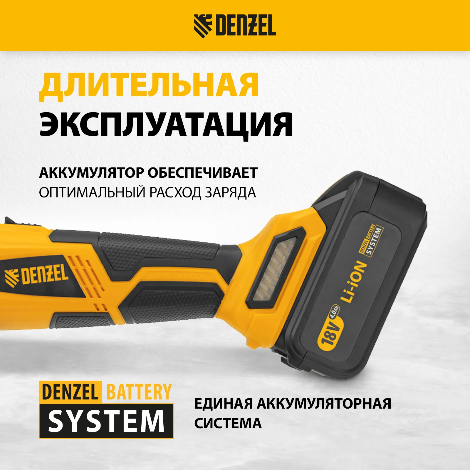 - Универсальность — аккумулятор совместим со всеми инструментами модельного ряда единой платформы Denzel Battery System 18V.