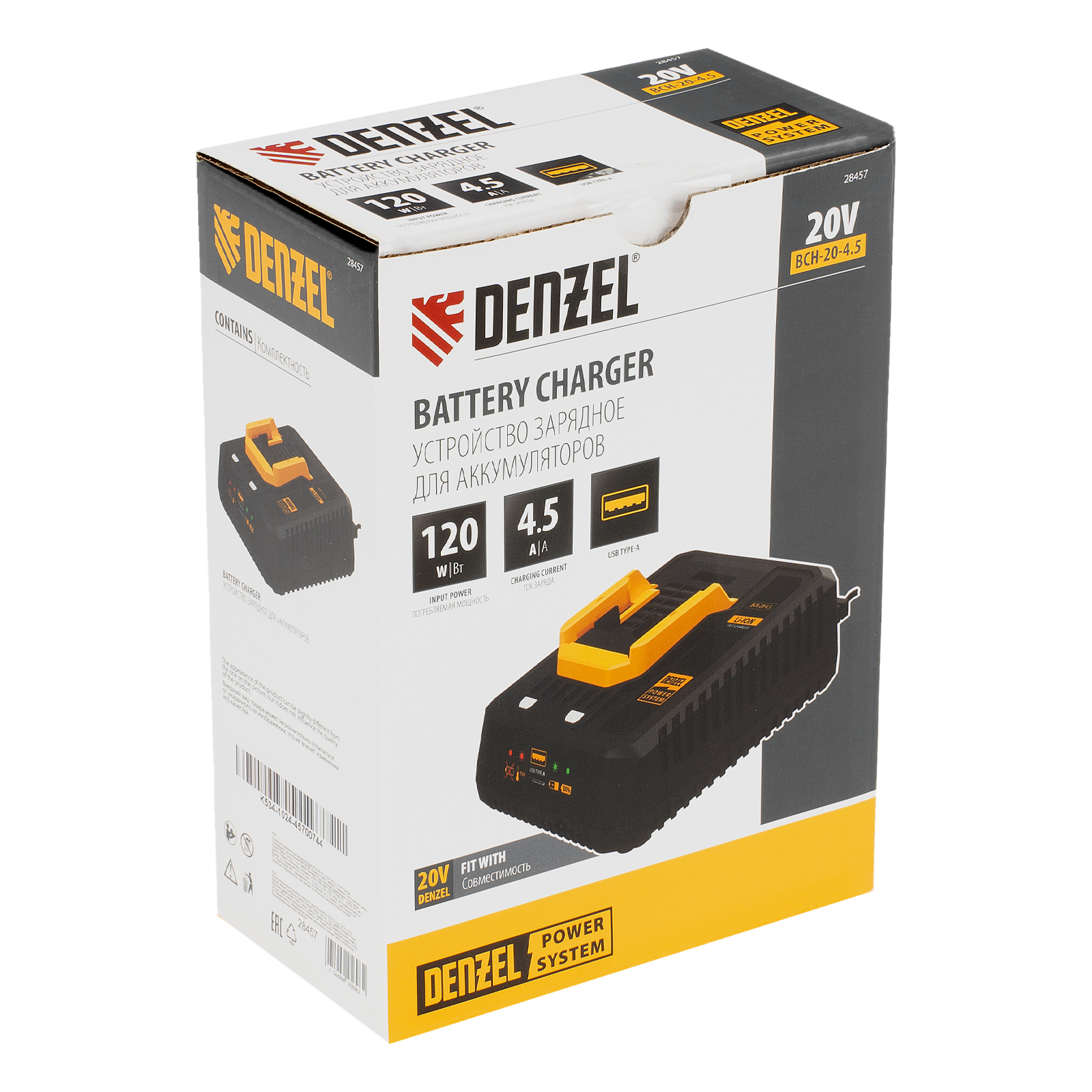 Зарядное устройство Denzel BCH-20-4.5 28457 поддерживает ток заряда 4,5 A и предназначено для восстановления работоспособности аккумуляторов Denzel Li-Ion 20 В (артикулы 28442, 28444 и 28446). Обеспечивает ускоренную и полную зарядку, что позволяет быстро вернуться к работе с аккумуляторным инструментом. Длина кабеля составляет 1,2 м, поэтому зарядное устройство удобно подключать к розетке.