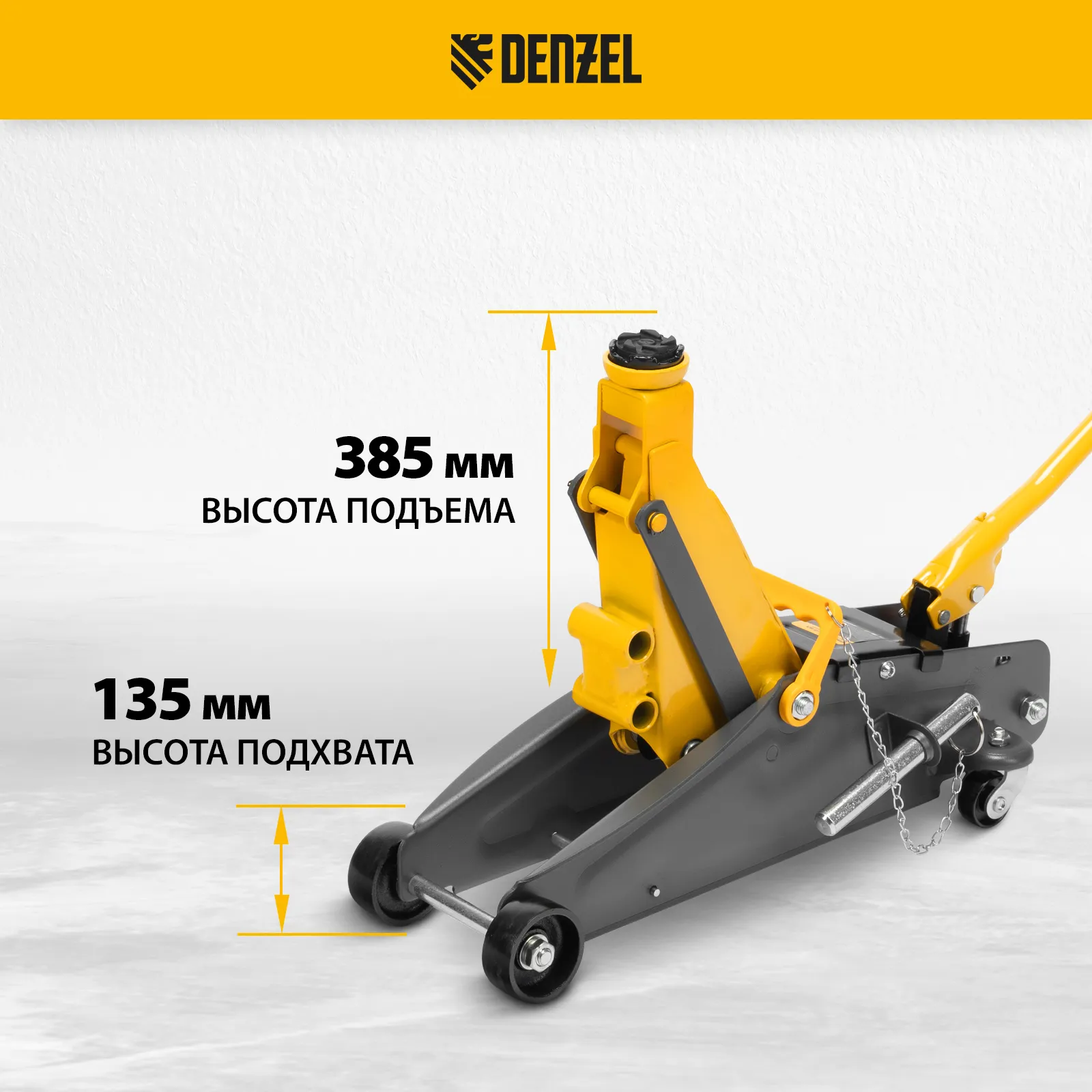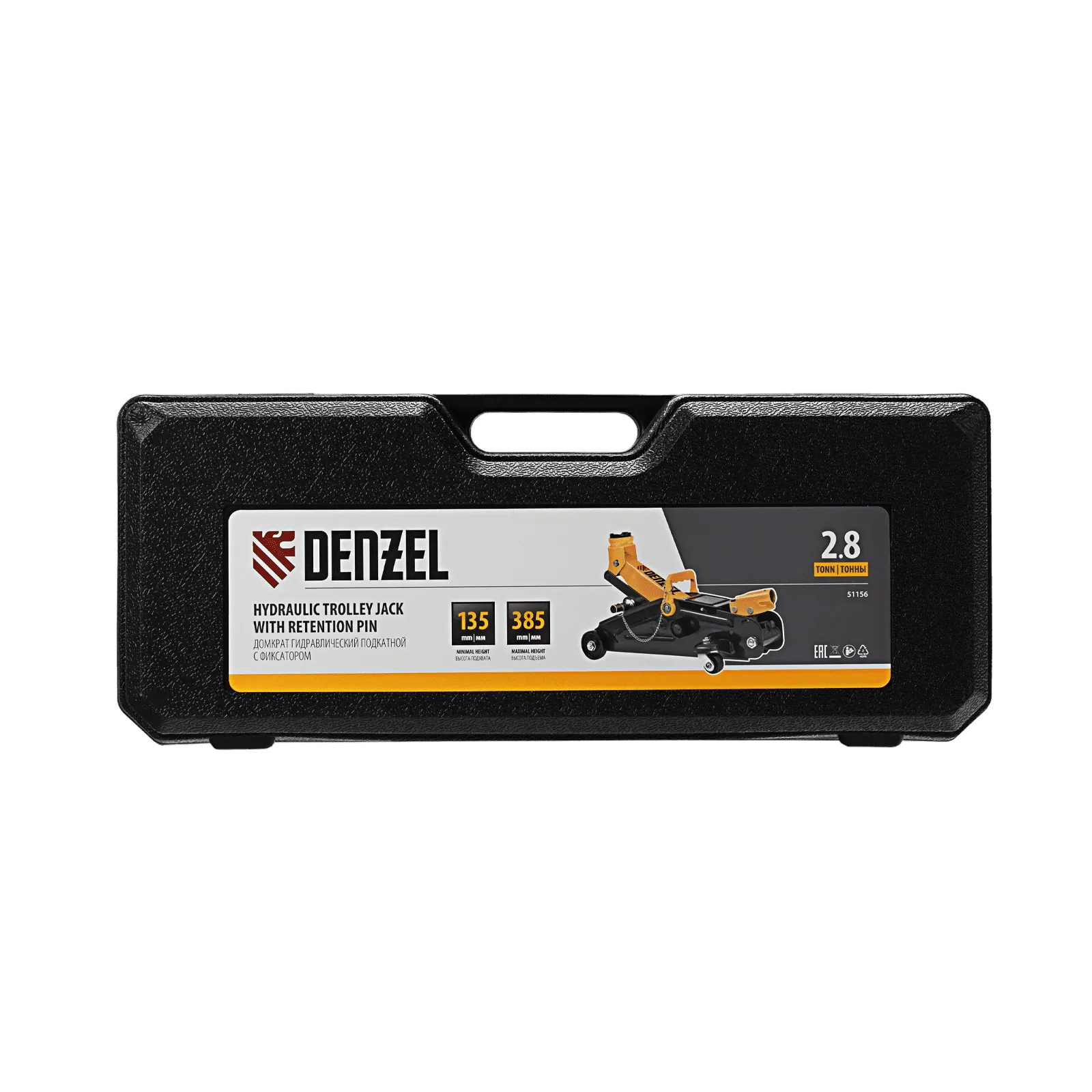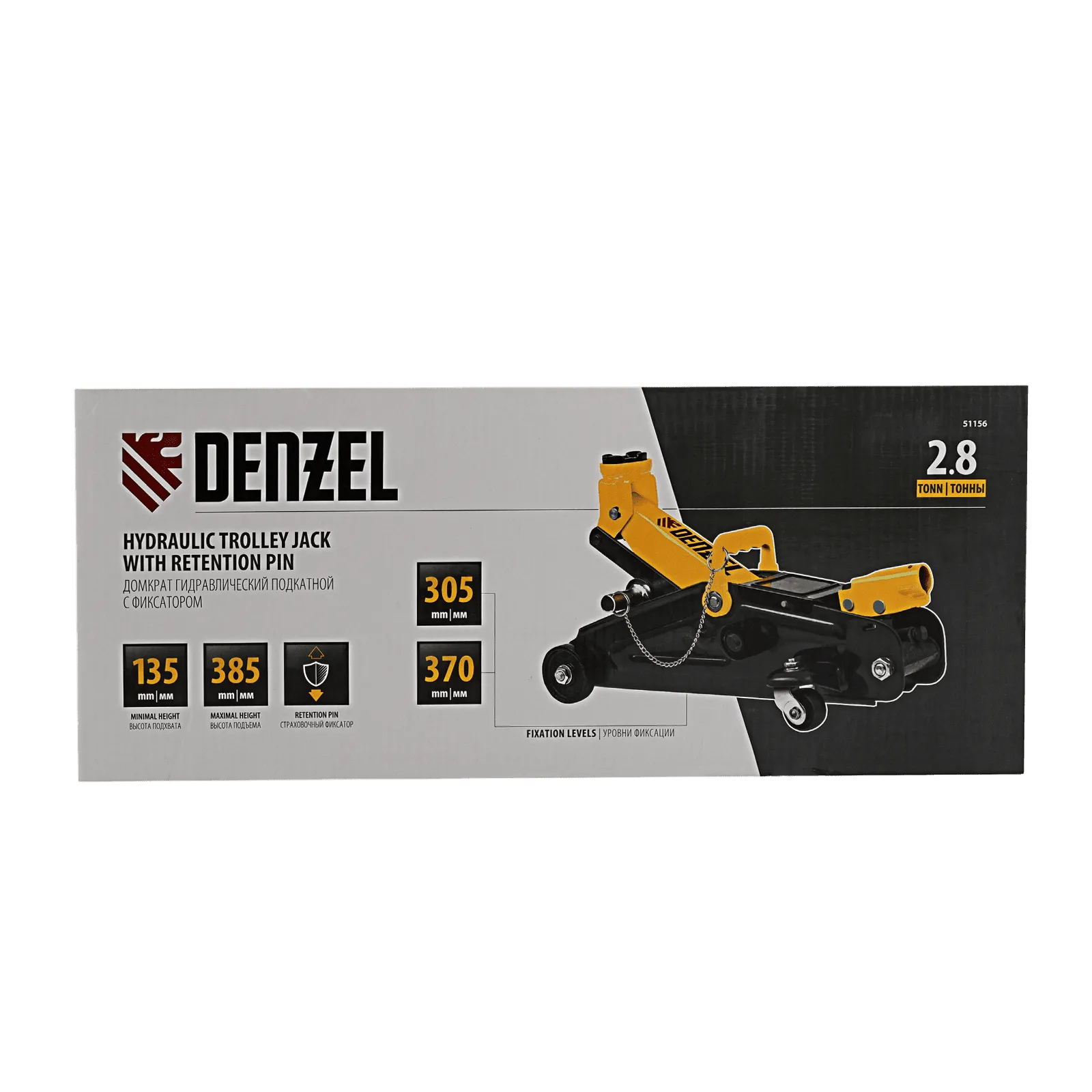 Гидравлический подкатной домкрат с фиксатором Denzel 51156, с высотой подхвата 135 мм, предназначен для плавного подъема грузов массой до 2,8 т на высоту до 385 мм. Страховочный штифт позволяет фиксировать подъемный рычаг на высоте 305 и 370 мм для безопасной работы. Домкрат пригодится владельцам легковых автомобилей со стандартным клиренсом.
