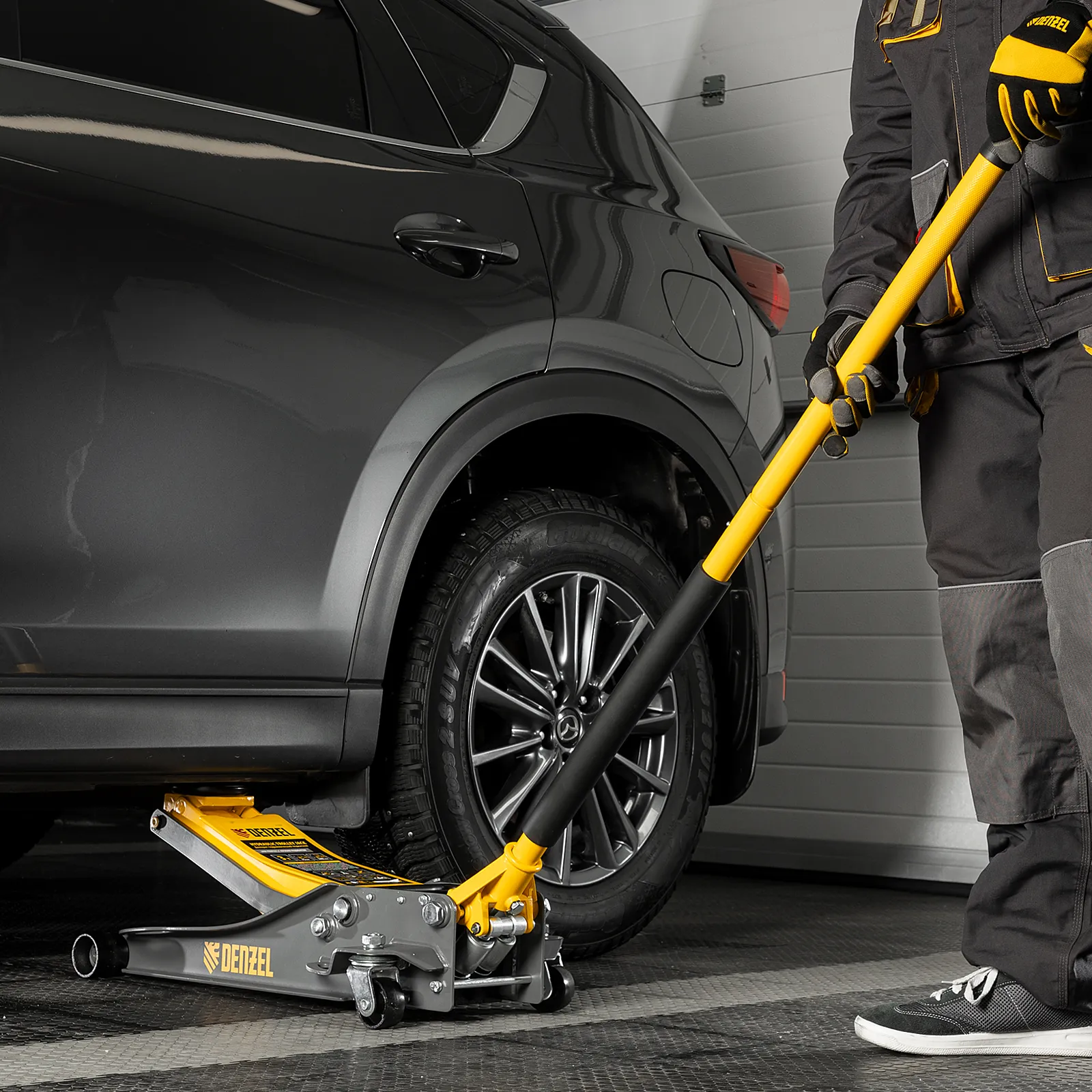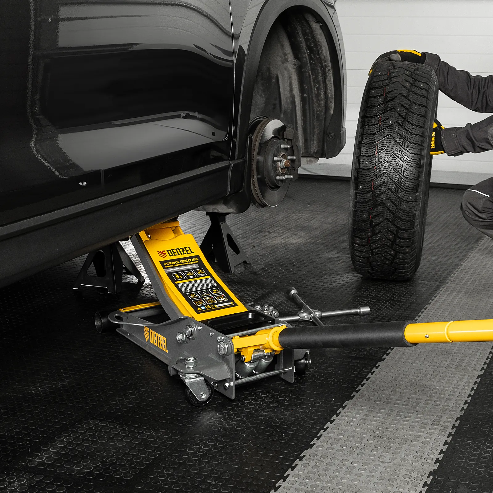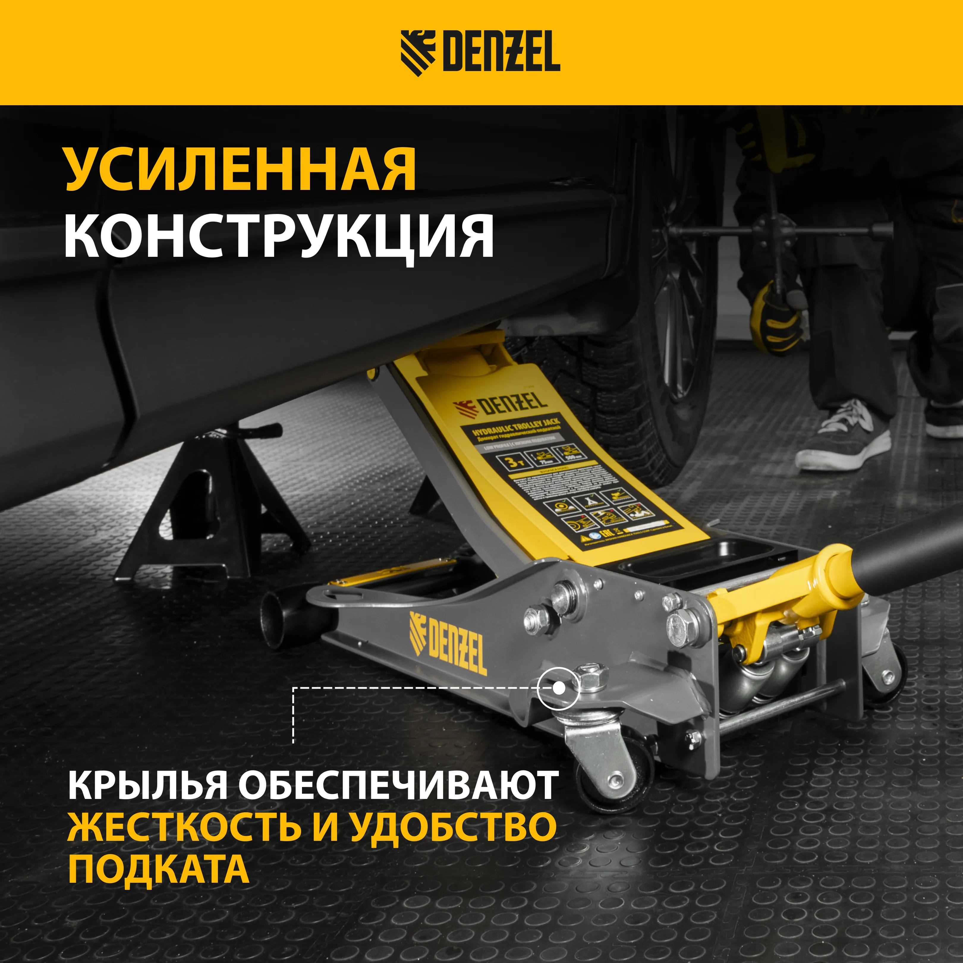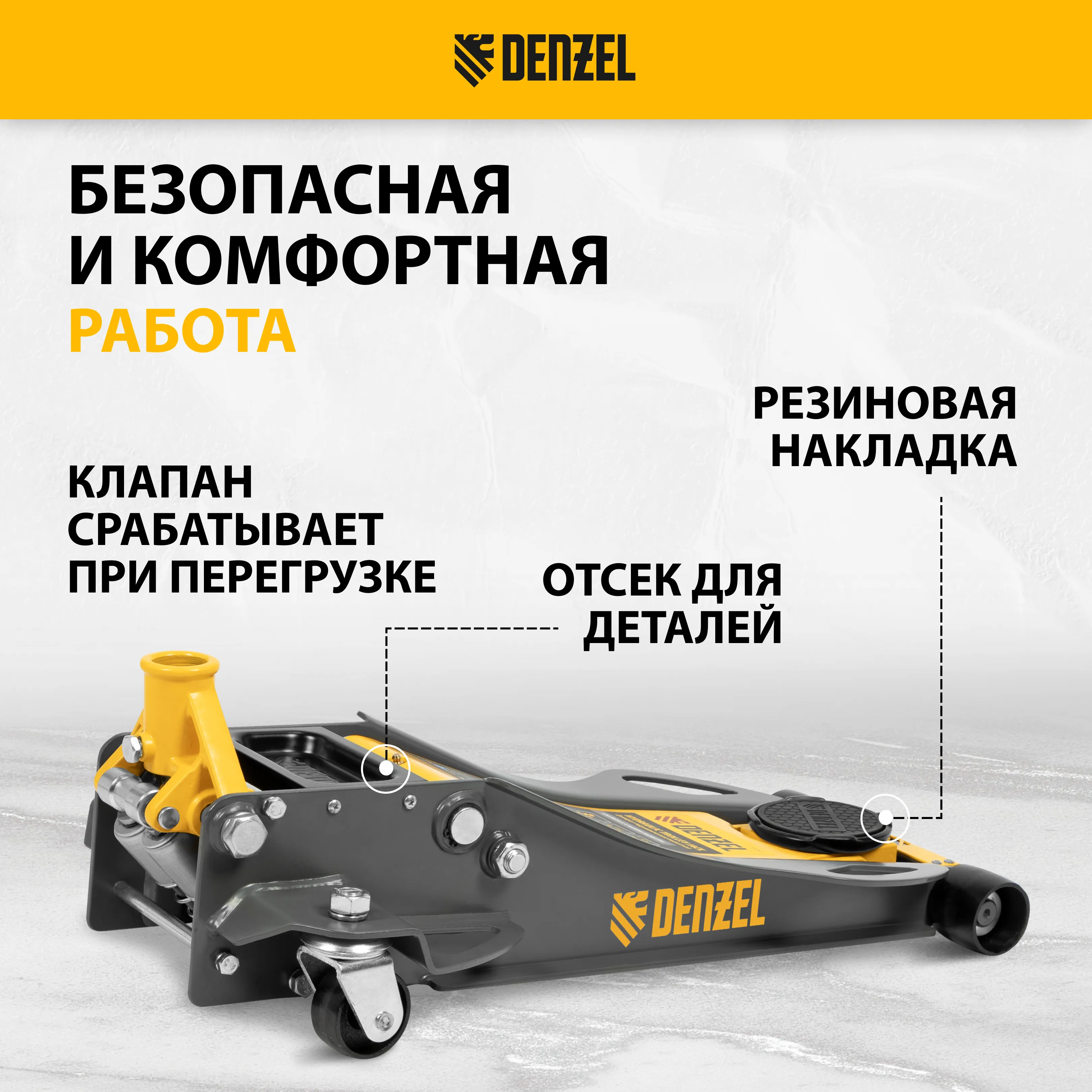 - Аккуратная работа — резиновая опора и прорезиненная рукоятка защищают кузов и днище автомобиля от нежелательных повреждений.