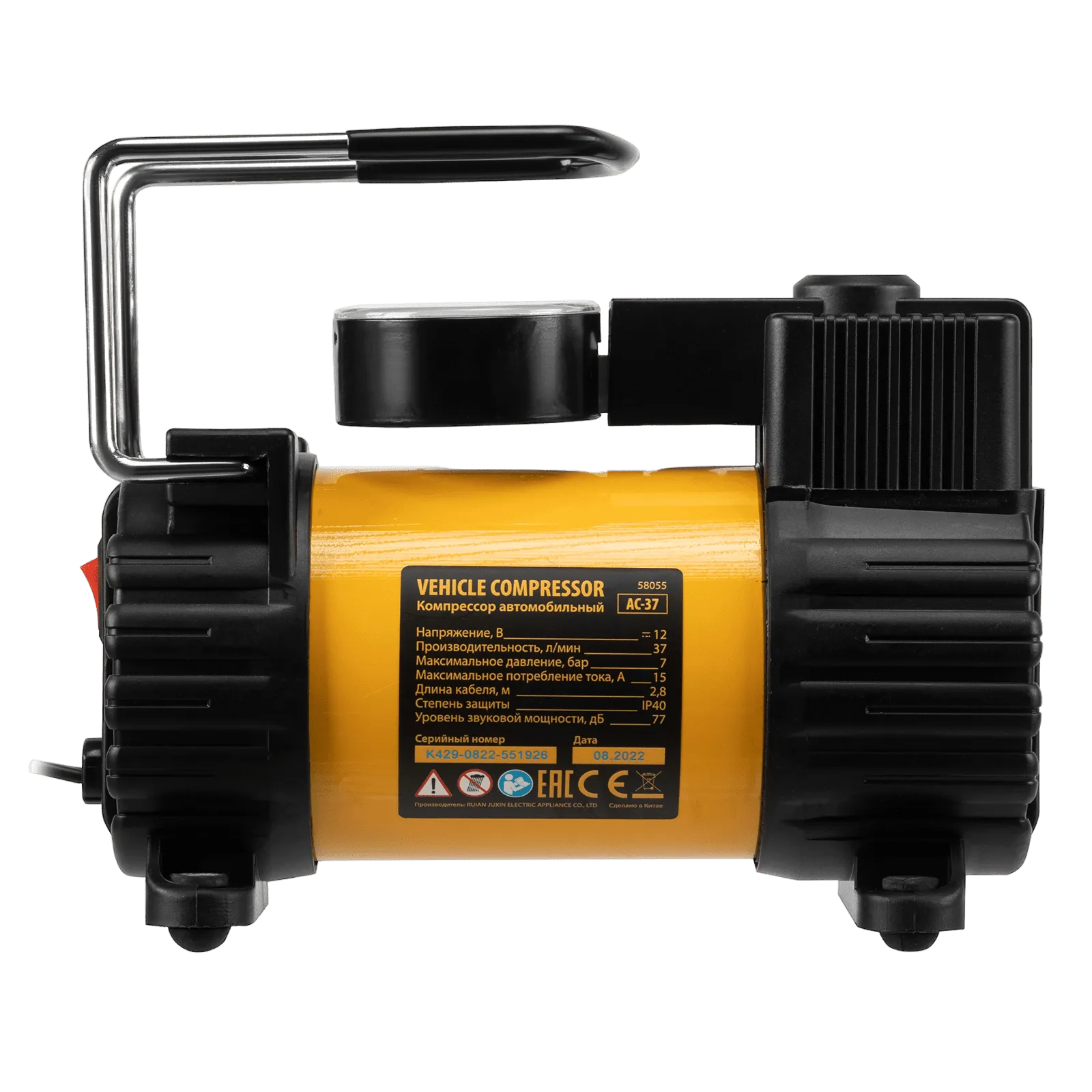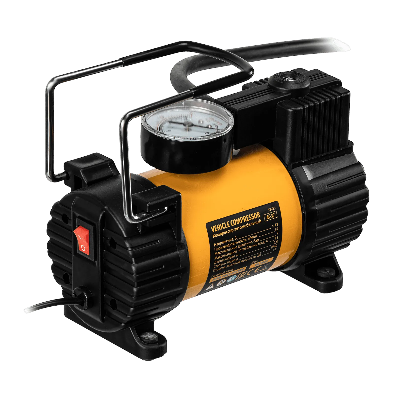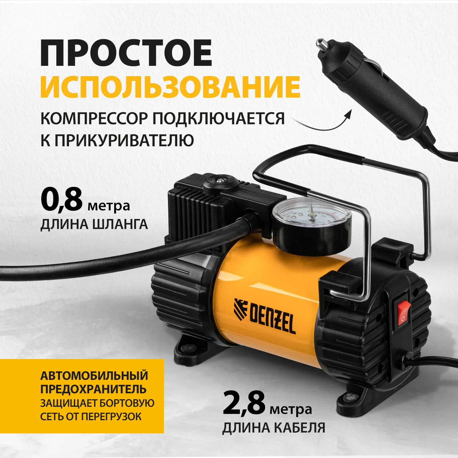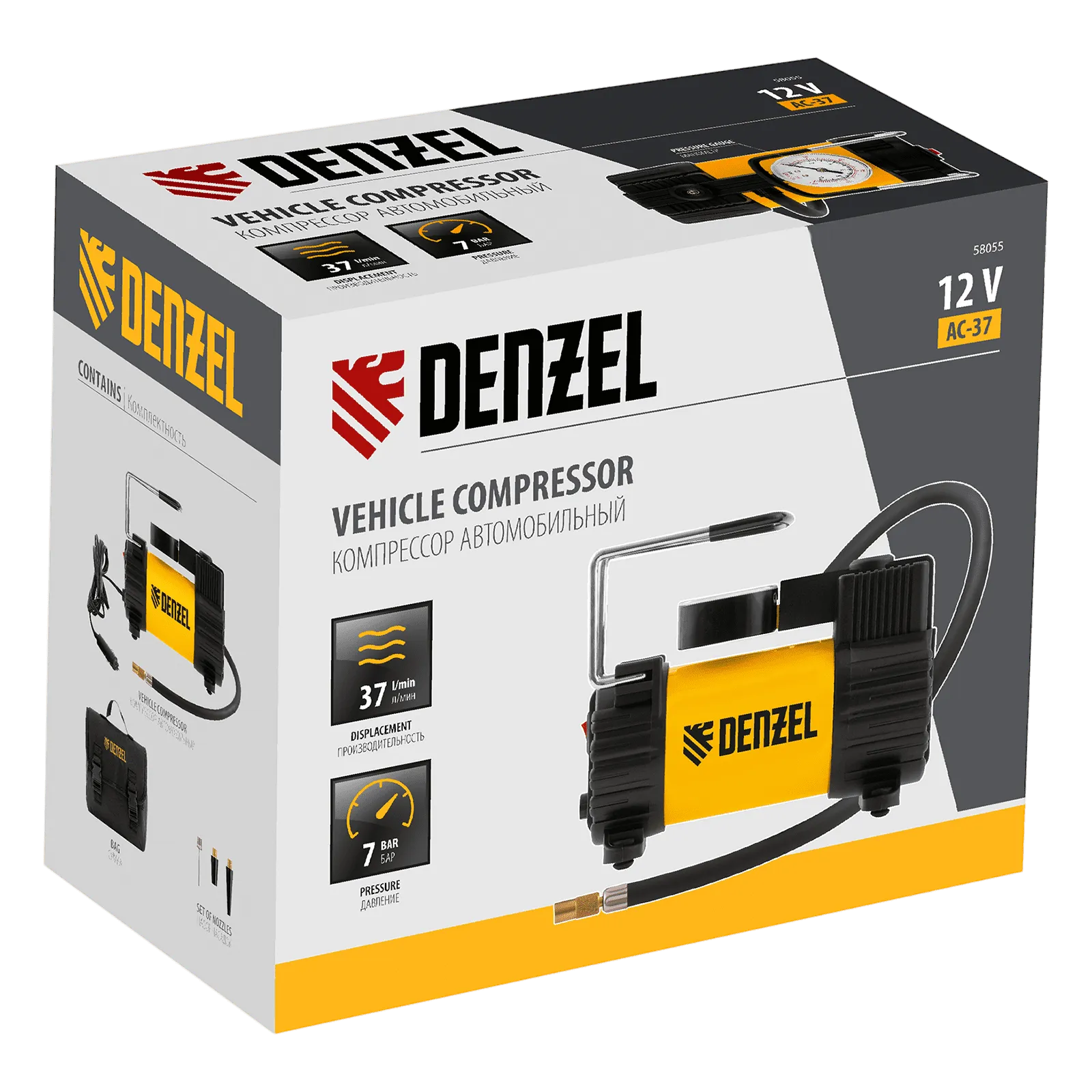 Автомобильный компрессор Denzel AC-37 58055 с автомобильным предохранителем работает от бортовой сети 12 В, обеспечивает давление 7 атмосфер и производительность 37 л/мин. Служит для накачивания шин, резиновых матрацев, надувных лодок и других изделий — для этого предусмотрены различные насадки. Компрессор пригодится в гараже, будет полезен в дальней поездке, а также во время отдыха на природе.