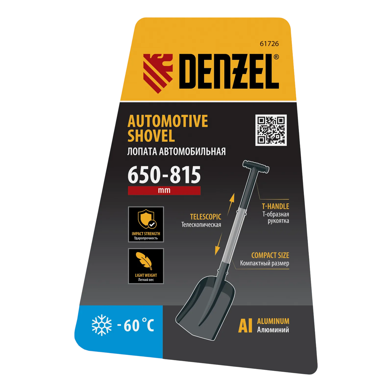 Алюминиевая автомобильная лопата Denzel 61726 размером 212 х 280 мм, с телескопическим черенком длиной 650-815 мм, позволяет освободить машину, попавшую в снежный или песчаный занос. Сохраняет рабочие качества при температуре до -60 °C и оптимальна для применения в экстремальных климатических условиях.
