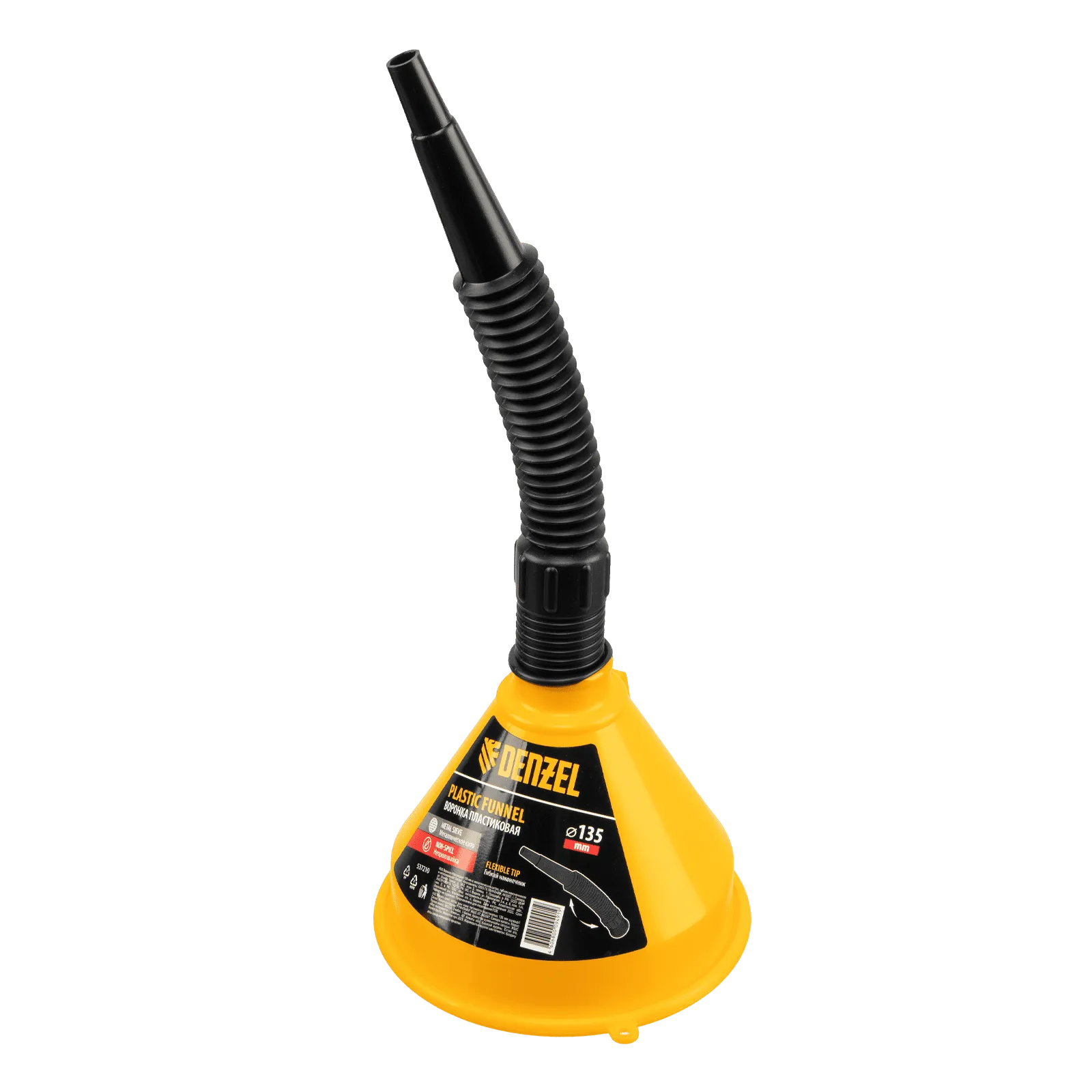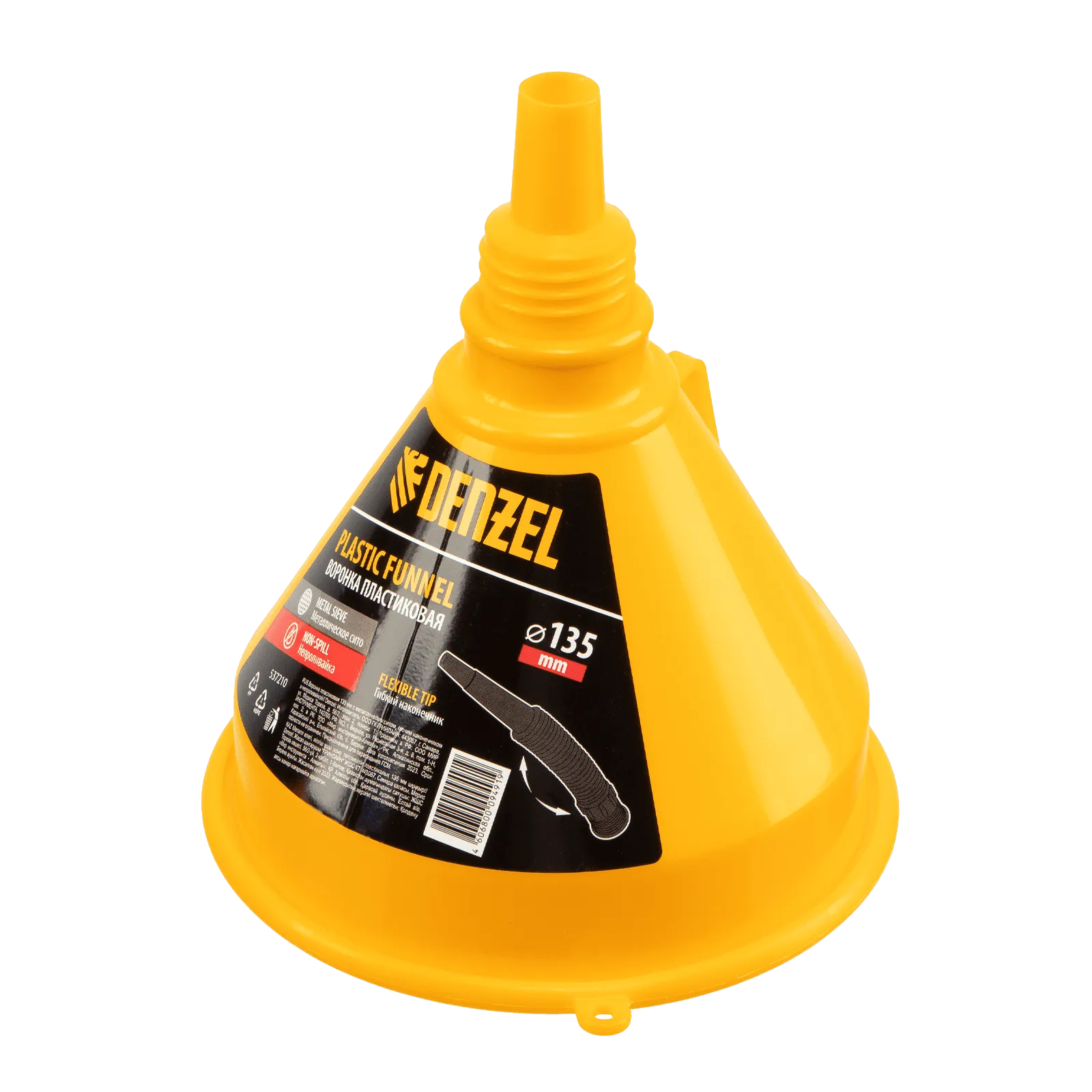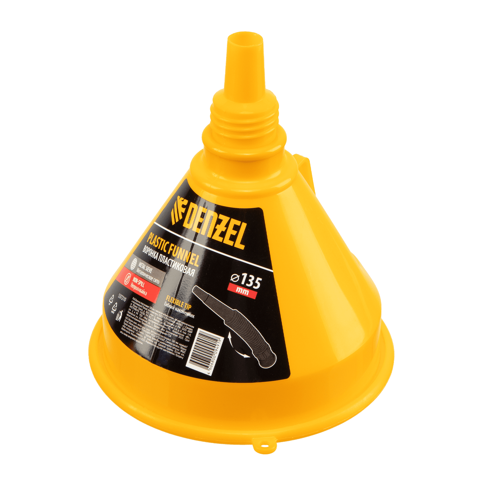 Пластиковая воронка Denzel 537210 диаметром 135 мм, с металлическим сетчатым фильтром, «непроливайкой» и гибким наконечником, позволяет переливать топливо, антифриз, масло и другие горюче-смазочные материалы. Будет полезна автовладельцам: с ее помощью процедура происходит гораздо быстрее и без риска испачкаться. Воронка выполнена из маслобензостойкого материала.