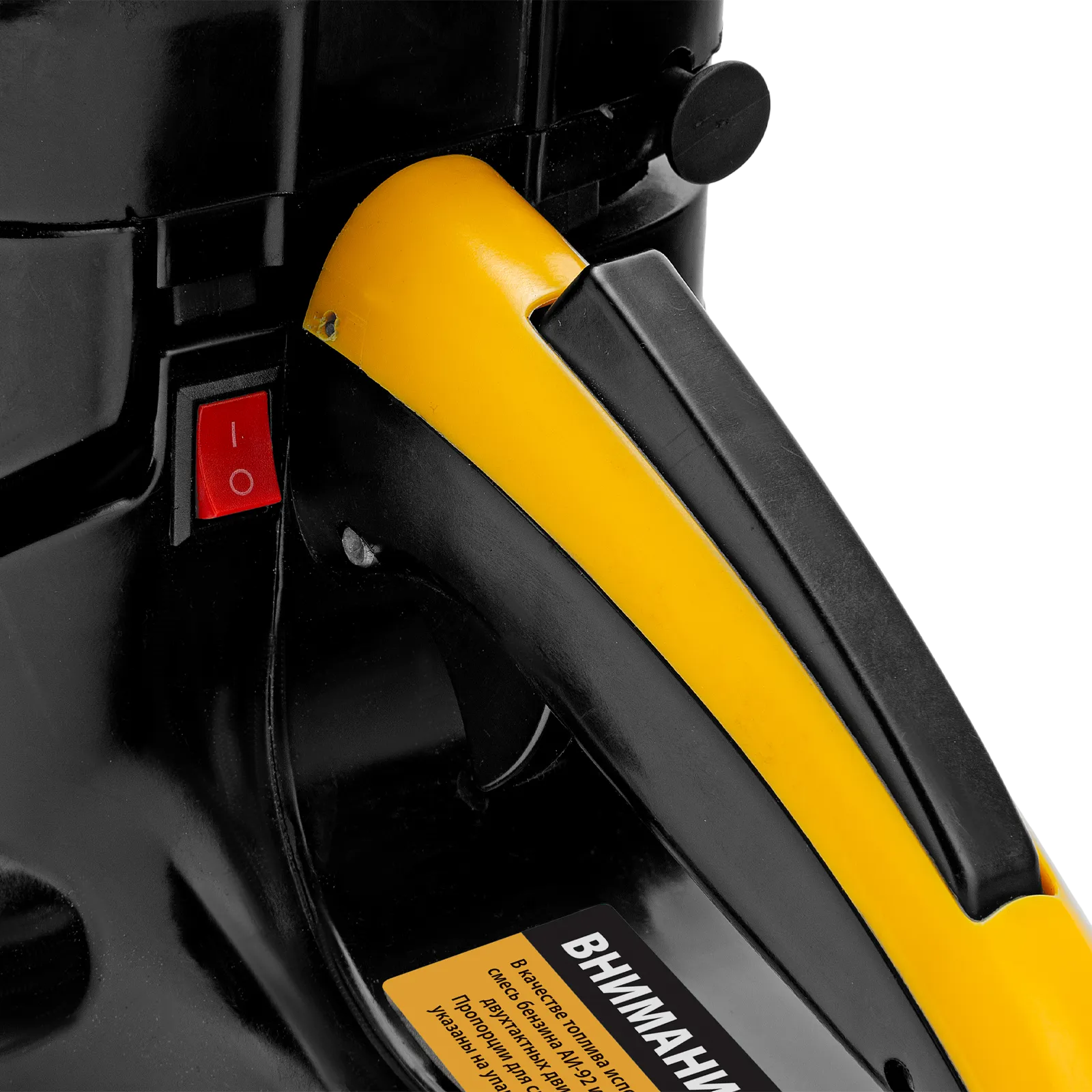 - Безопасность — режущий диск закрыт защитным кожухом, блокиратор курка газа исключает случайный запуск двигателя.