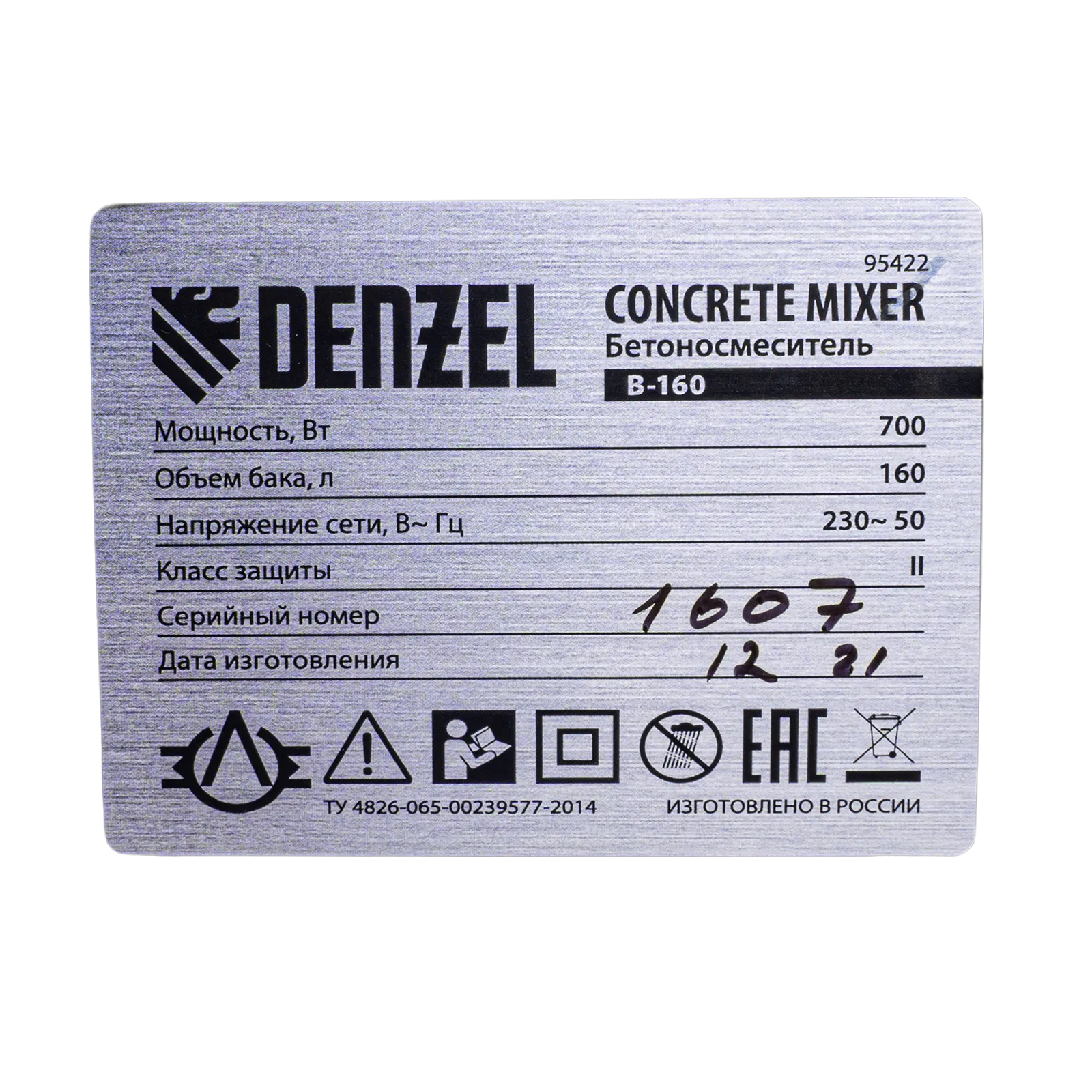 Бетоносмеситель Denzel B-160 95422 используется для приготовления раствора цемента, бетона или других смесей. Усиленная конструкция, оптимальное соотношение мощности двигателя 700 Вт и объема бака 160 л позволяют использовать устройство в режиме высокой нагрузки. Бетоносмеситель пригодится при проведении ремонтных работ и частном строительстве. Барабан объемом 160 л обеспечивает получение до 80 л готовой смеси (±10 %).