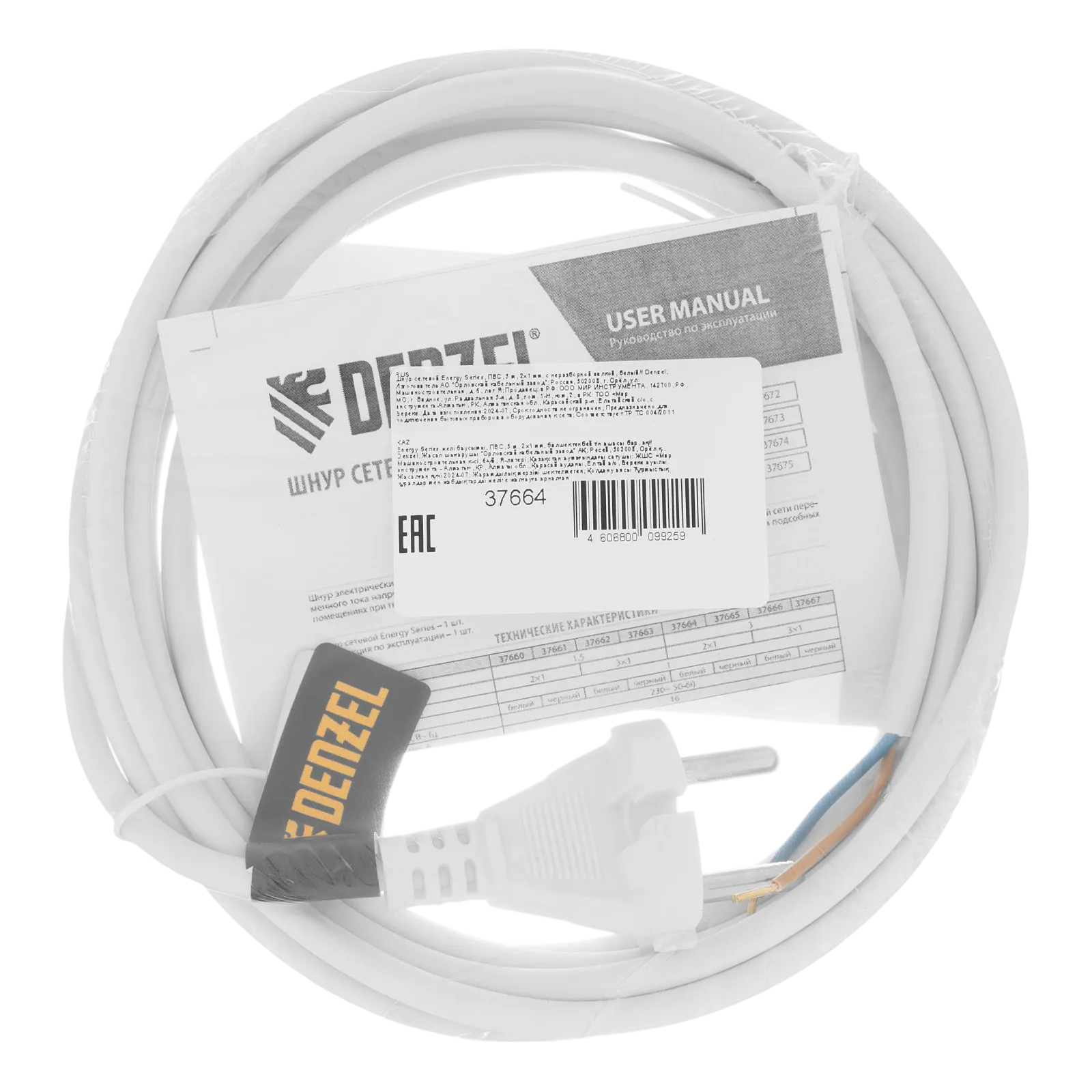 Белый сетевой шнур Denzel Energy Series 37664 с кабелем ПВС сечением 2 x 1 мм и длиной 3 м, с неразборной вилкой, предназначен для подключения к сети электроприборов мощностью до 3500 Вт. Для смотанного кабеля максимальная мощность потребителя составляет 1750 Вт. Шнур можно использовать для самостоятельного подключения прибора или замены вышедшего из строя провода. Сделано в России.