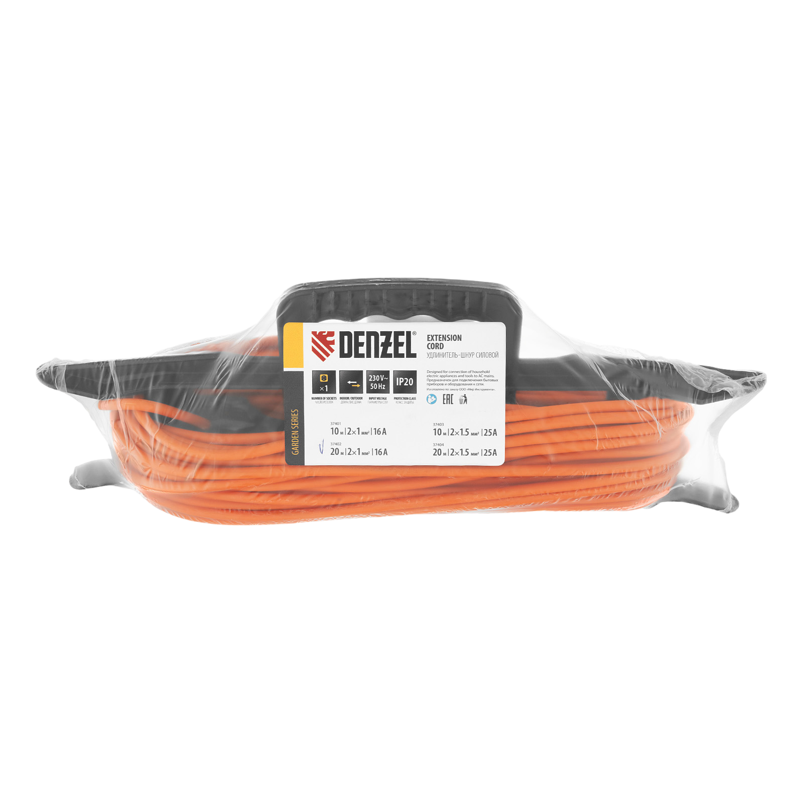 Силовой удлинитель-шнур Denzel Garden Series 37402 с кабелем ПВС сечением 2 x 1 мм и 1 розеткой без заземления, позволяет подключать приборы к электросети на расстоянии до 20 м от стационарного источника питания. Максимальная мощность потребителя составляет 3500 Вт при полностью размотанном кабеле и 1750 Вт — при смотанном. Удлинитель может использоваться при температуре от +5 до +35 °C. Пригодится дома, на даче, в гараже.