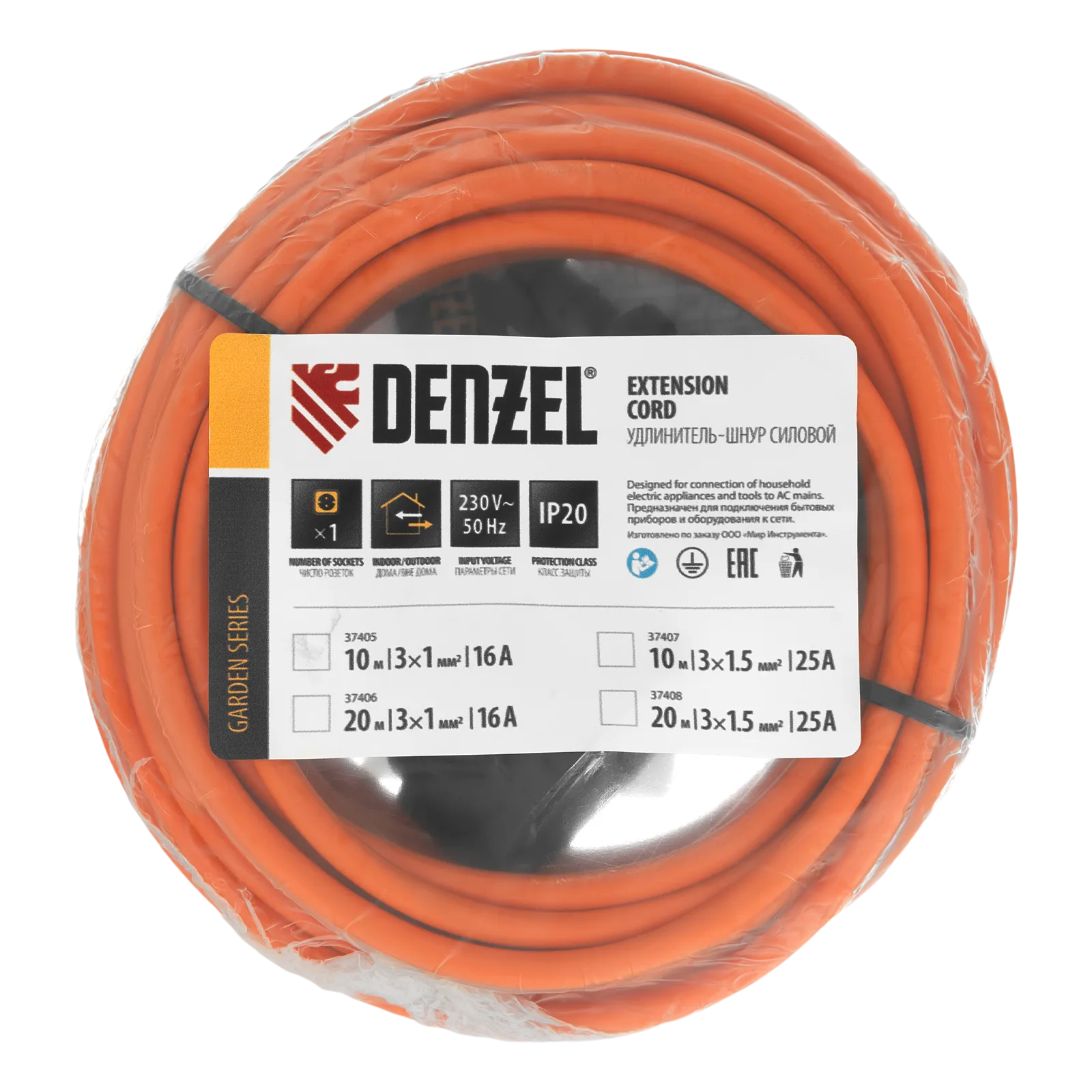 Силовой удлинитель-шнур Denzel Garden Series 37405 с кабелем ПВС сечением 3 x 1 мм и 1 розеткой, позволяет подключать приборы к электросети на расстоянии до 10 м от стационарного источника питания. Максимальная мощность потребителя составляет 3500 Вт при полностью размотанном кабеле и 1750 Вт — при смотанном. Удлинитель может использоваться при температуре от +5 до +35 °C. Пригодится дома, на даче, в гараже.