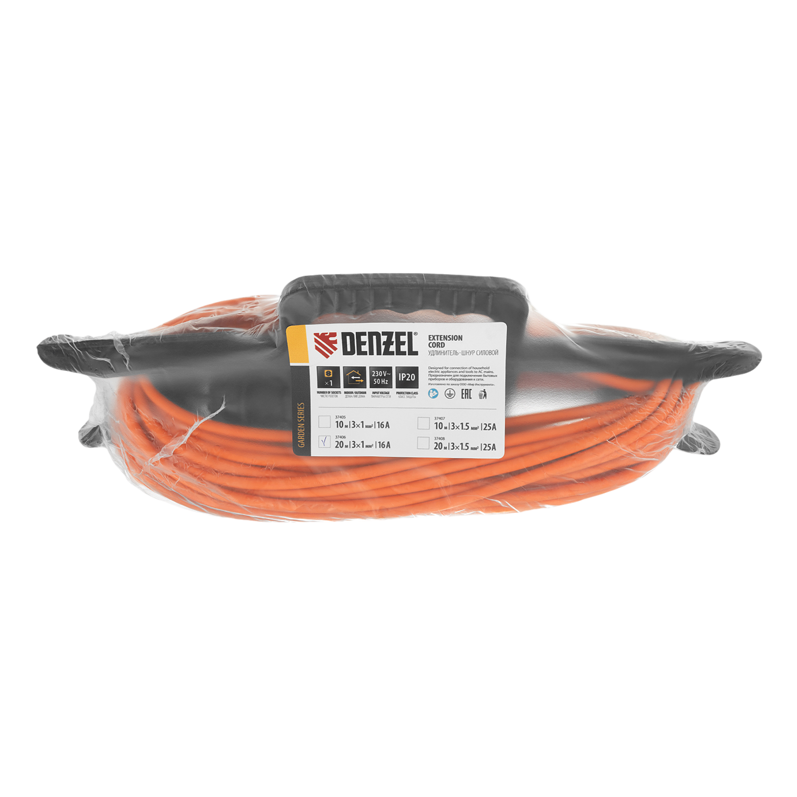 Силовой удлинитель-шнур Denzel Garden Series 37406 с кабелем ПВС сечением 3 x 1 мм и 1 розеткой, позволяет подключать приборы к электросети на расстоянии до 20 м от стационарного источника питания. Максимальная мощность потребителя составляет 3500 Вт при полностью размотанном кабеле и 1750 Вт — при смотанном. Удлинитель может использоваться при температуре от +5 до +35 °C. Пригодится дома, на даче, в гараже.