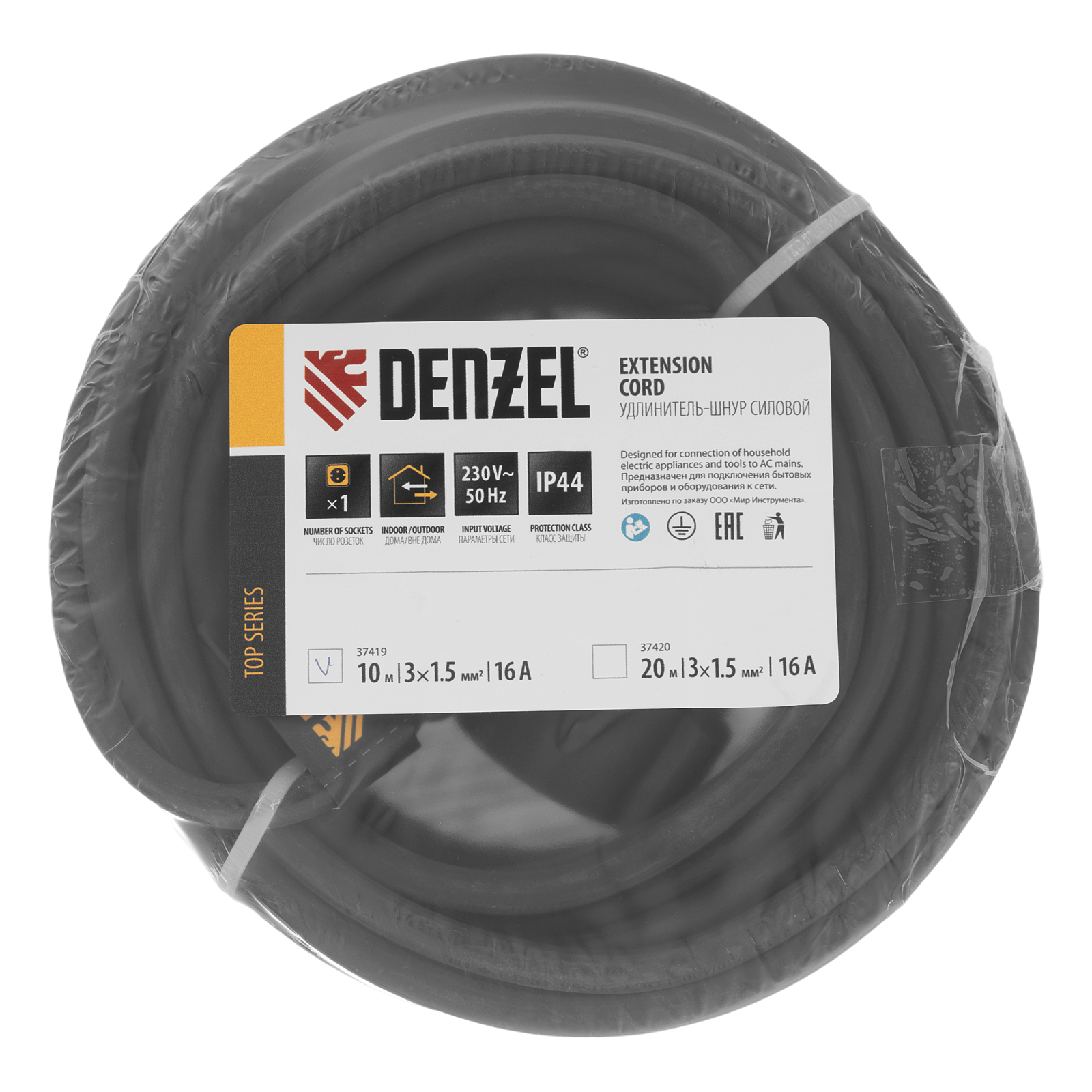 Силовой удлинитель-шнур Denzel Top Series 37419 с 1 розеткой, с кабелем КГТТ сечением 3 x 1,5 мм и длиной 10 м, предназначен для подключения электроприборов на удалении от розетки. Максимальная мощность потребителя составляет 3680 Вт для полностью размотанного кабеля и 1840 Вт — для смотанного. Удлинитель подходит для подключения электроинструмента, будет полезен на строительной площадке и в быту.