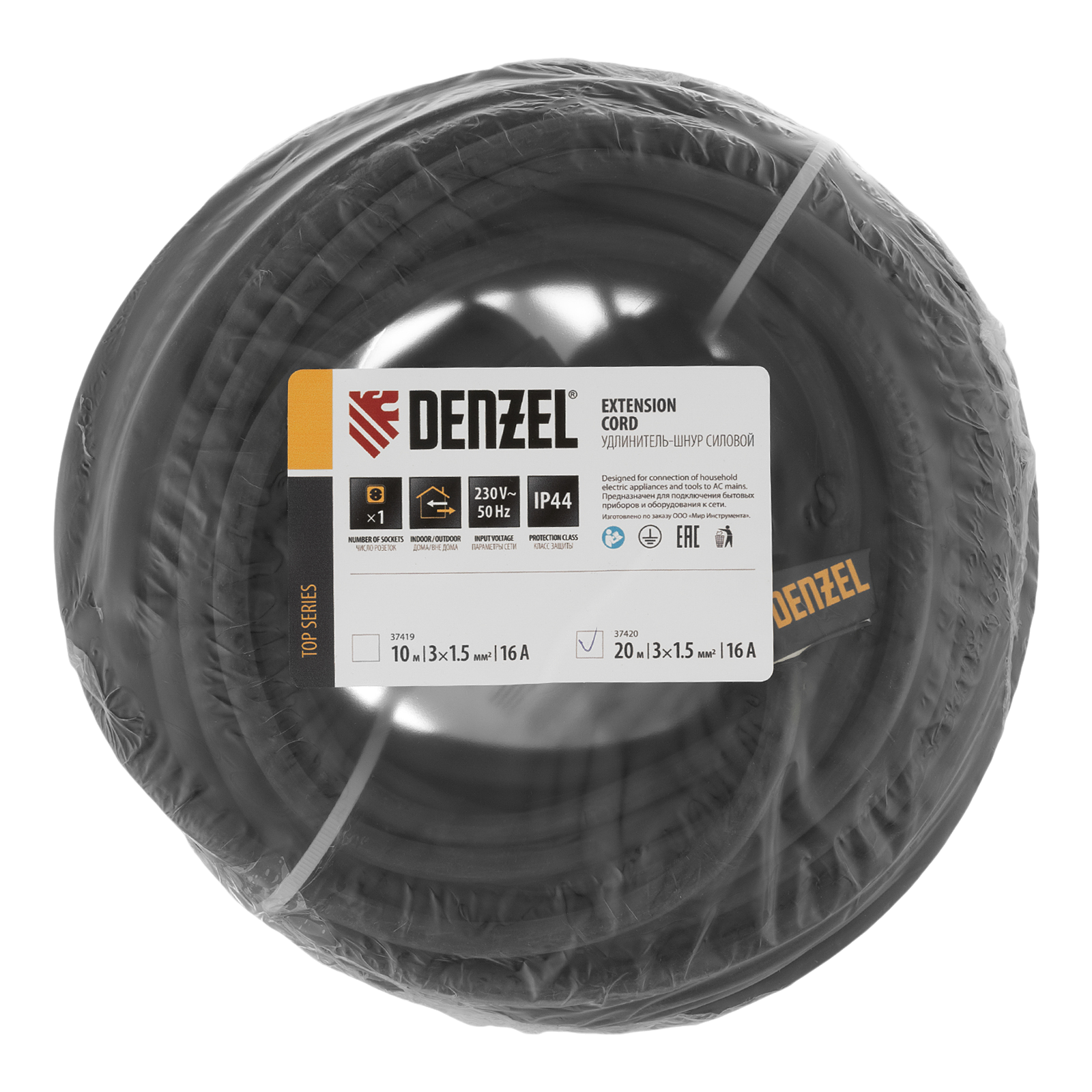 Силовой удлинитель-шнур Denzel Top Series 37420 с 1 розеткой, с кабелем КГТТ сечением 3 x 1,5 мм и длиной 20 м, предназначен для подключения электроприборов на удалении от розетки. Максимальная мощность потребителя составляет 3680 Вт для полностью размотанного кабеля и 1840 Вт — для смотанного. Удлинитель подходит для подключения электроинструмента, будет полезен на строительной площадке и в быту.