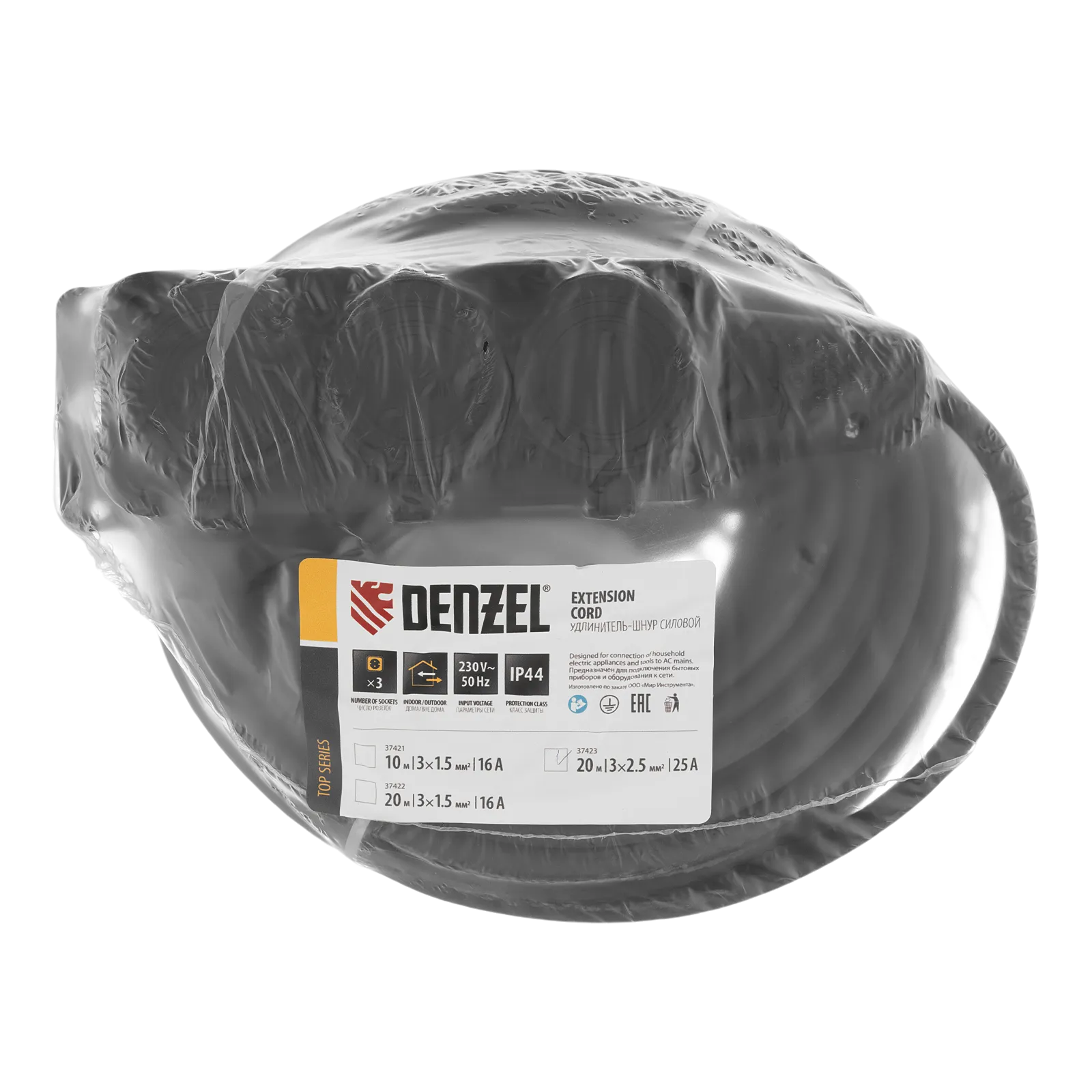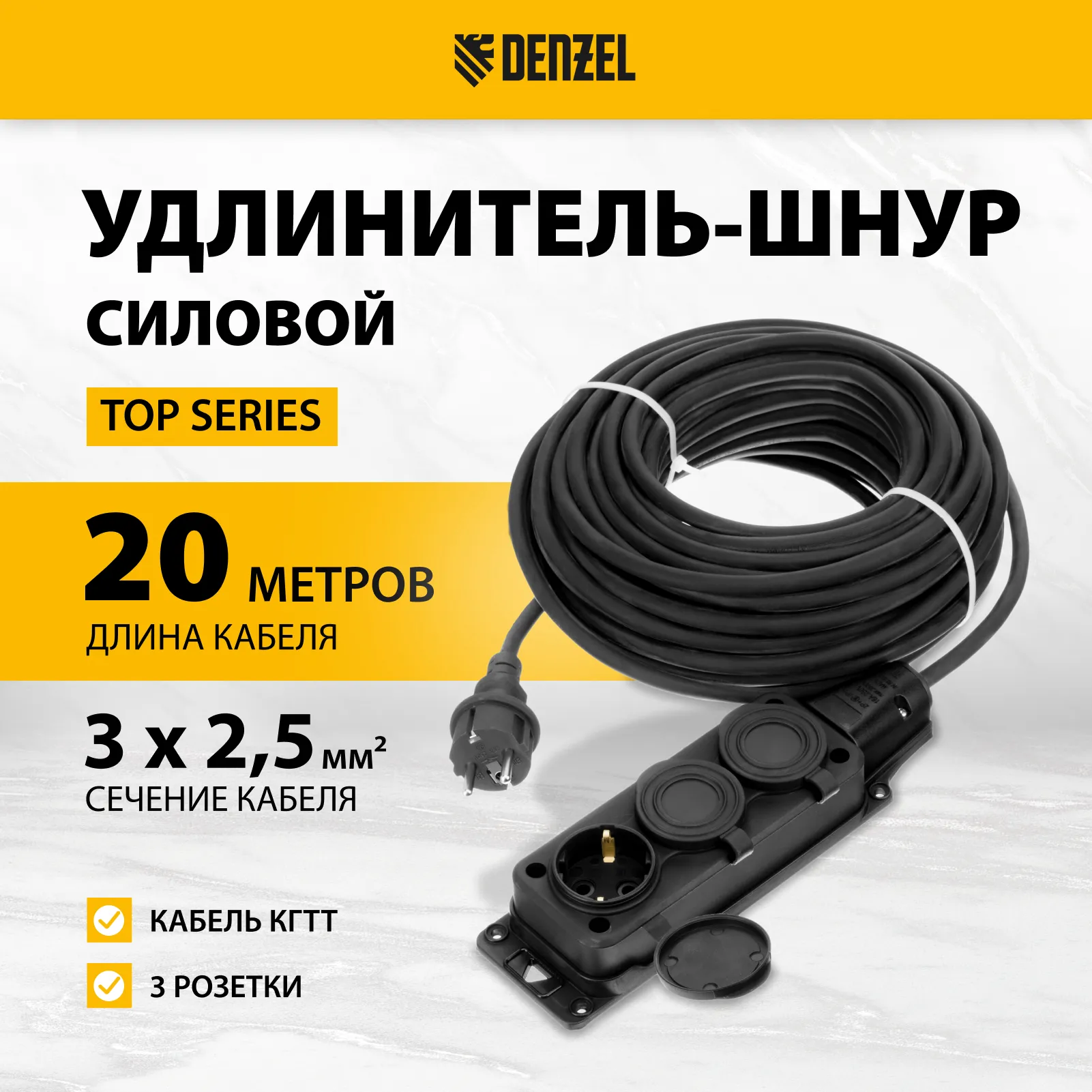 Силовой удлинитель-шнур Denzel Top Series 37423 с 3 розетками, с кабелем КГТТ сечением 3 x 2,5 мм и длиной 20 м, предназначен для подключения электроприборов на удалении от розетки. Суммарная мощность потребителей составляет 5500 Вт для полностью размотанного кабеля и 2750 Вт — для смотанного. Удлинитель подходит для подключения электроинструмента, будет полезен на строительной площадке и в быту.