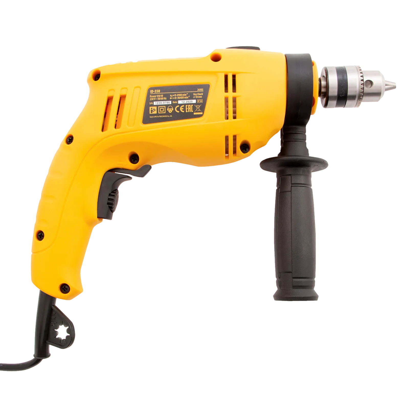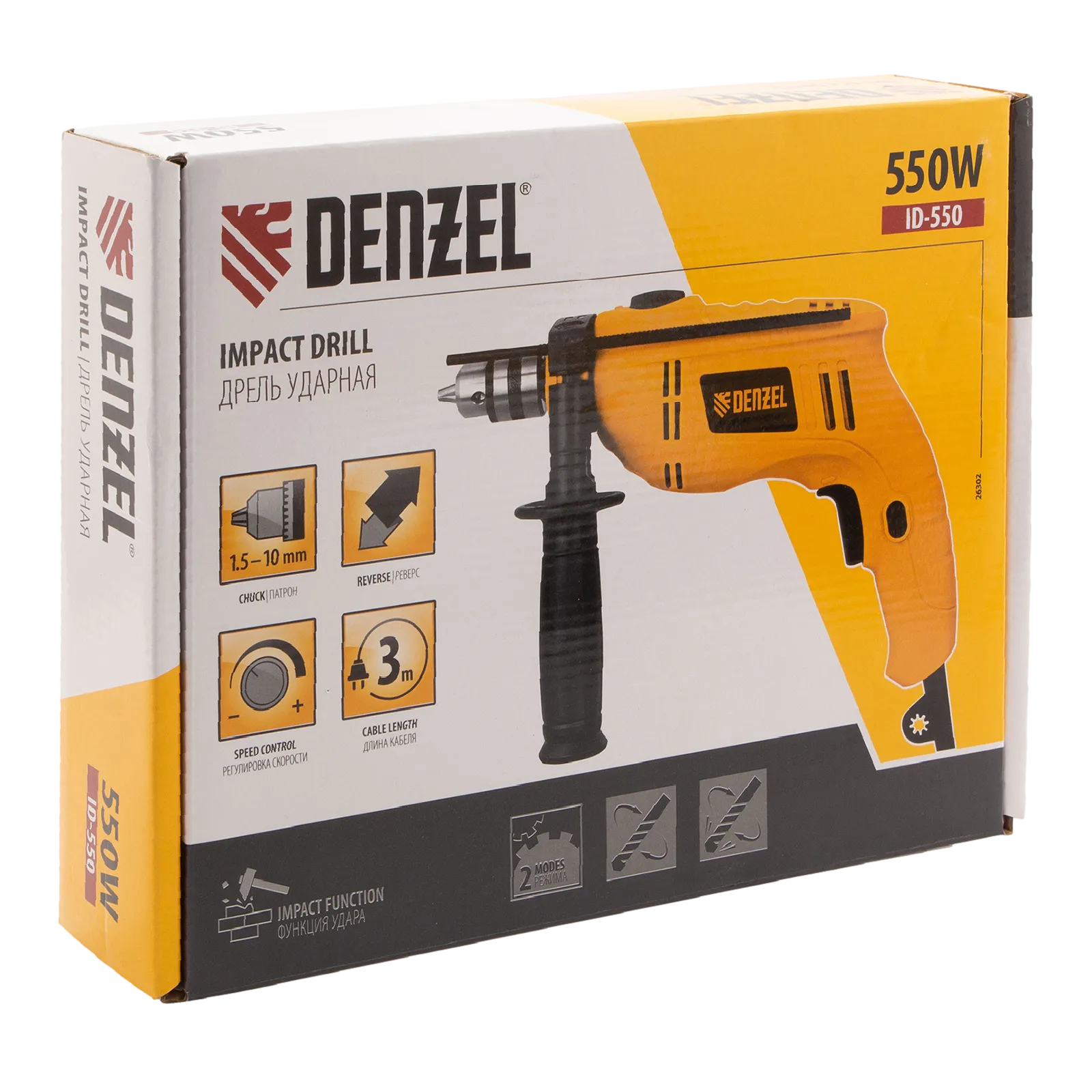 Ударная дрель Denzel ID-550 26302 мощностью 550 Вт поддерживает скорость вращения оснастки 0-2900 об/мин и частоту ударов 46400 уд/мин. Используется для ручного или ударного сверления металла, древесины, легкого бетона, кирпича, плитки или пластика. Сверлит отверстия диаметром до 20 мм в древесине, до 10 мм в бетоне и до 10 мм в металле. Эффективное сверление твердых материалов обеспечивает массивный промщит ударного механизма. Дрель работает со сверлами с диаметром хвостовика 1,5-10 мм, что позволяет эффективно решать различные задачи.