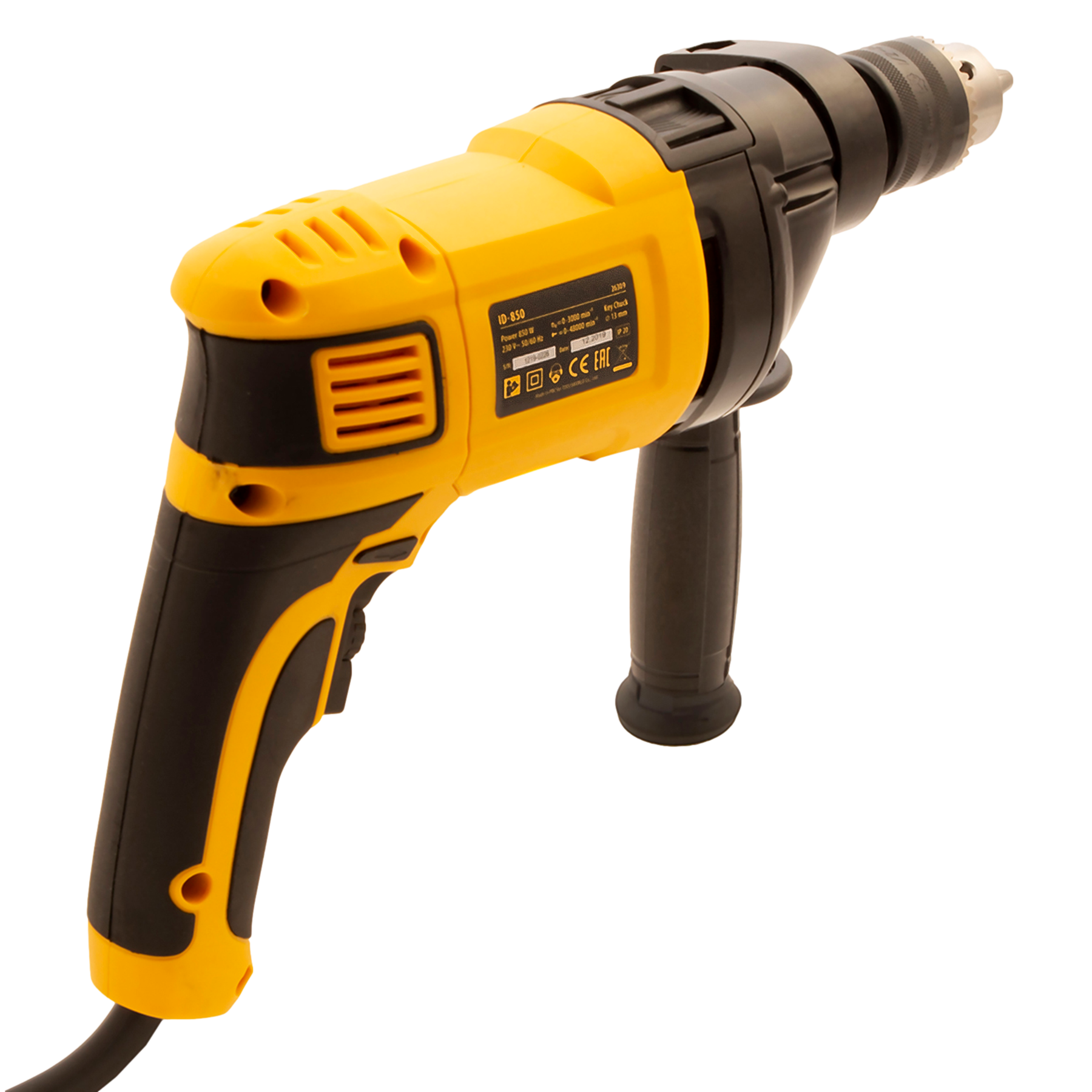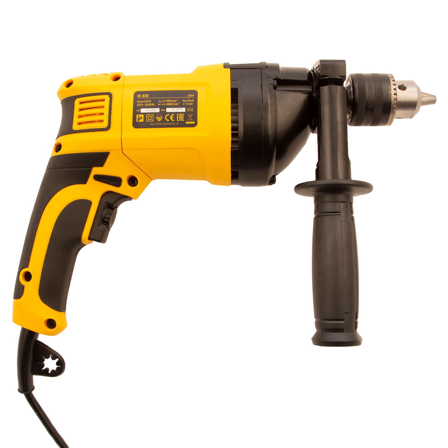 Ударная дрель Denzel ID-850 26309 мощностью 850 Вт поддерживает скорость вращения оснастки 0-3000 об/мин и частоту ударов 48000 уд/мин. Используется для ручного или ударного сверления металла, древесины, легкого бетона, кирпича, плитки или пластика. Сверлит отверстия диаметром до 25 мм в древесине, до 13 мм в бетоне и до 13 мм в металле. Эффективное сверление твердых материалов обеспечивает массивный промщит ударного механизма. Дрель работает со сверлами с диаметром хвостовика 1,5-13 мм, что позволяет эффективно решать различные задачи.