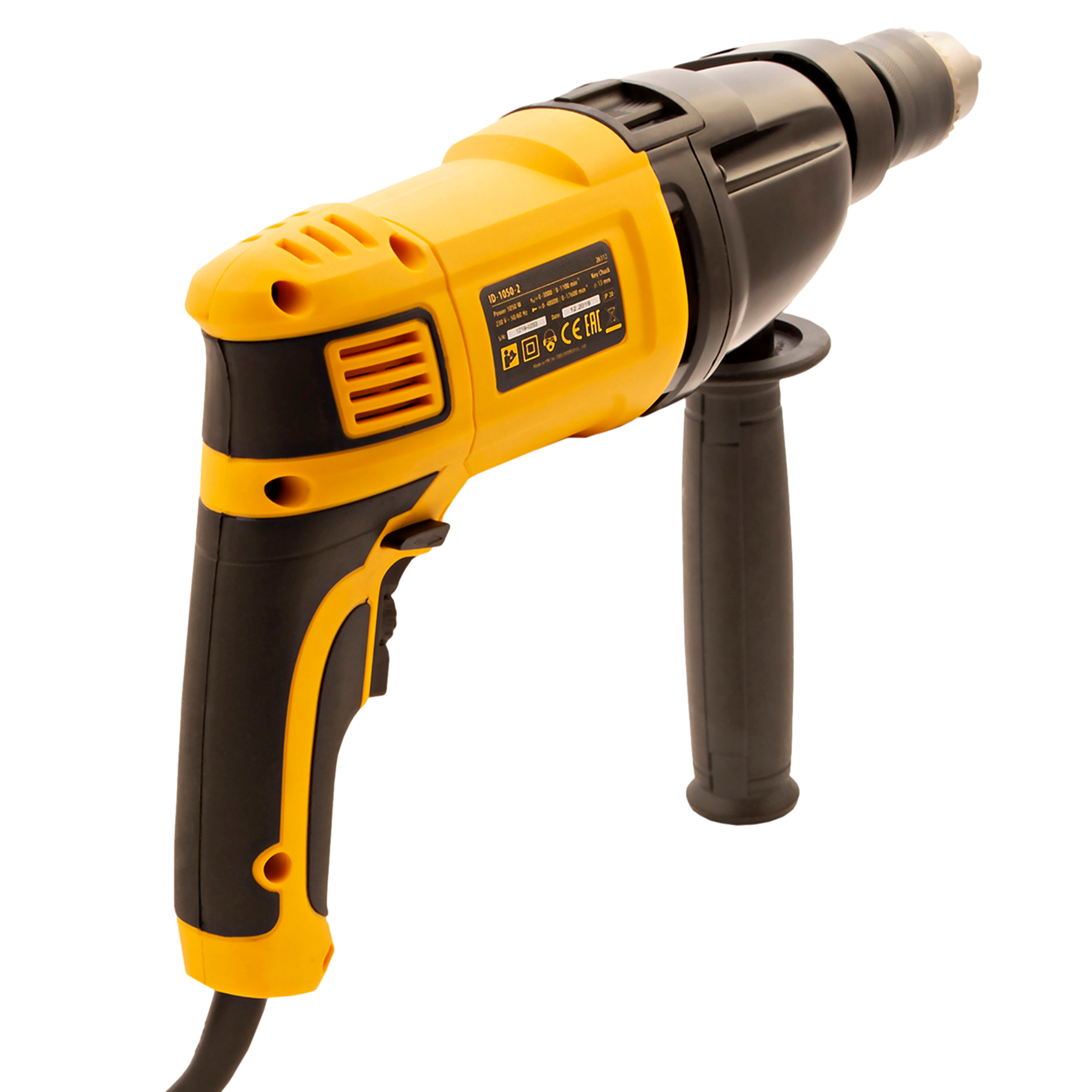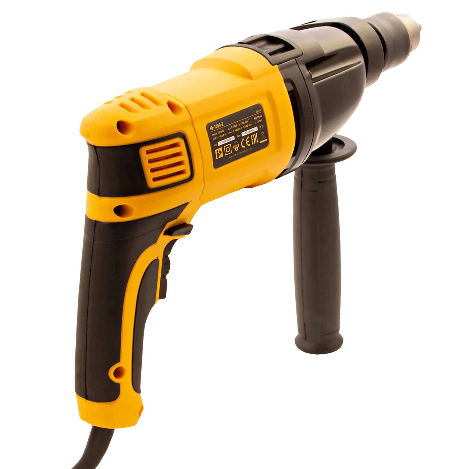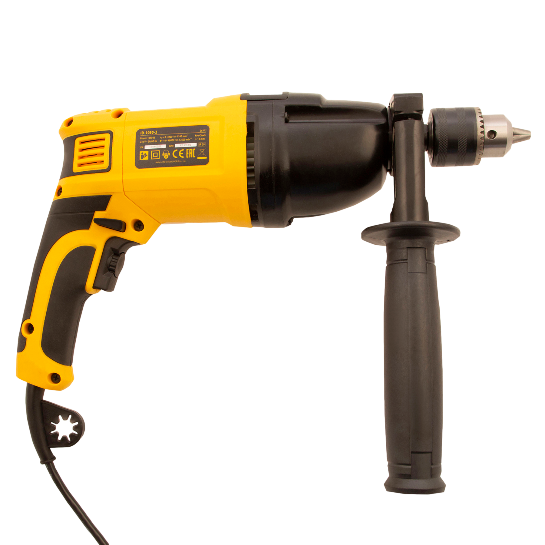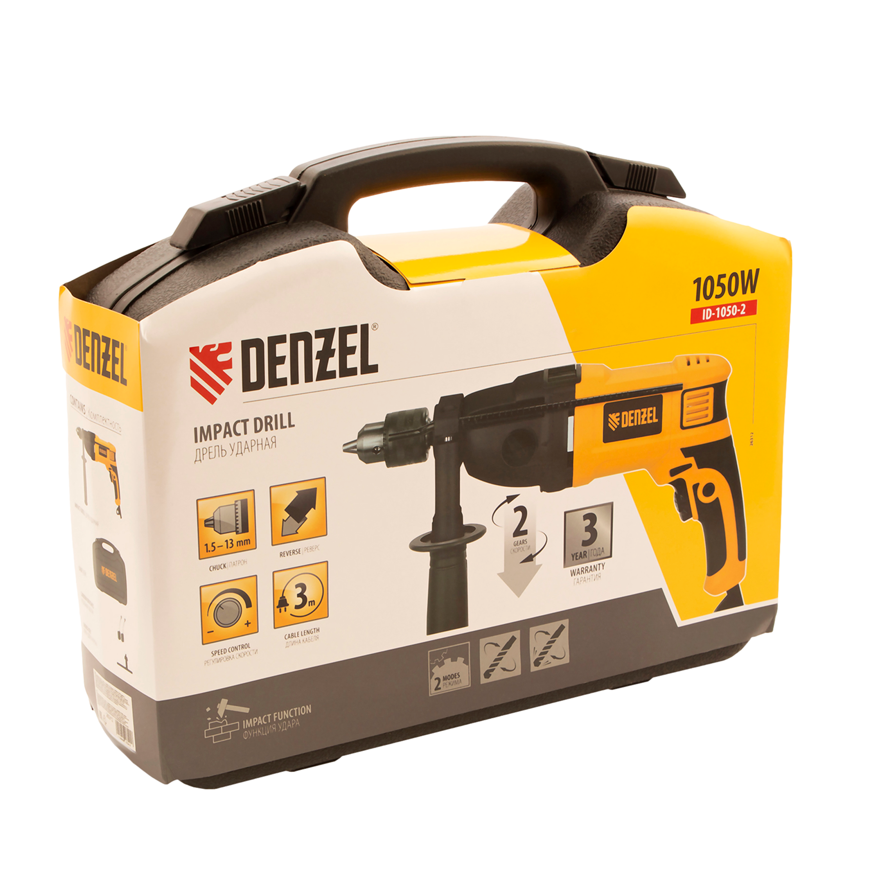 Ударная дрель Denzel ID-1050-2 26312 мощностью 1050 Вт, поддерживает 2 скорости вращения оснастки 0-3000/0-1100 об/мин и частоту ударов 0-48000/0-17600 уд/мин. Используется для ручного или ударного сверления металла, древесины, легкого бетона, кирпича, плитки или пластика. Сверлит отверстия диаметром до 25 мм в древесине, до 13 мм в бетоне и до 13 мм в металле. Эффективное сверление твердых материалов обеспечивает массивный промщит ударного механизма. Дрель работает со сверлами с диаметром хвостовика 1,5-13 мм, что позволяет эффективно решать различные задачи.