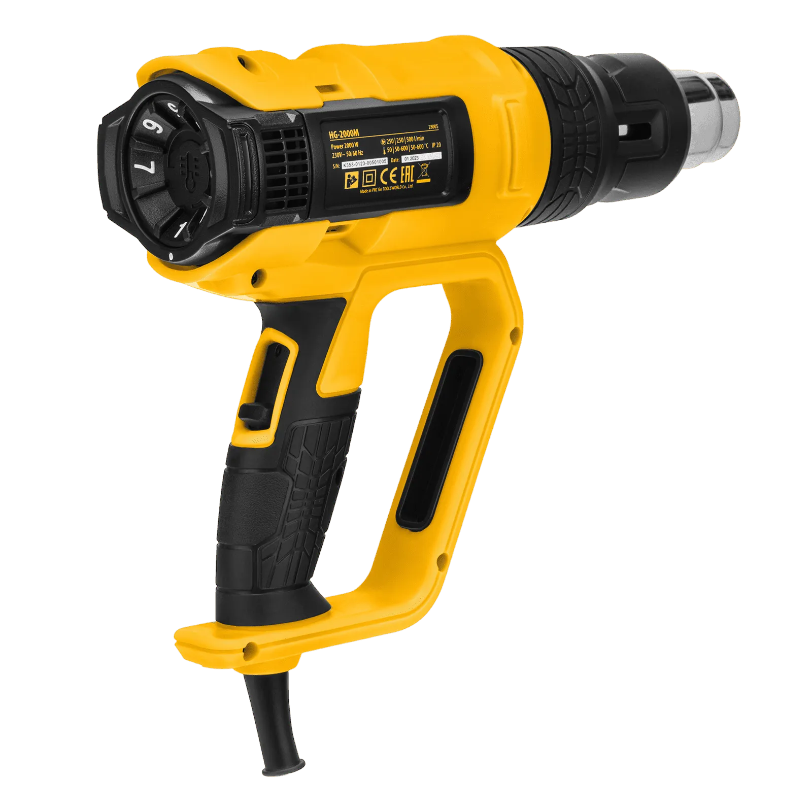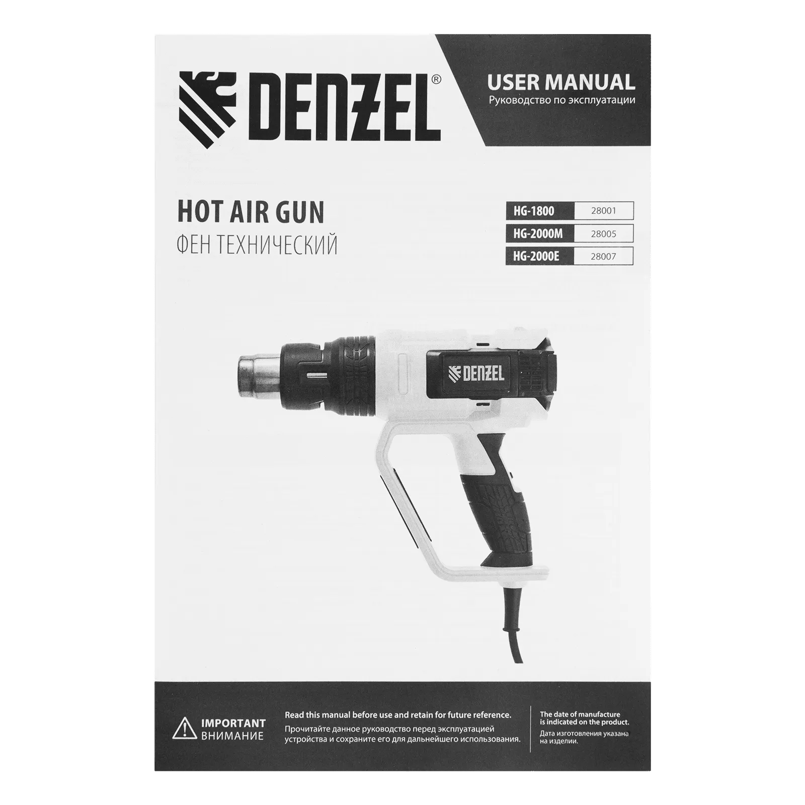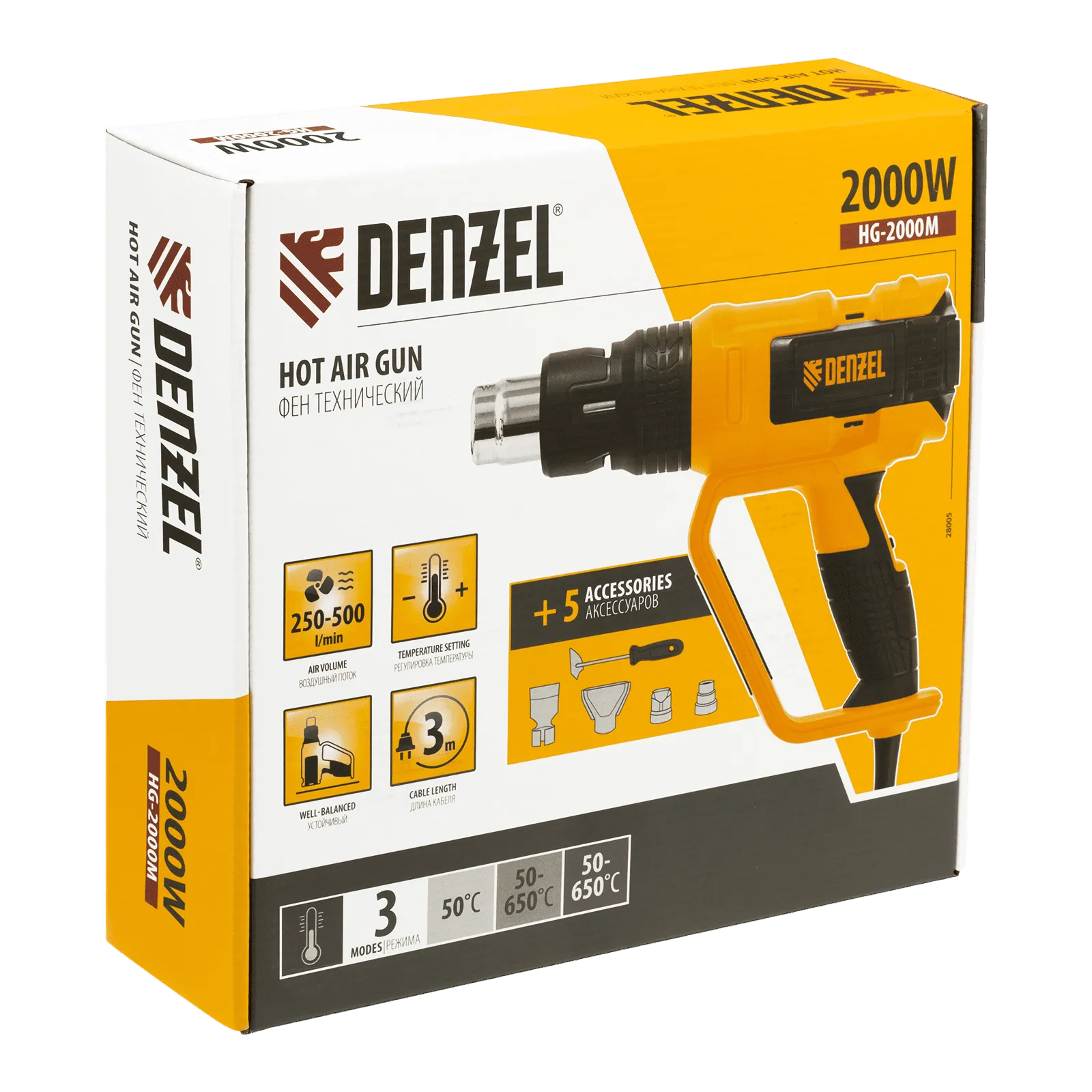 Фен технический Denzel HG-2000M 28005 мощностью 2000 Вт, с 3 режимами работы, подходит для снятия лака и краски с различных поверхностей, размораживания и пайки труб, создания изгиба в пластиковых деталях, генерации точечного теплового потока для нагрева небольших участков и др. Справиться с этими задачами помогает треугольный скребок и 4 насадки: плоская, полукруглая, отражающая и редукционная.;Мощность фена 2 кВт обеспечивает стабильную производительность на уровне 250/500 л/мин, в зависимости от выбранного режима. Температура выходящего потока составляет 50/50-450/50-600 ℃.