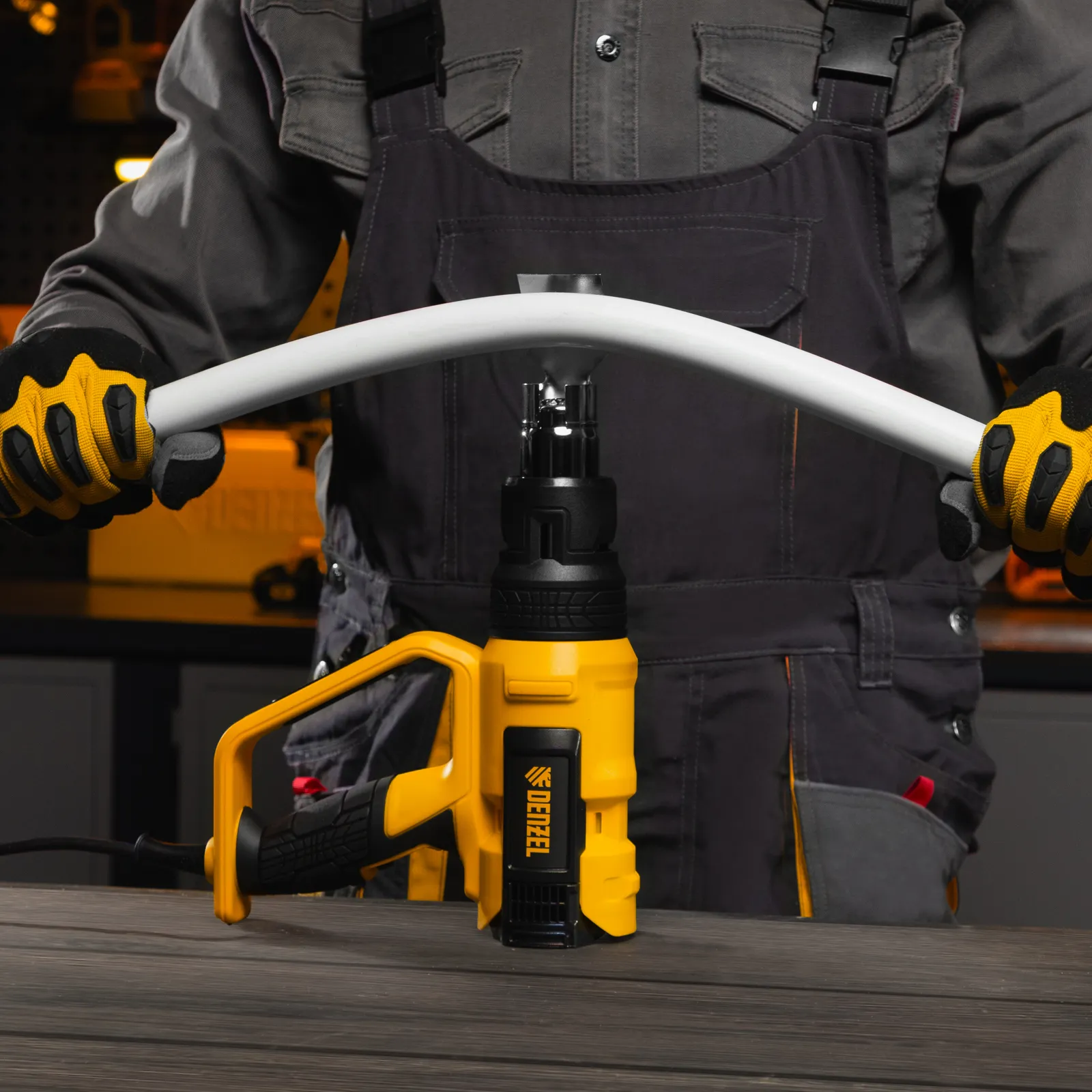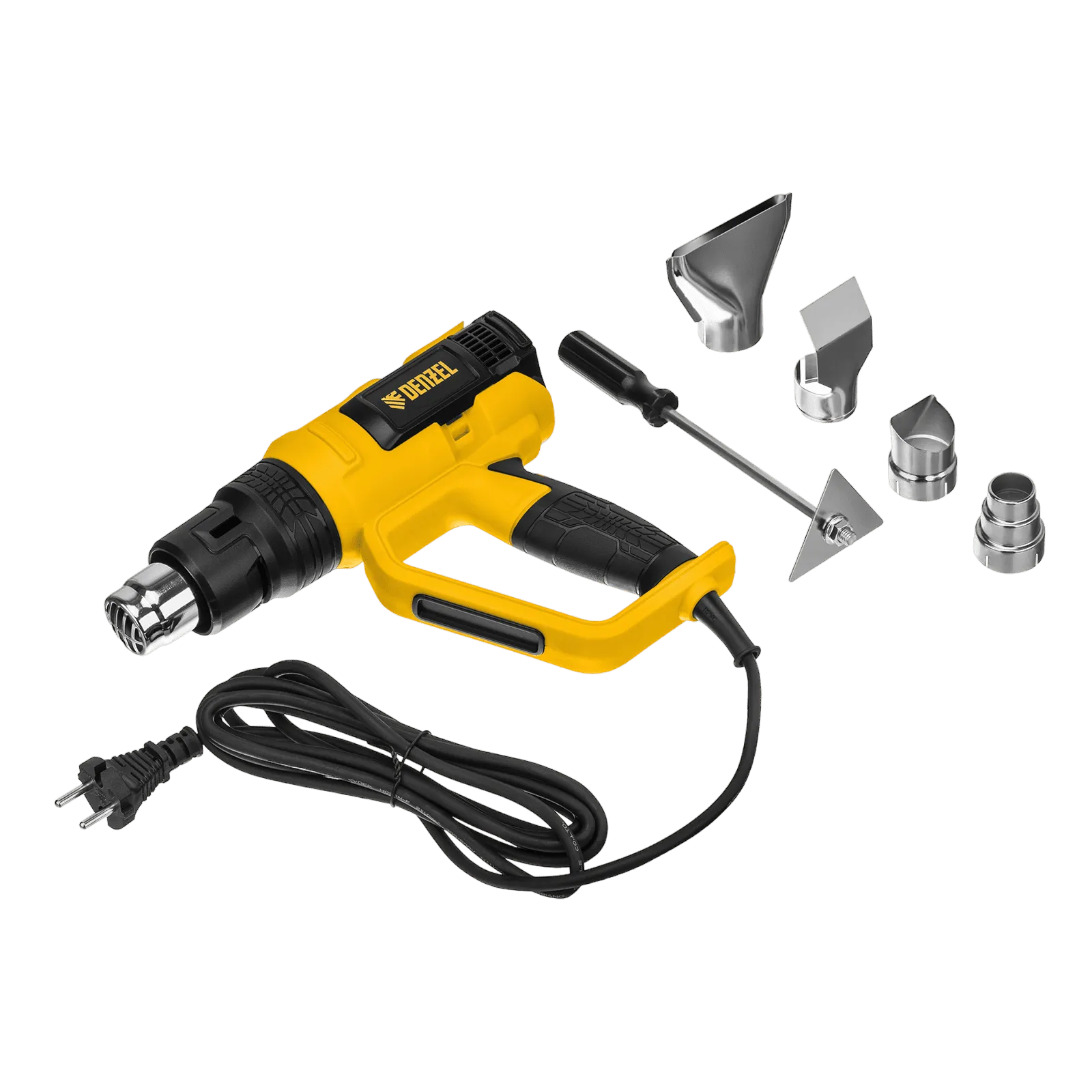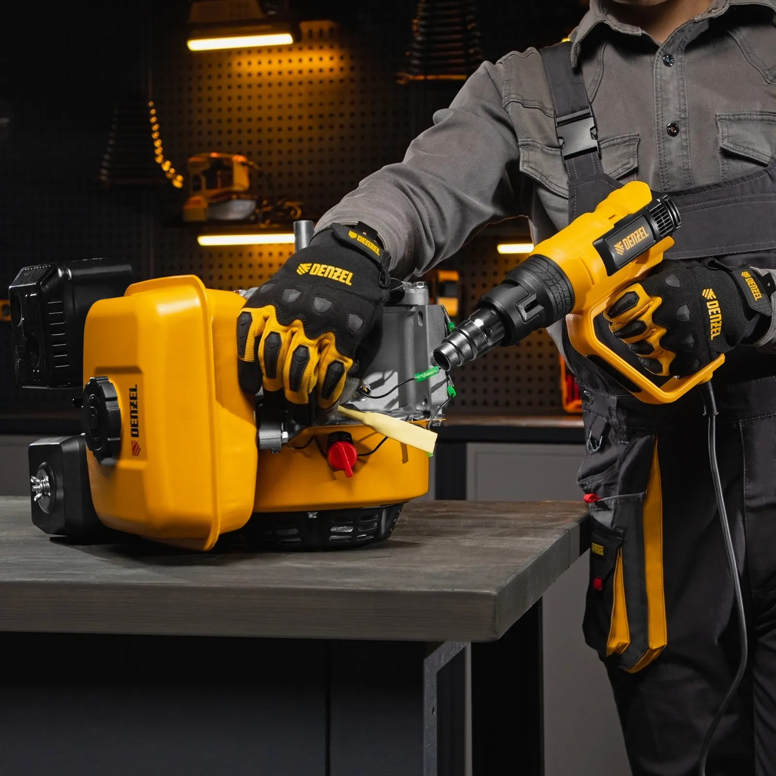 Фен технический Denzel HG-2000M 28005 мощностью 2000 Вт, с 3 режимами работы, подходит для снятия лака и краски с различных поверхностей, размораживания и пайки труб, создания изгиба в пластиковых деталях, генерации точечного теплового потока для нагрева небольших участков и др. Справиться с этими задачами помогает треугольный скребок и 4 насадки: плоская, полукруглая, отражающая и редукционная.;Мощность фена 2 кВт обеспечивает стабильную производительность на уровне 250/500 л/мин, в зависимости от выбранного режима. Температура выходящего потока составляет 50/50-450/50-600 ℃.