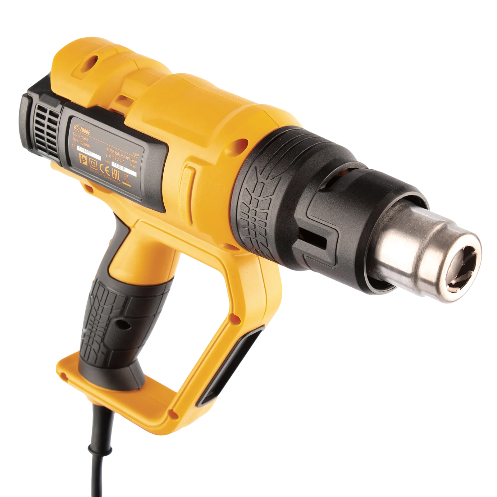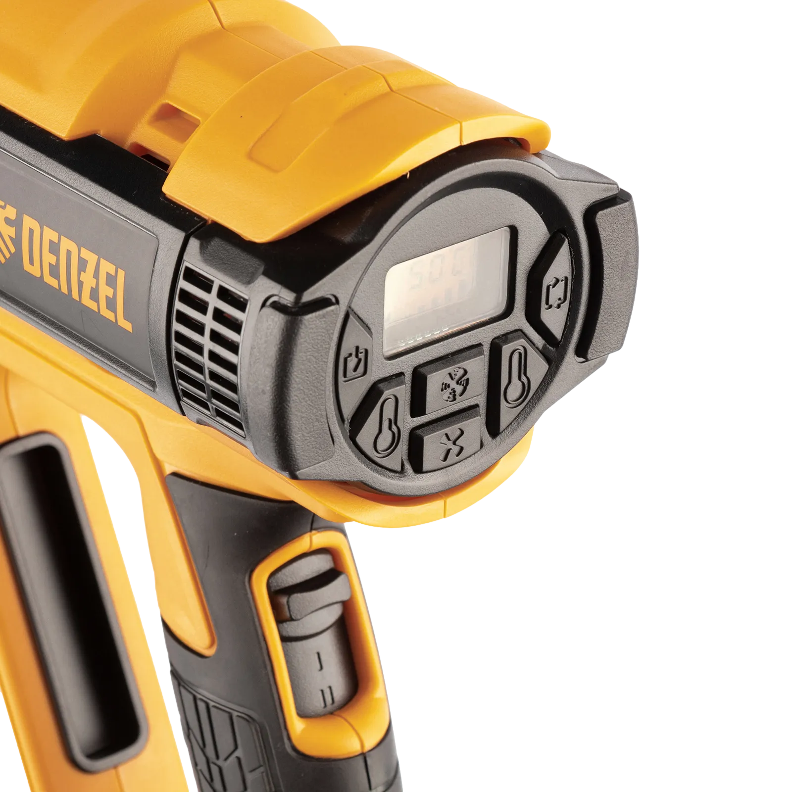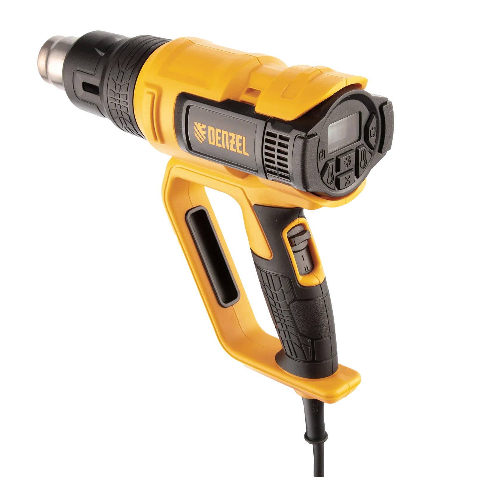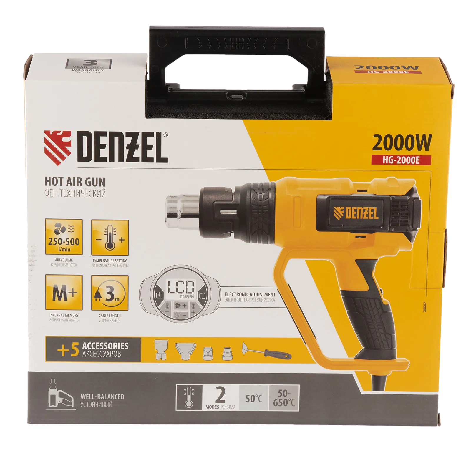 Профессиональный технический фен Denzel HG-2000E 28007 мощностью 2000 Вт, с 2 режимами и LCD дисплеем, предназначен для нагрева и сушки различных соединений и поверхностей. Применяется при снятии лакокрасочных покрытий, удалении старого линолеума и плитки, пайке металла и сварке пластика, разморозке труб, а также в процессе других задач в быту и на строительных объектах.;Высокая мощность двигателя 2 кВт обеспечивает производительность 250-500 л/мин. Максимальная рабочая температура составляет 650 ℃. Надежный и долговечный нагревательный элемент с керамическим каркасом устойчив к продолжительной эксплуатации.