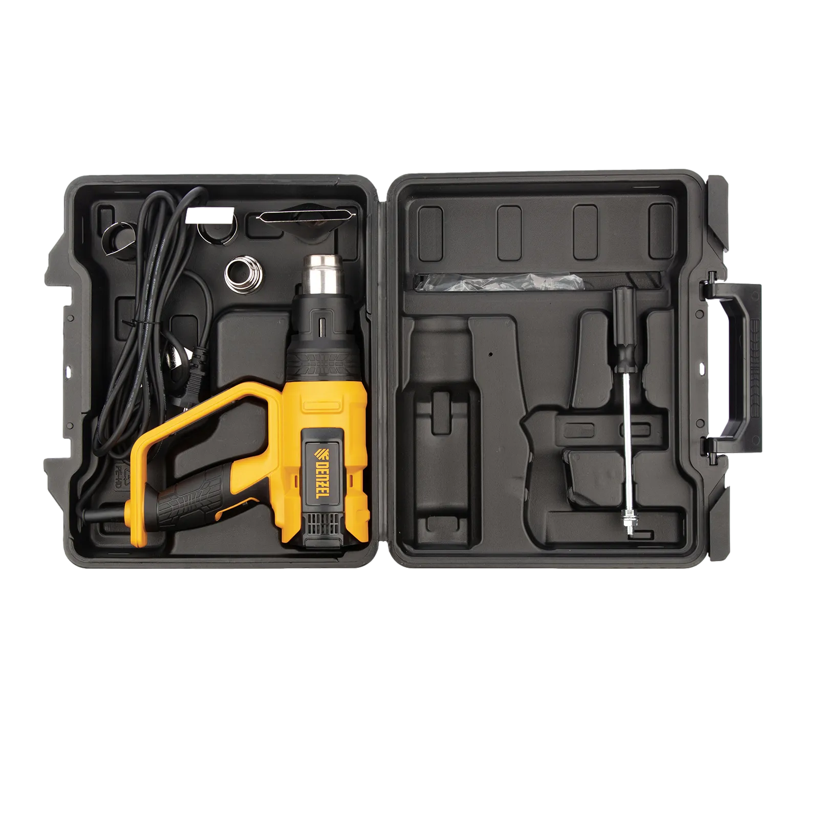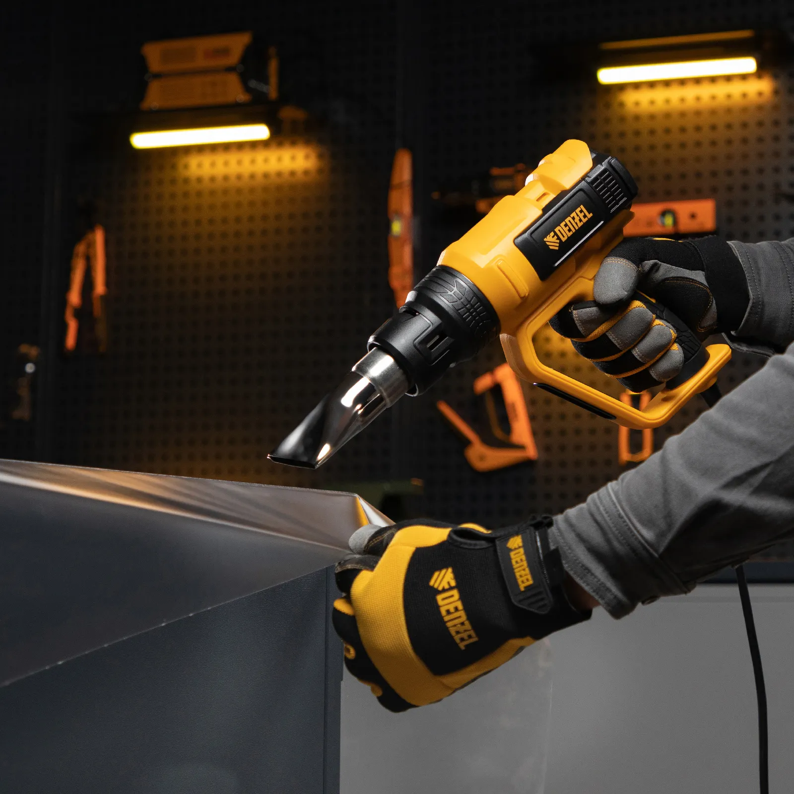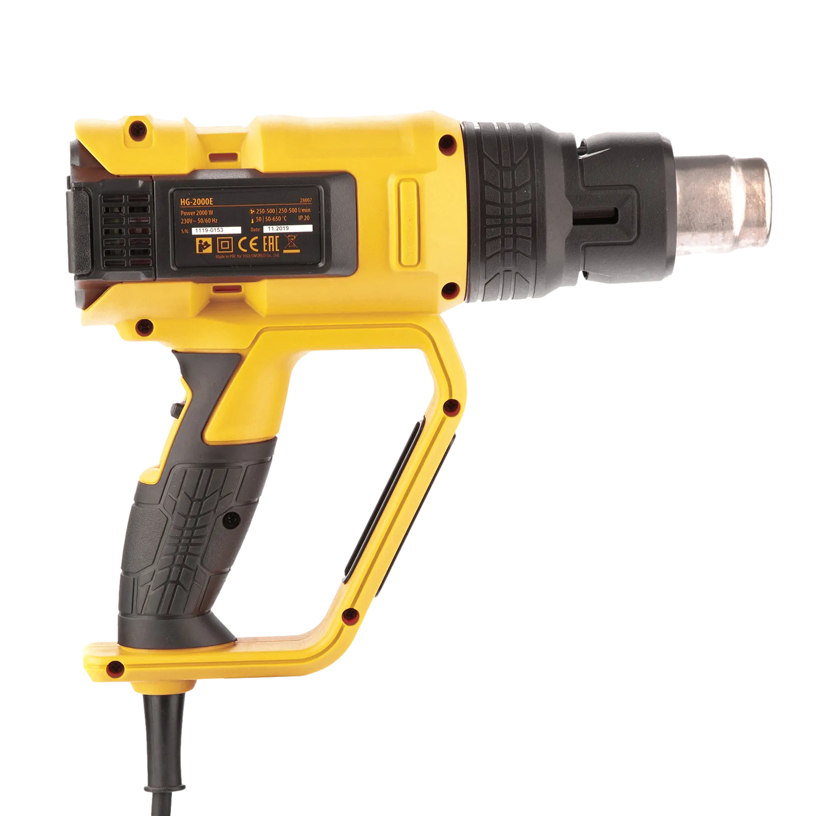 Профессиональный технический фен Denzel HG-2000E 28007 мощностью 2000 Вт, с 2 режимами и LCD дисплеем, предназначен для нагрева и сушки различных соединений и поверхностей. Применяется при снятии лакокрасочных покрытий, удалении старого линолеума и плитки, пайке металла и сварке пластика, разморозке труб, а также в процессе других задач в быту и на строительных объектах.;Высокая мощность двигателя 2 кВт обеспечивает производительность 250-500 л/мин. Максимальная рабочая температура составляет 650 ℃. Надежный и долговечный нагревательный элемент с керамическим каркасом устойчив к продолжительной эксплуатации.